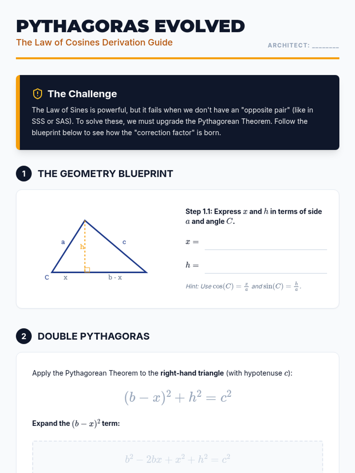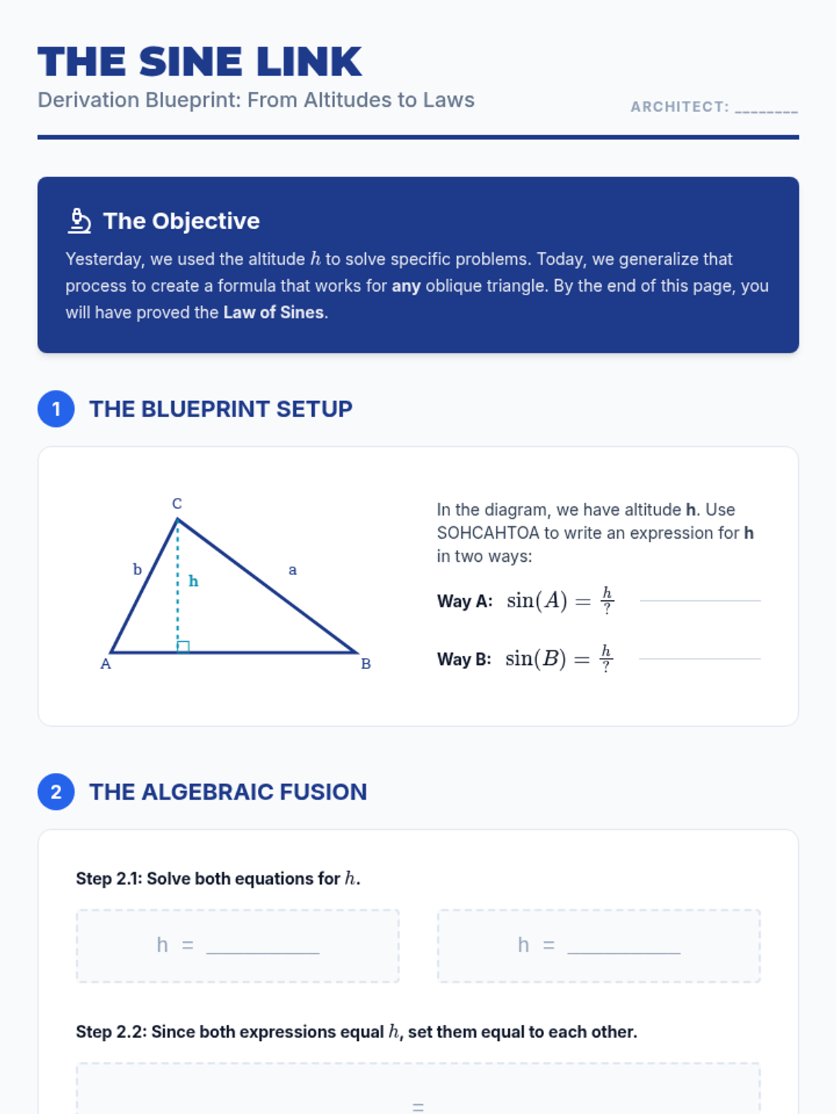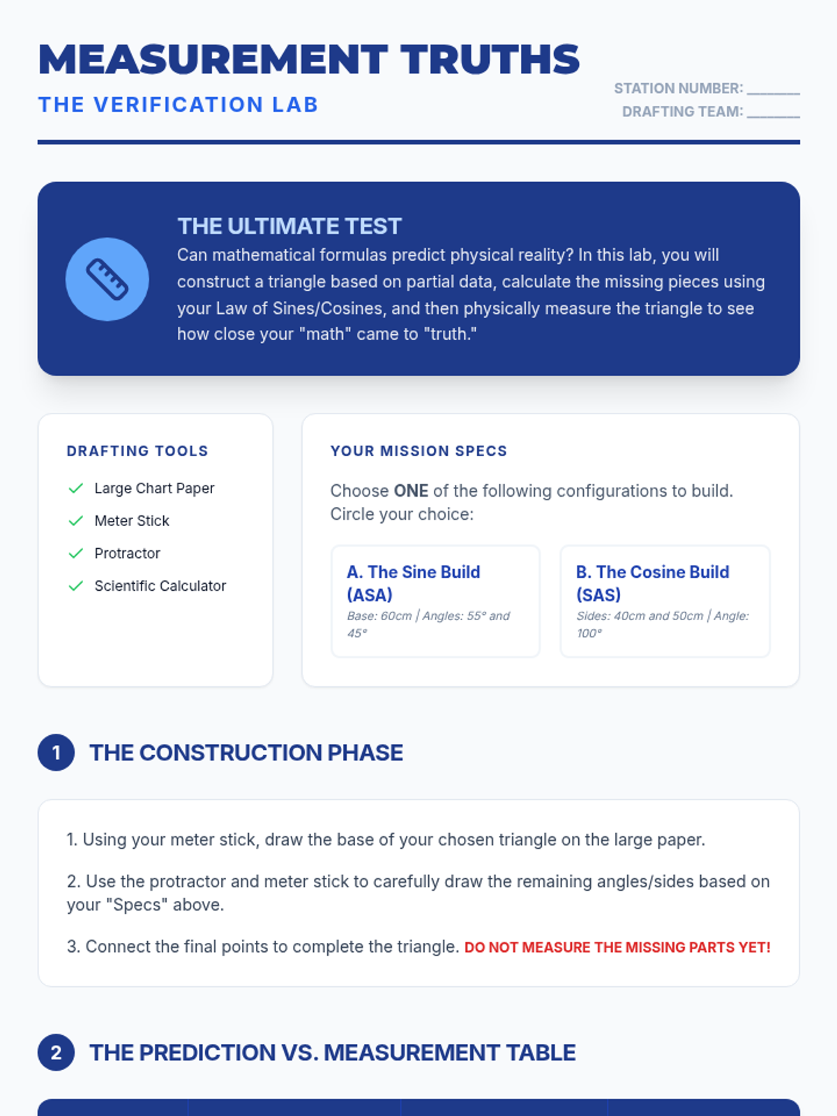 A 5-lesson geometry sequence where students move from right-triangle trigonometry to general triangles. They derive the Law of Sines and Law of Cosines through inquiry and verify their accuracy via a hands-on measurement lab.
