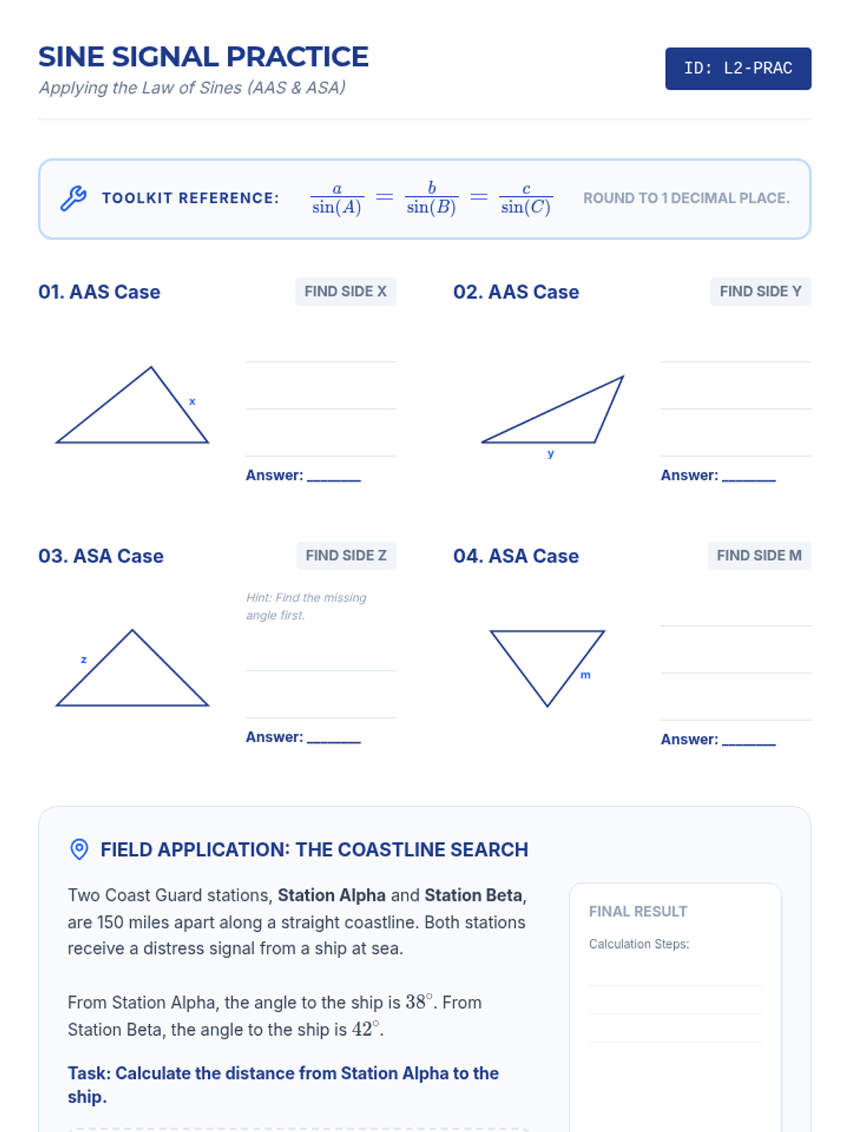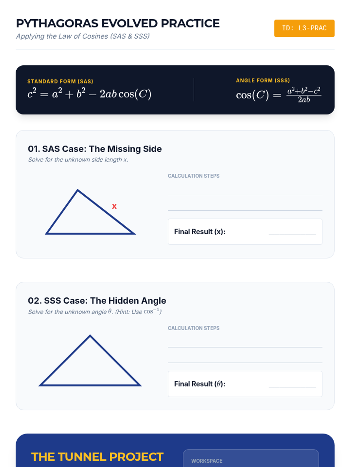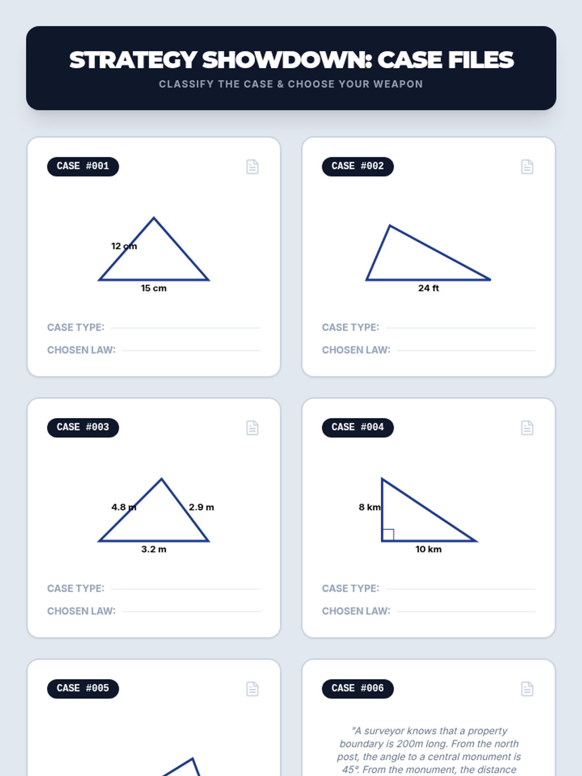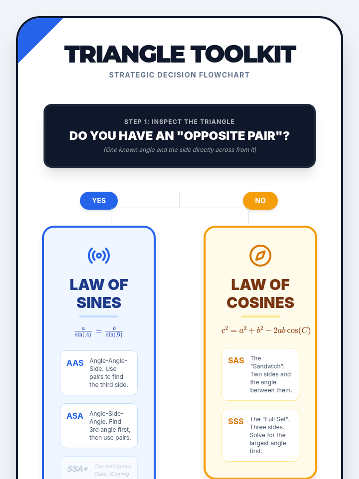 A 5-lesson geometry sequence where students move from right-triangle trigonometry to general triangles. They derive the Law of Sines and Law of Cosines through inquiry and verify their accuracy via a hands-on measurement lab.