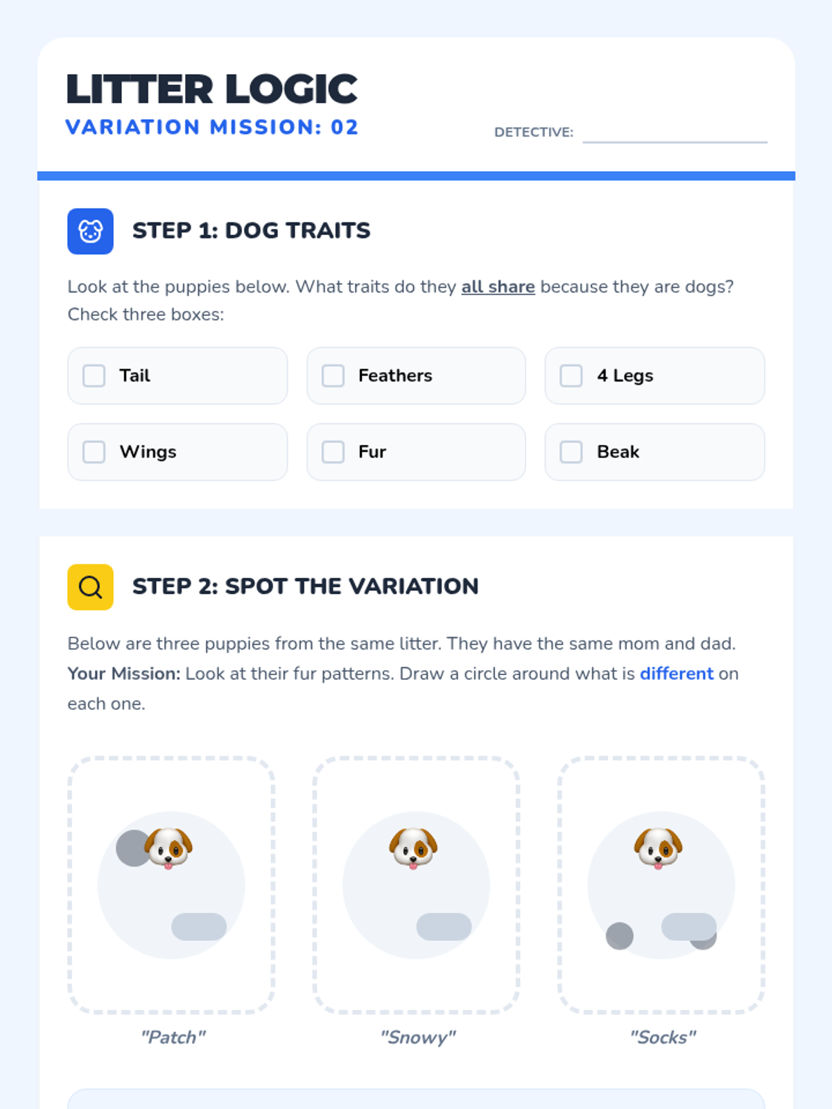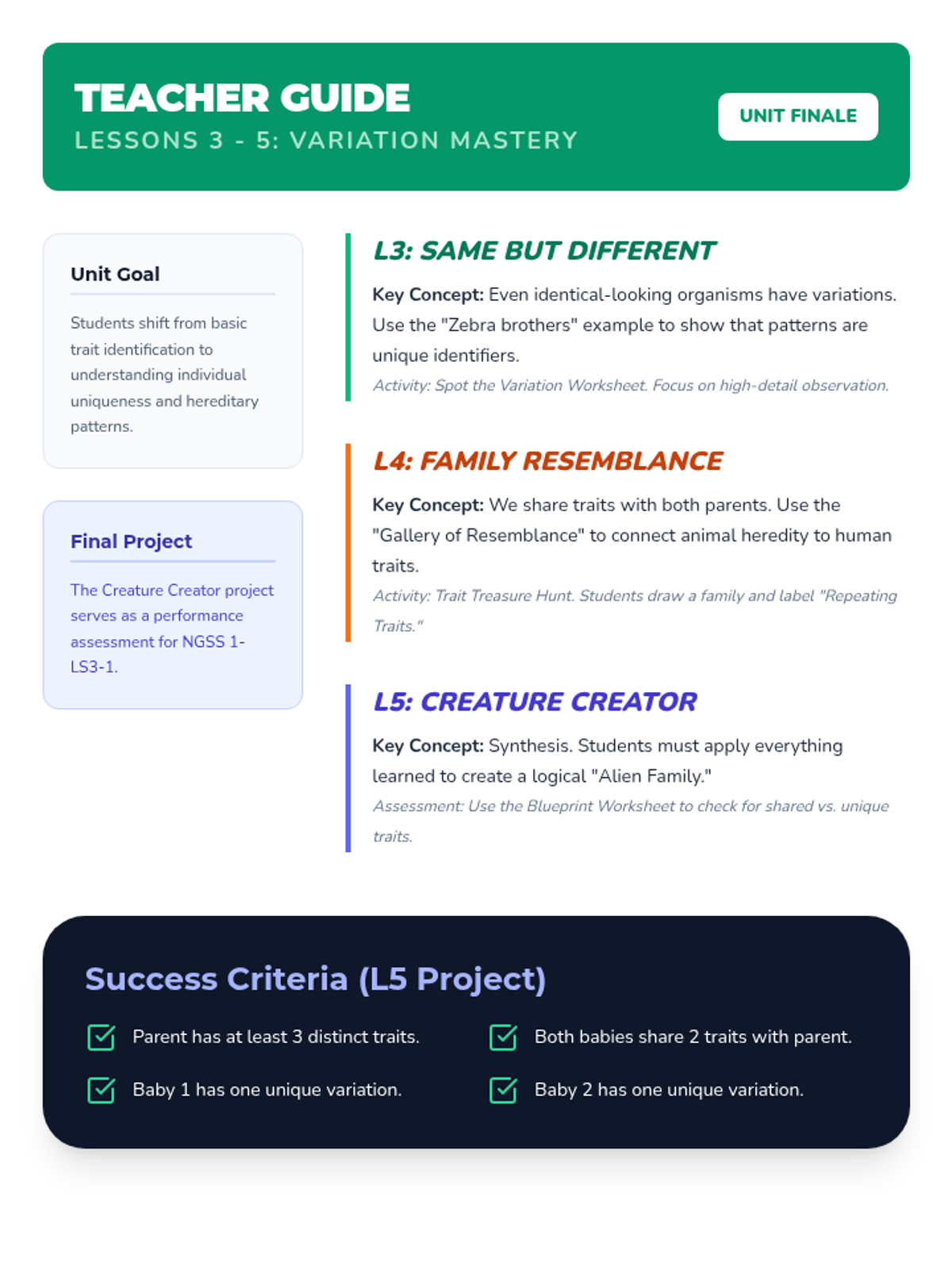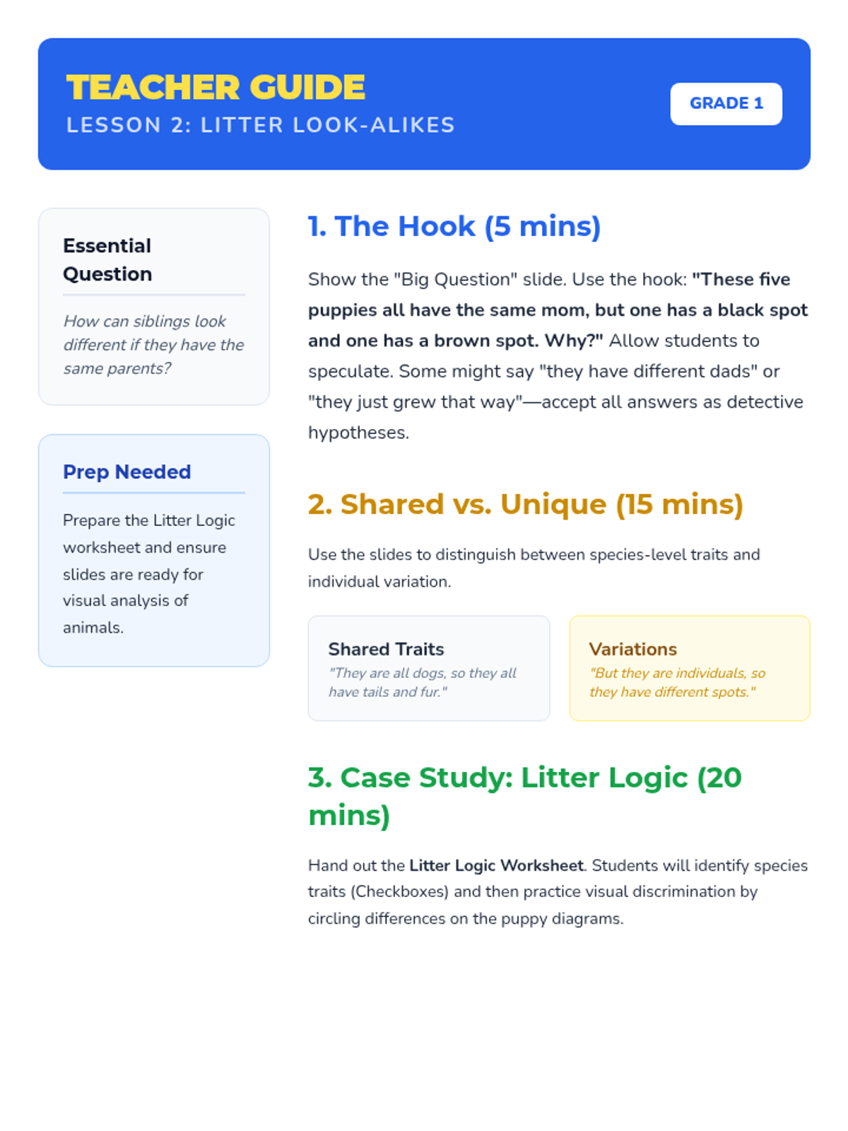 A 1st-grade science sequence introducing heredity and variation. Students explore why offspring resemble their parents but aren't identical through animal case studies, human trait surveys, and creative design projects.