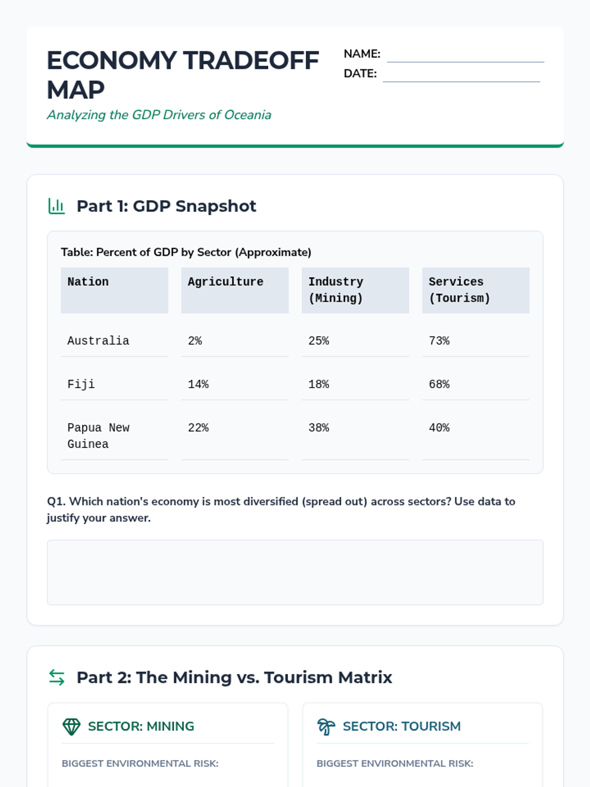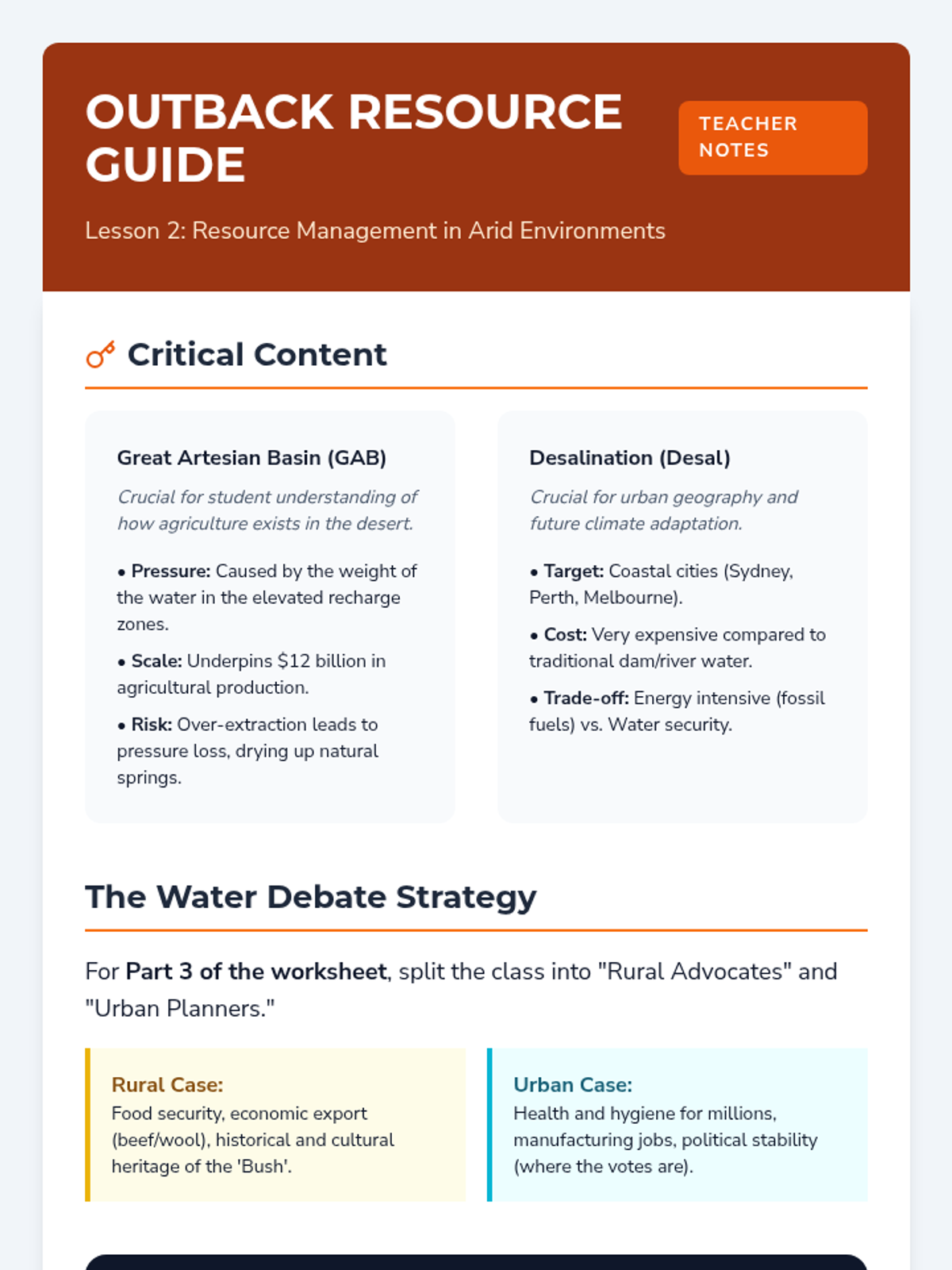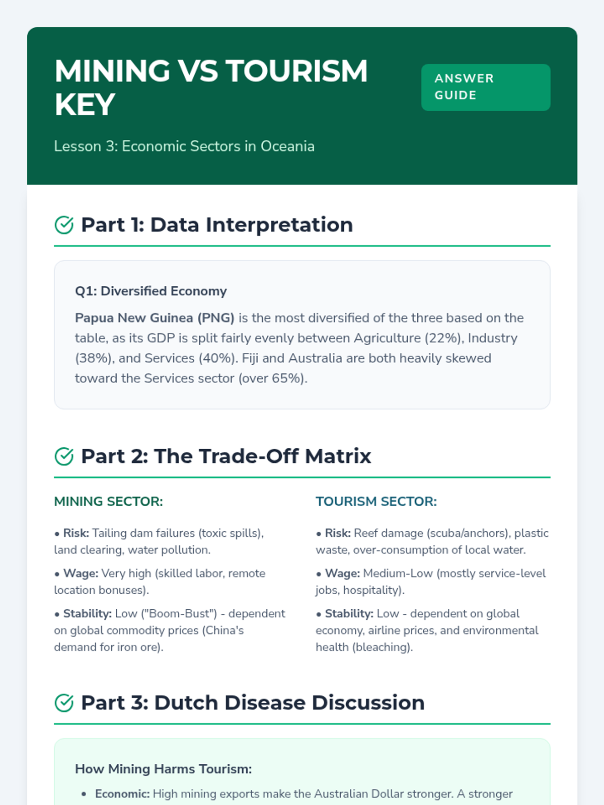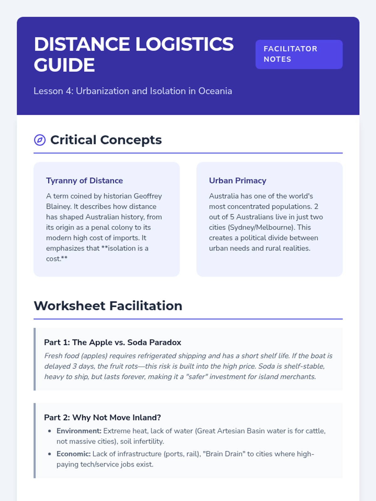 This sequence explores how societies in Oceania adapt to unique environmental constraints through indigenous navigation, arid land management, and modern economic choices. Students analyze the trade-offs between resource extraction and tourism before proposing sustainable development plans for island nations.
