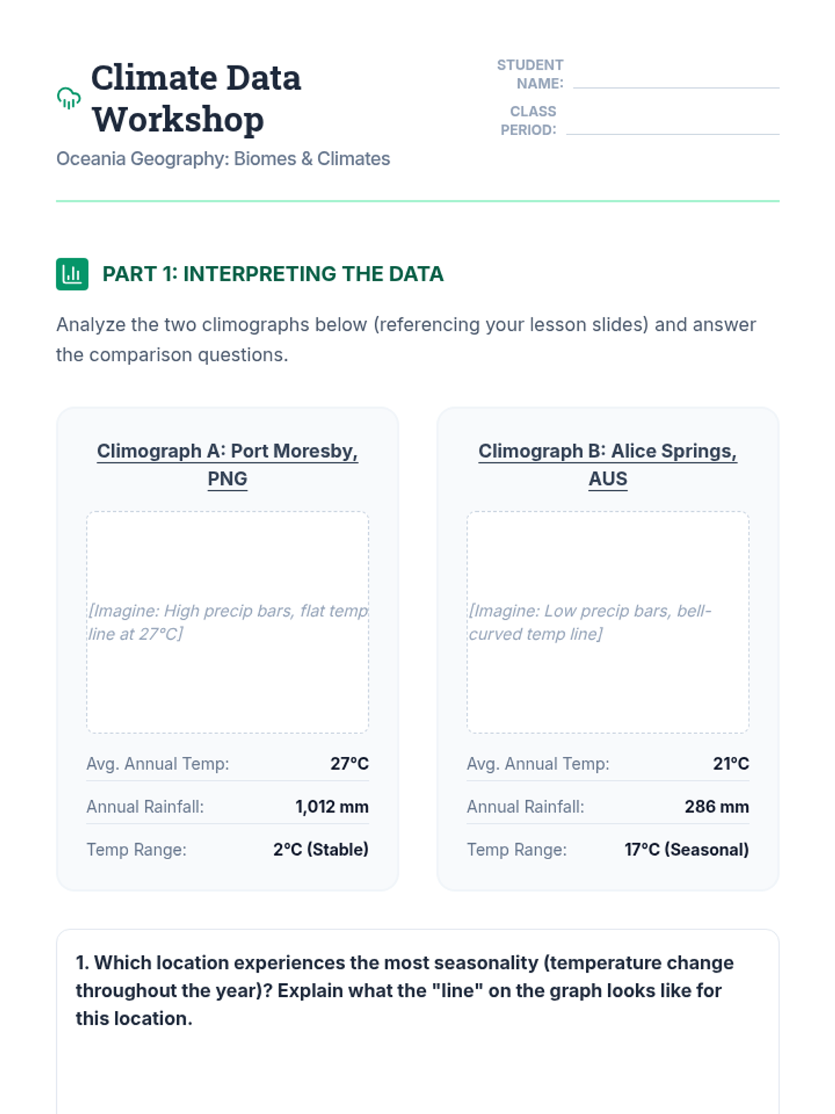 A comprehensive geography sequence exploring the physical diversity of Oceania, human-environment interactions, and the contemporary challenges of climate change. Students analyze tectonic formations, diverse biomes, resource distribution, and adaptation strategies across Australia, Melanesia, Micronesia, and Polynesia.