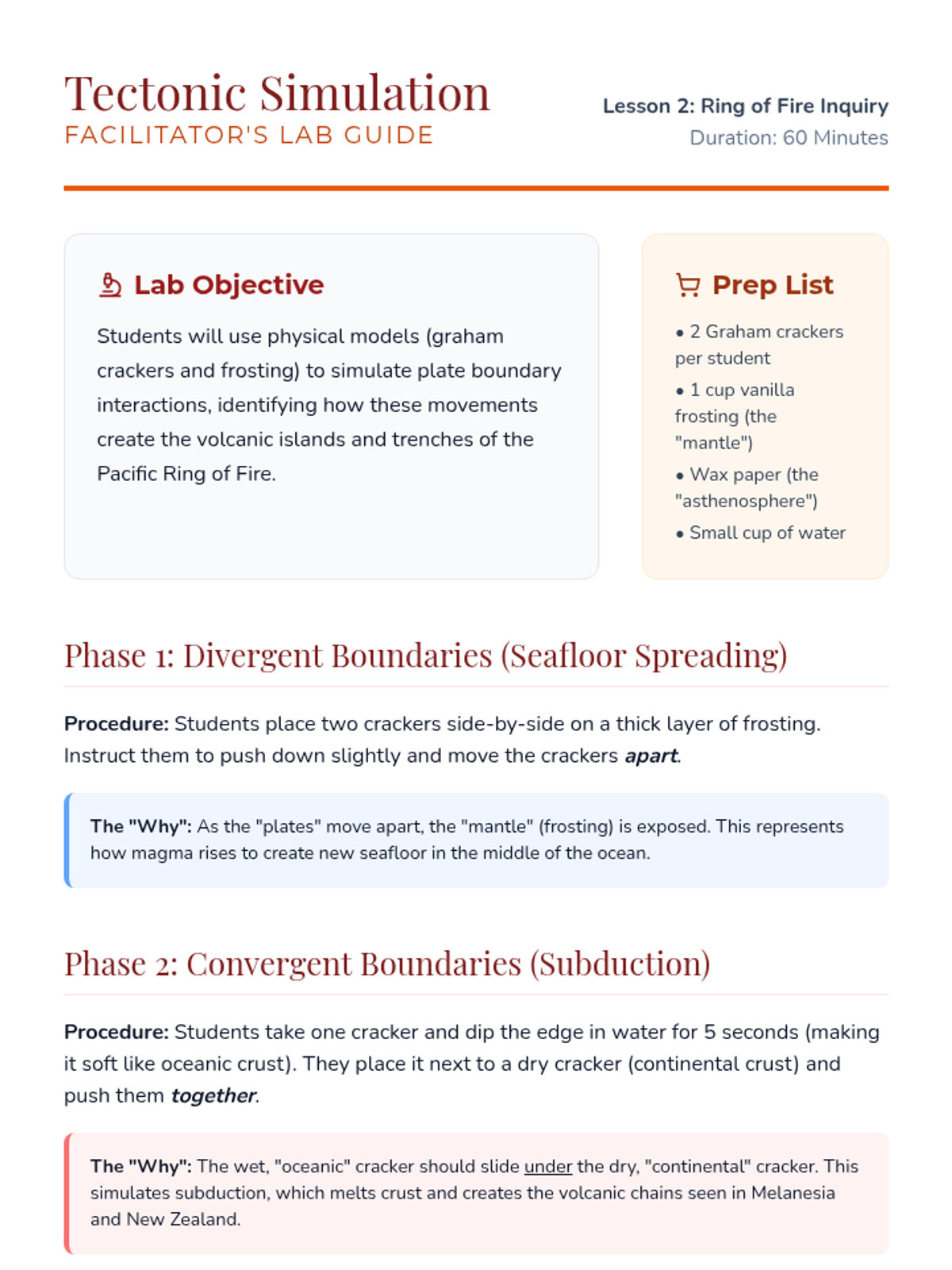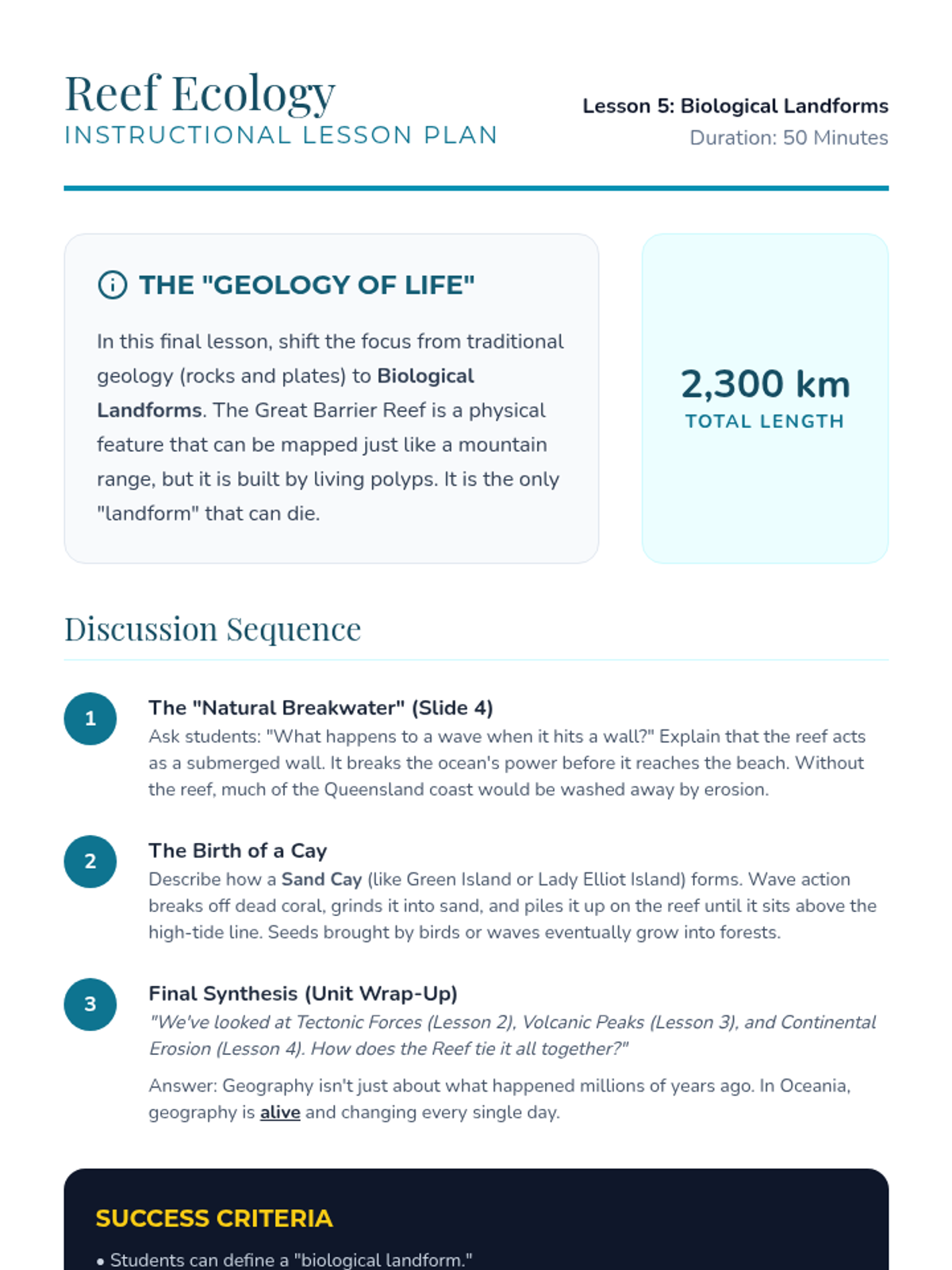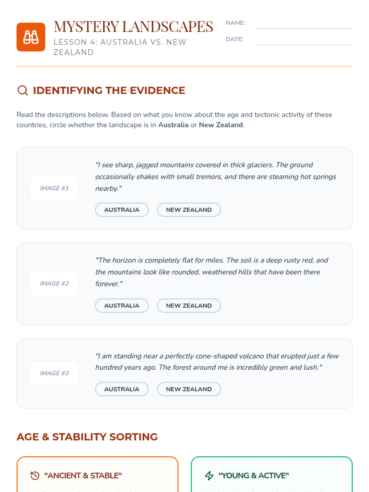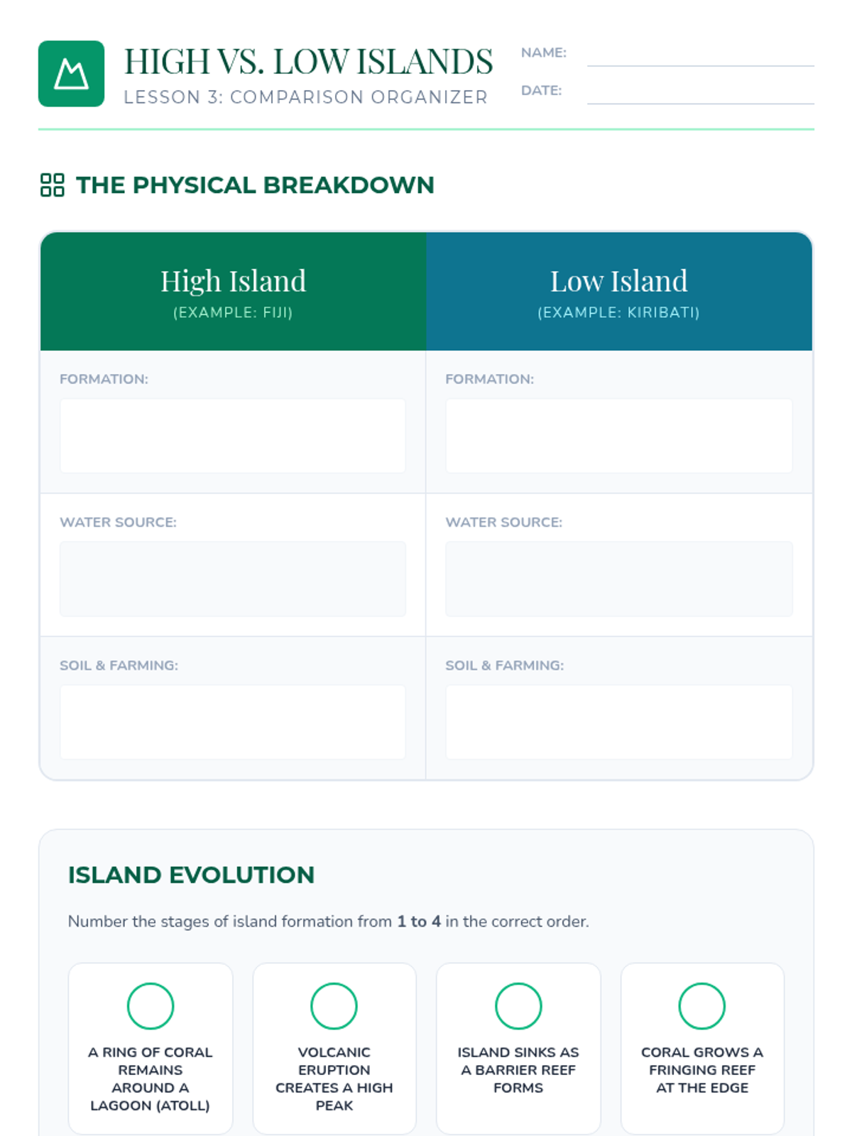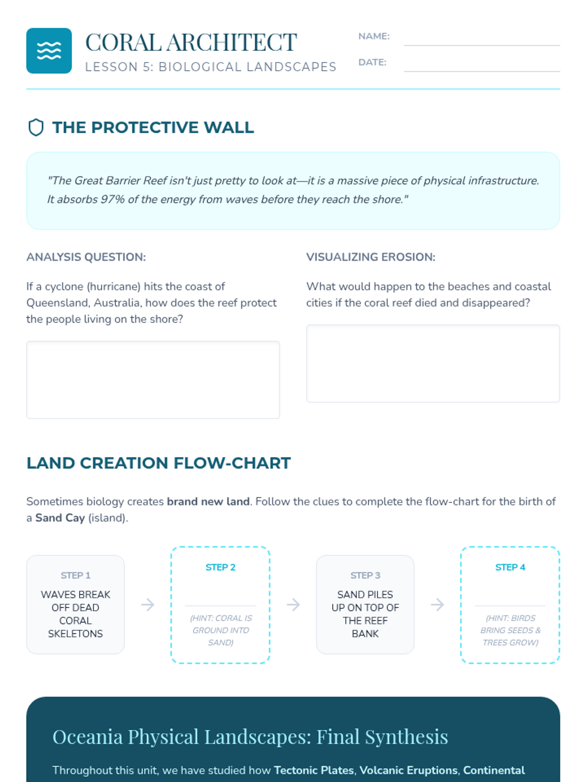 A comprehensive exploration of Oceania's physical geography, focusing on the tectonic forces, island formation, and unique biological landforms that define the region. Students investigate the distinction between high and low islands, the Ring of Fire, and the contrasting landscapes of Australia and New Zealand.