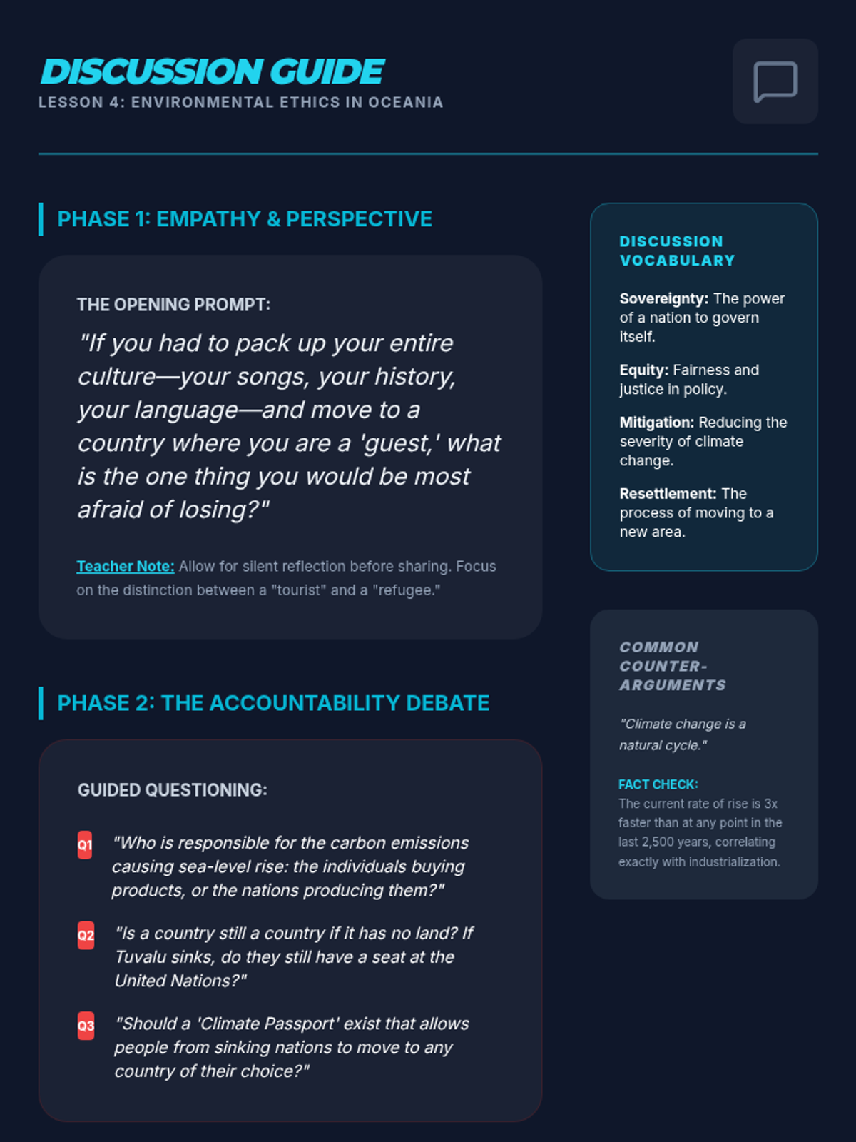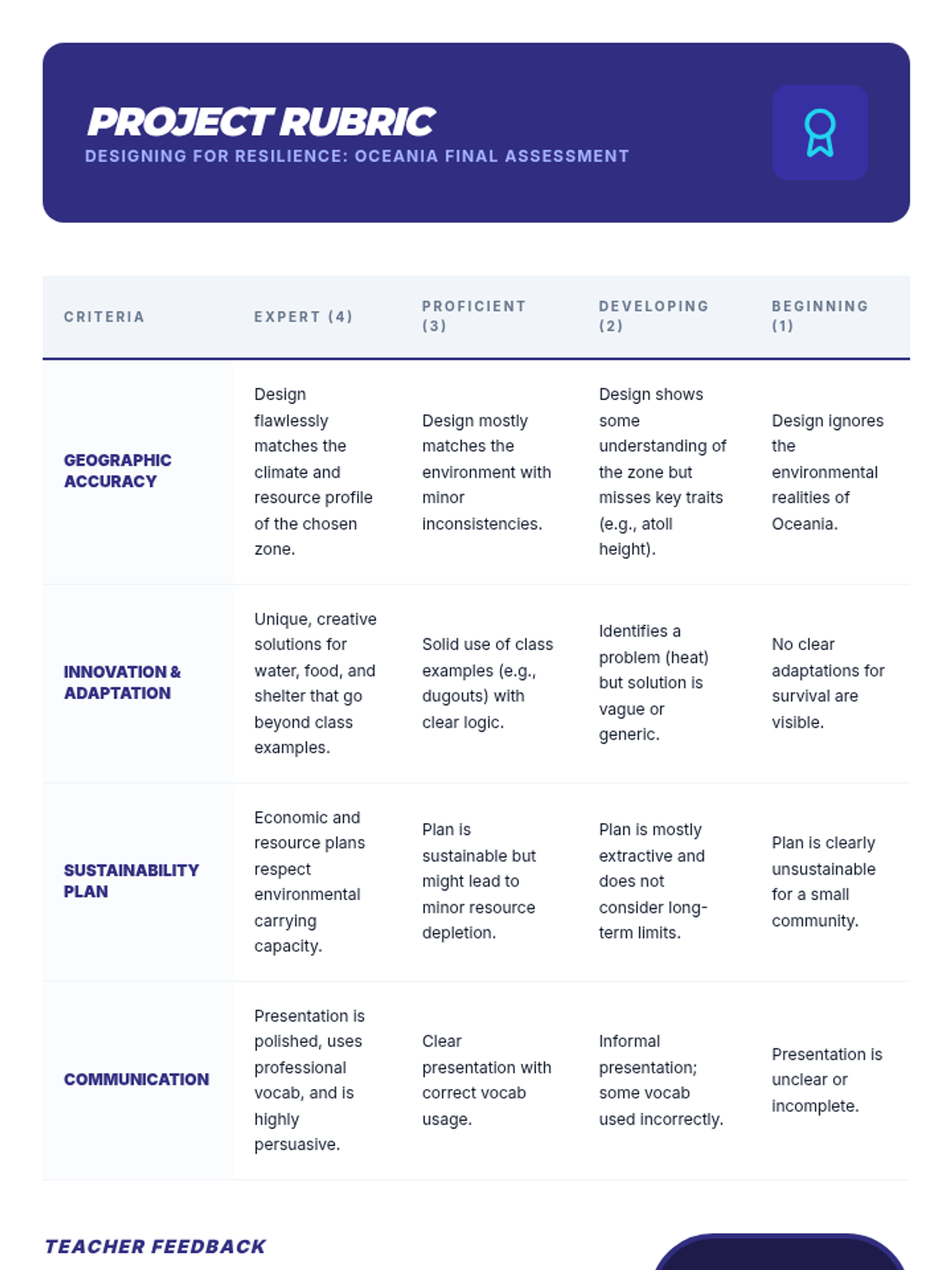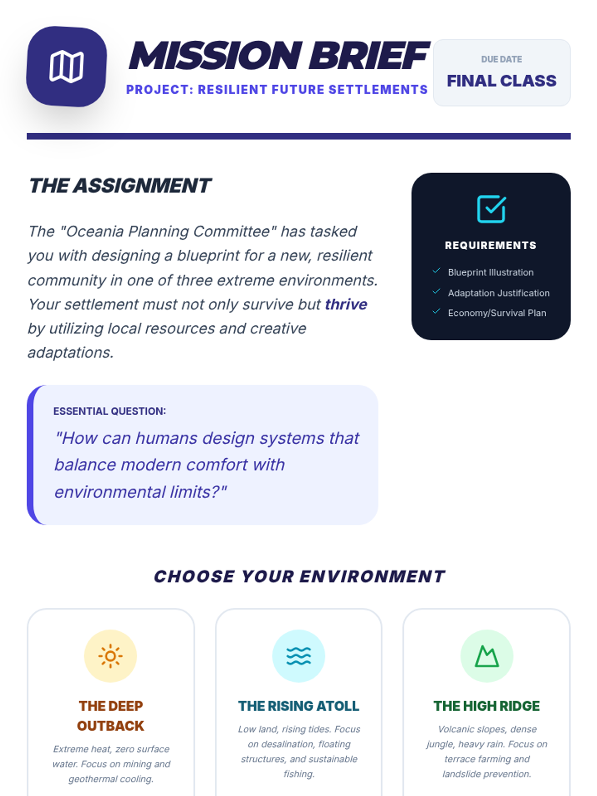 A 6th-grade geography sequence exploring how humans adapt to the diverse environments of Oceania, from the Australian Outback to remote Pacific atolls. Students analyze climate data, simulate resource scarcity, and design resilient communities for the future.