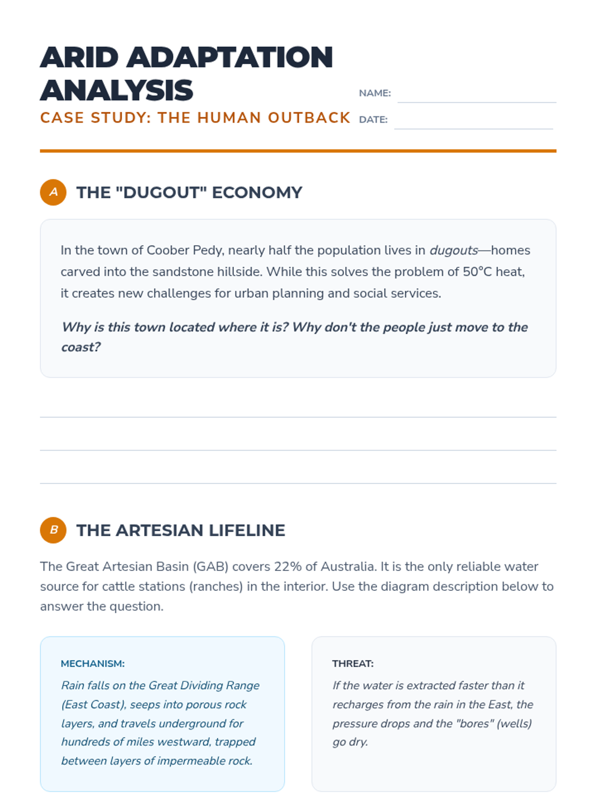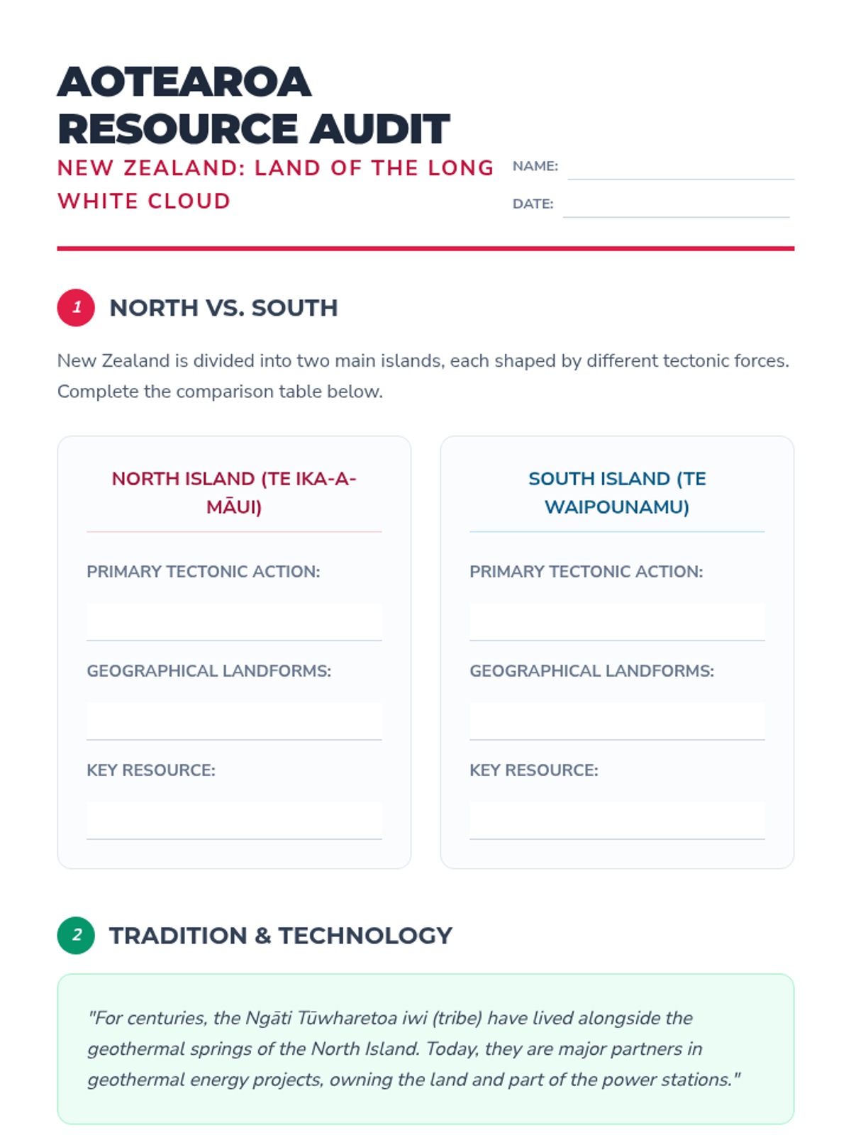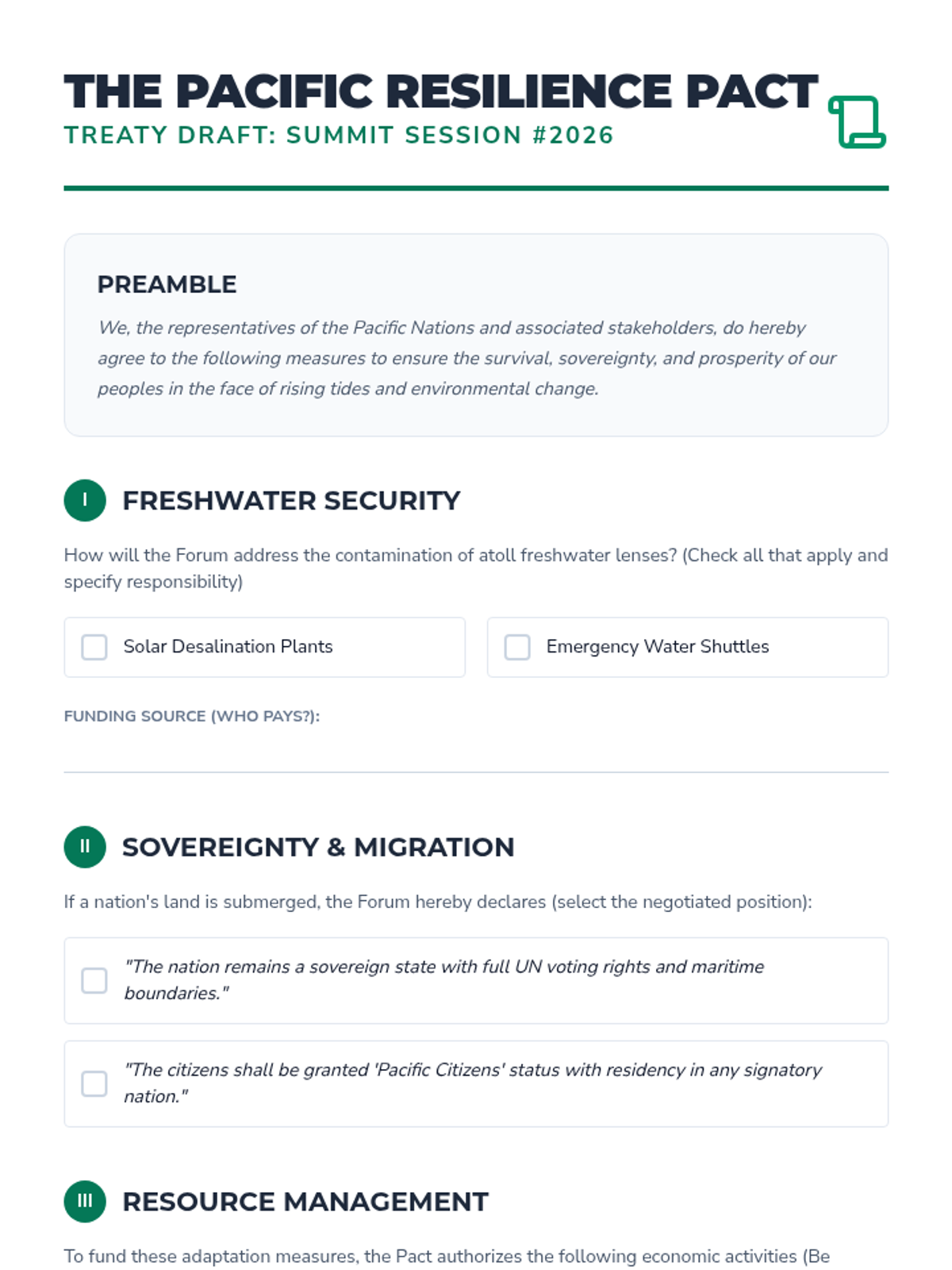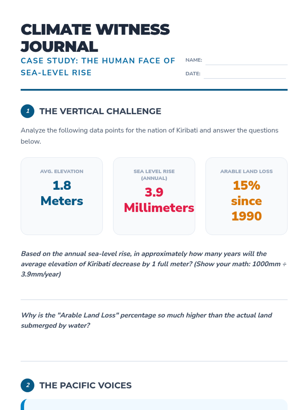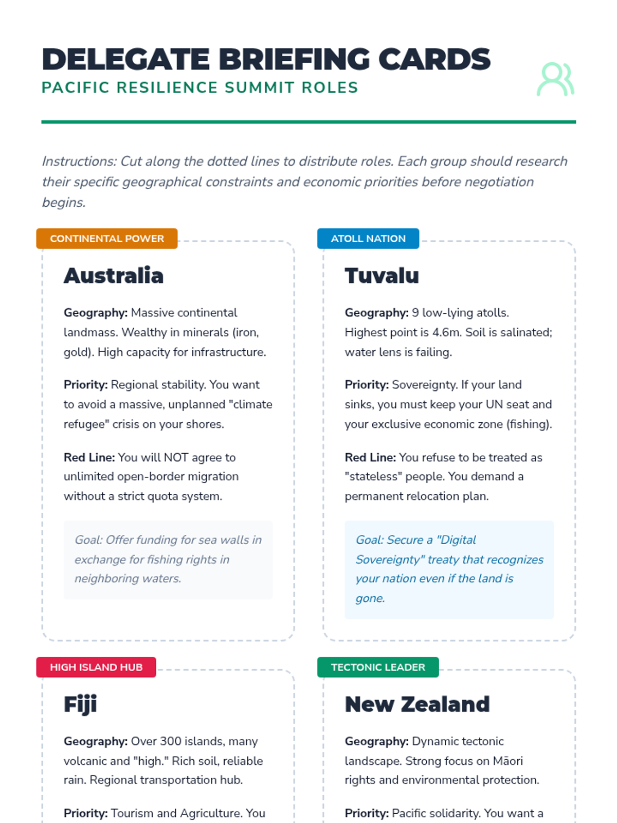 This sequence explores the relationship between the physical geography of Oceania and human adaptation, focusing on landform types, arid-climate survival, geothermal energy, and the existential threat of sea-level rise. Students progress from geospatial analysis to a complex simulation on climate resilience.