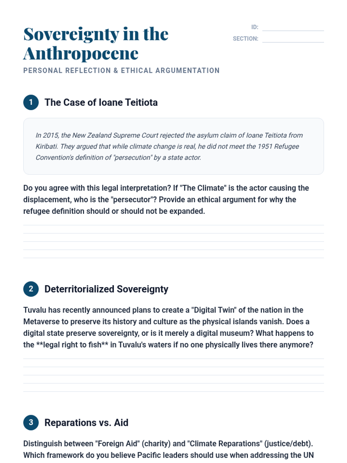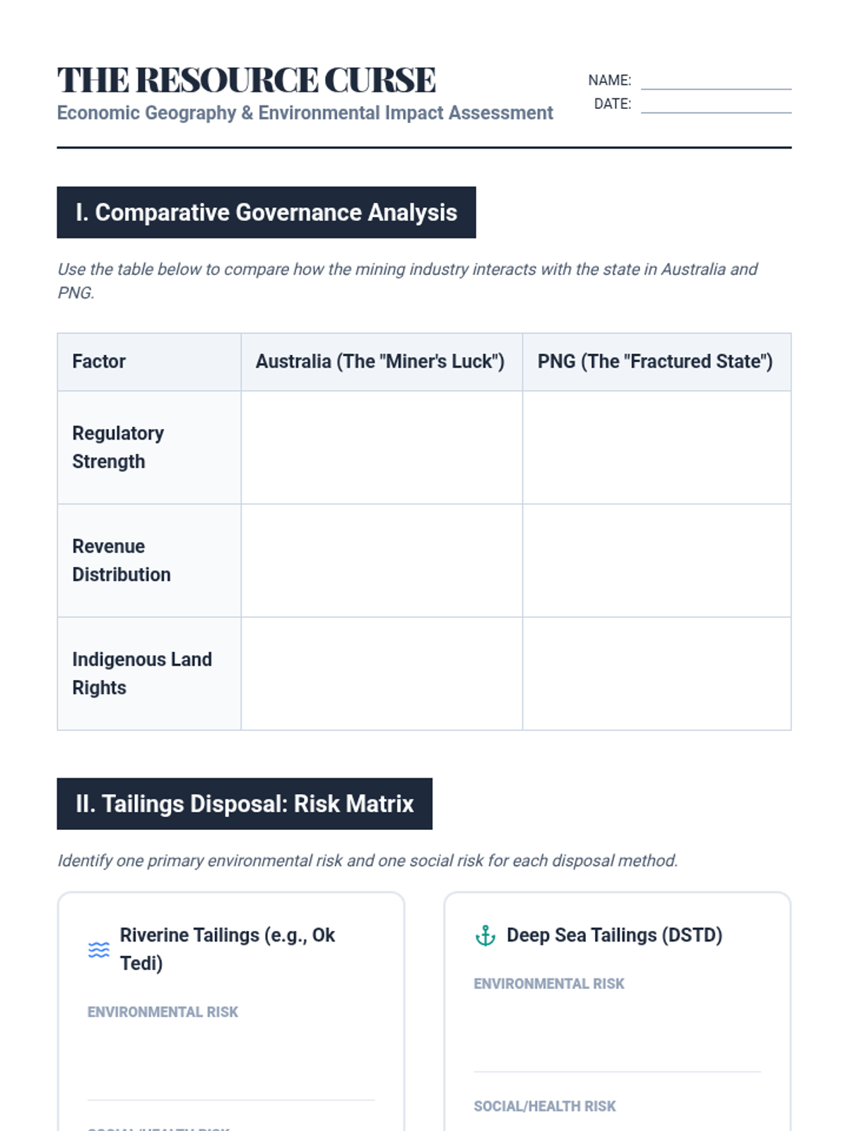 A comprehensive undergraduate course exploring the intersection of natural resource distribution, economic development, and environmental justice in the contemporary Pacific. Students analyze geopolitical tensions, extractive industries, climate change sovereignty, and nuclear legacies to draft policy recommendations for regional sustainability.