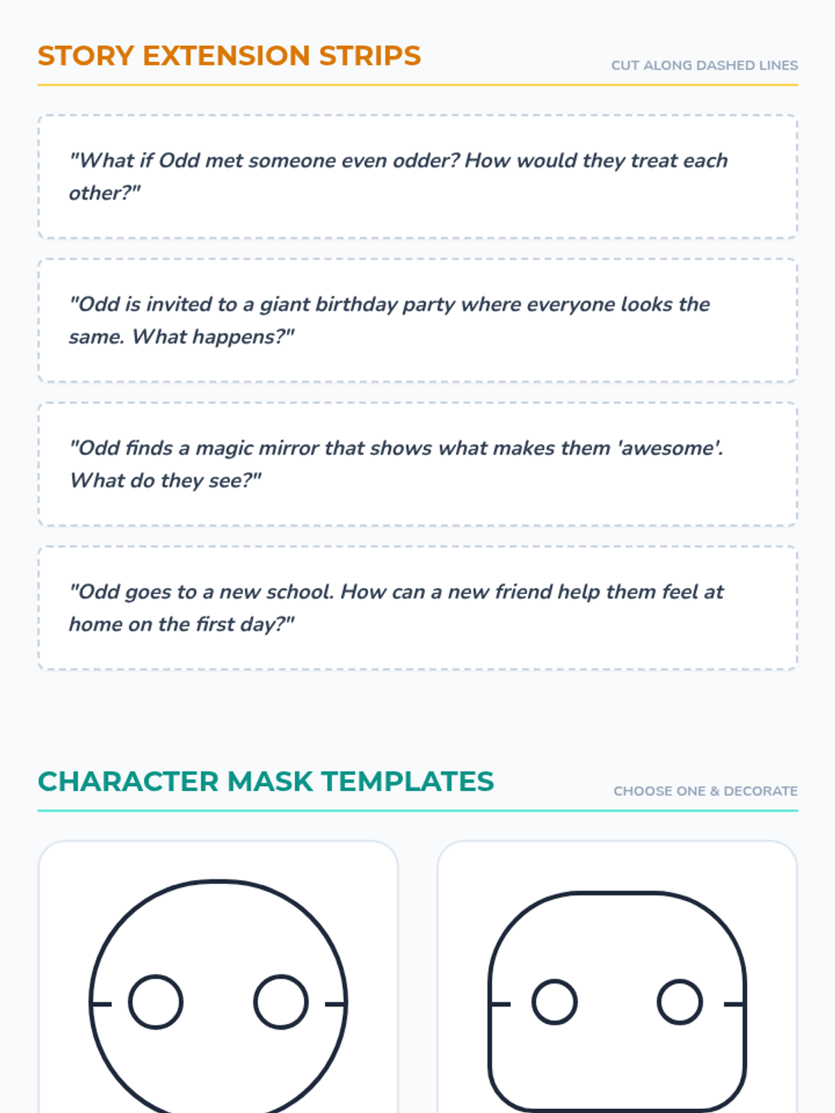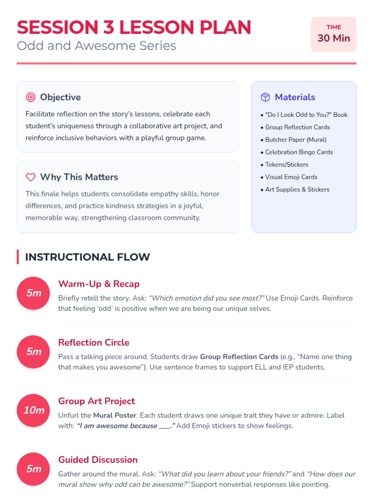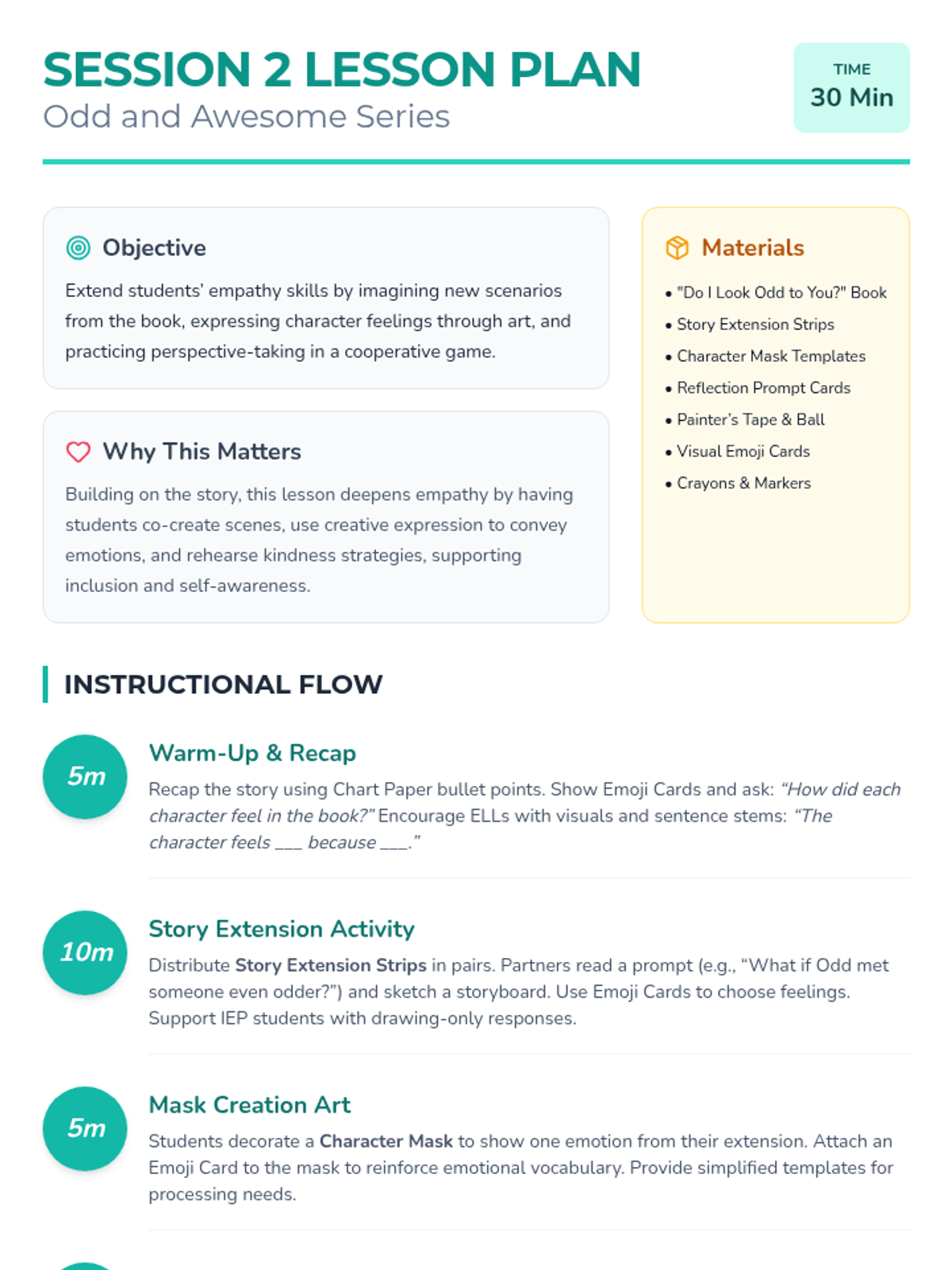 A 3-session empathy and inclusion series for PreK-5 students inspired by the book 'Do I Look Odd to You?'. Students explore what makes them unique, practice empathy through role-play, and celebrate differences through collaborative art and games.