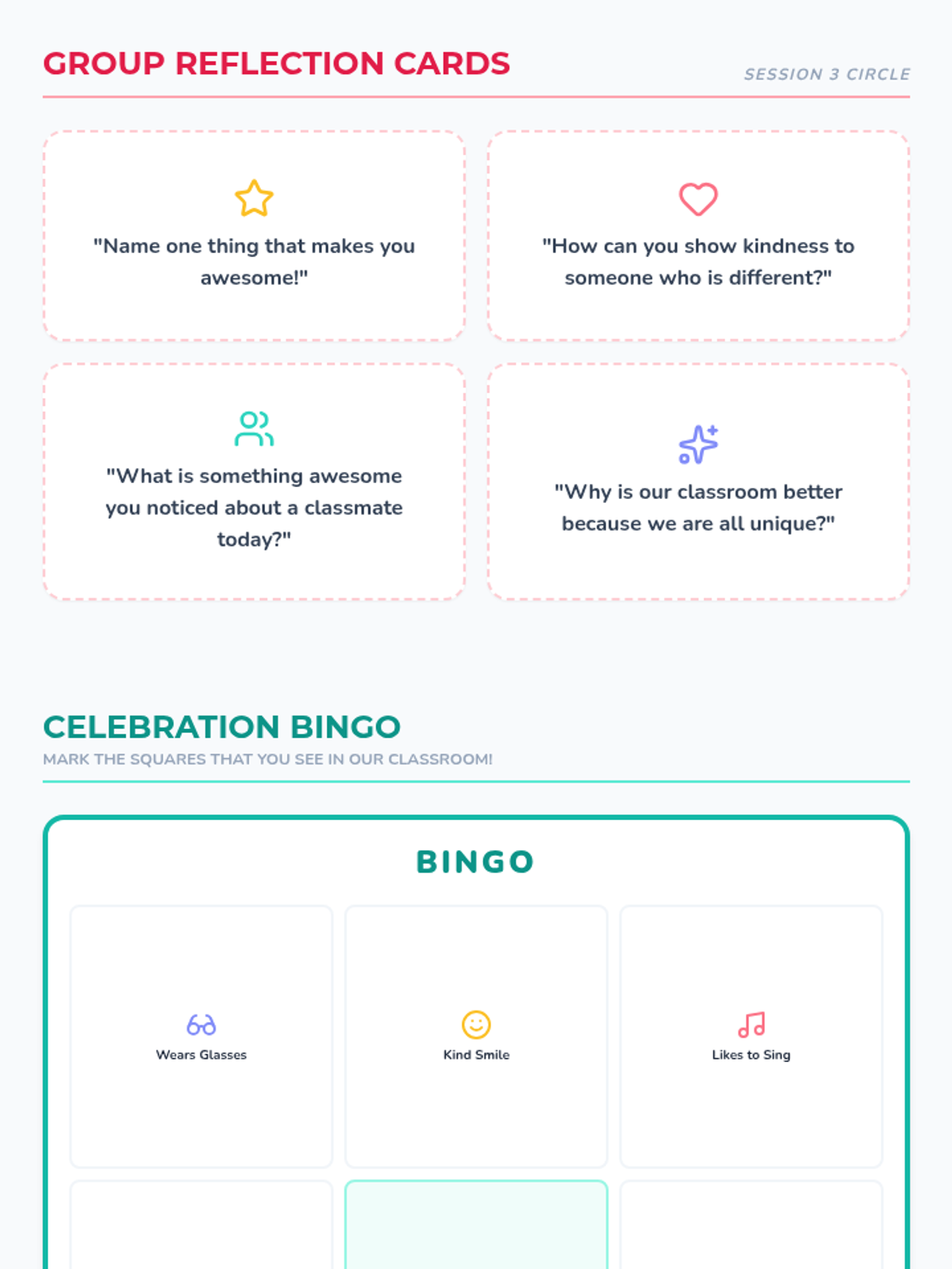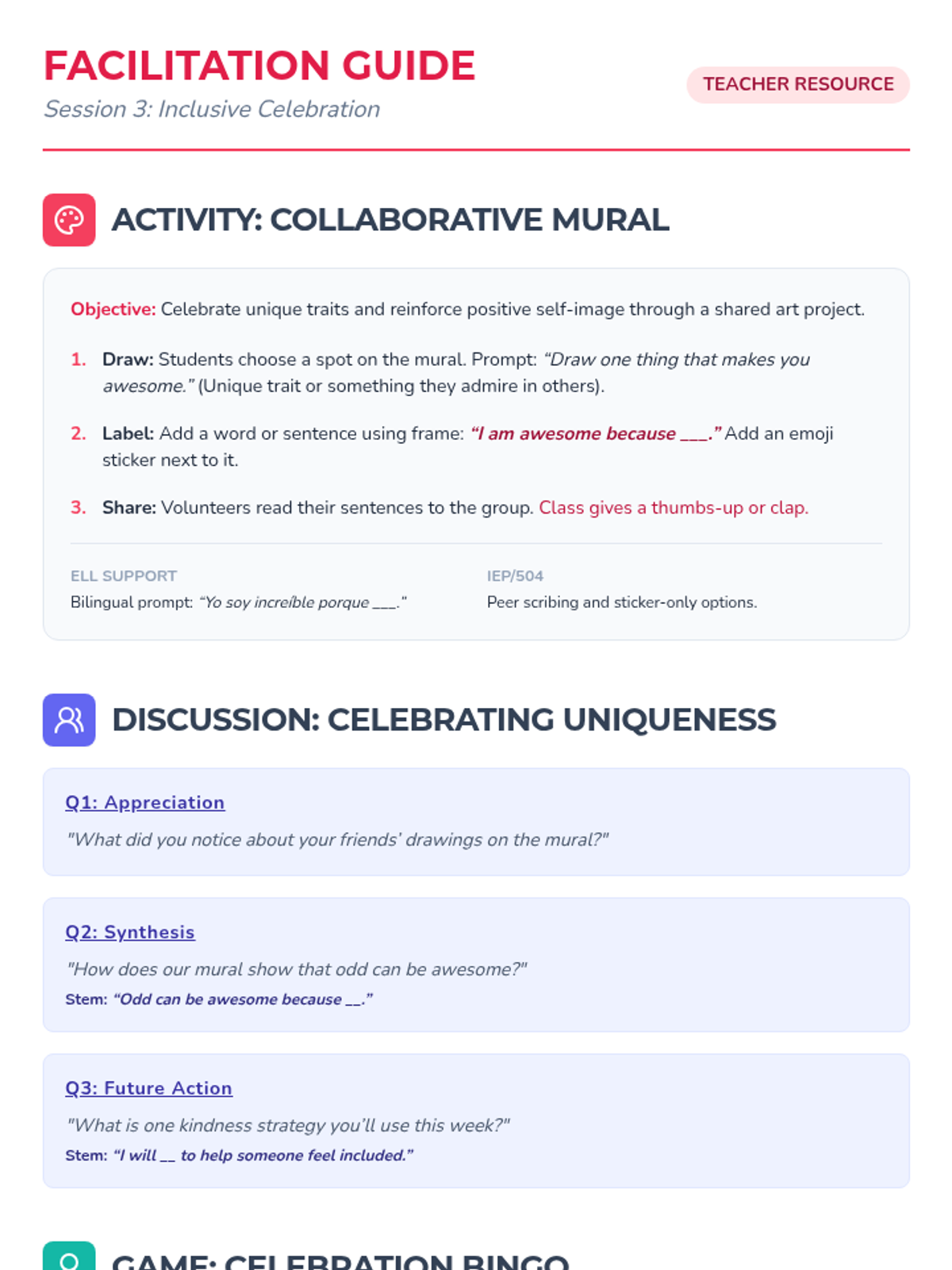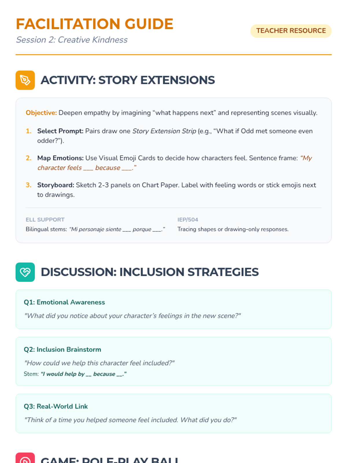 A 3-session empathy and inclusion series for PreK-5 students inspired by the book 'Do I Look Odd to You?'. Students explore what makes them unique, practice empathy through role-play, and celebrate differences through collaborative art and games.