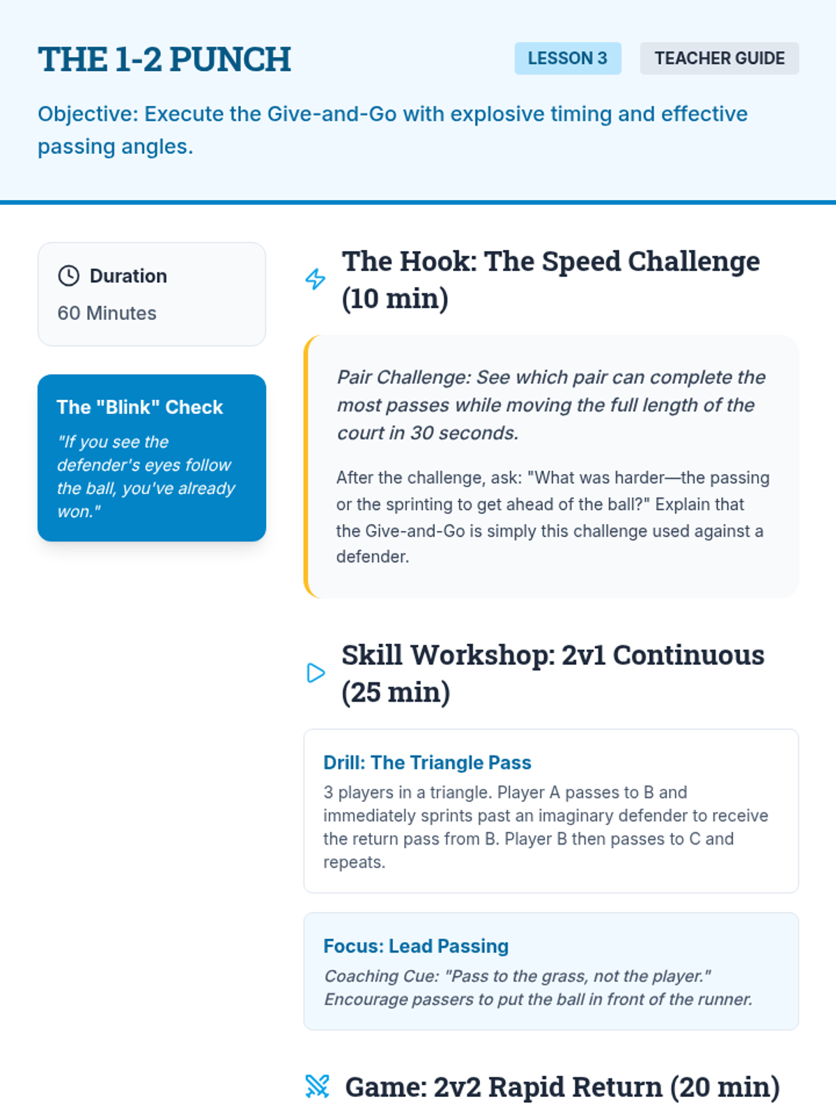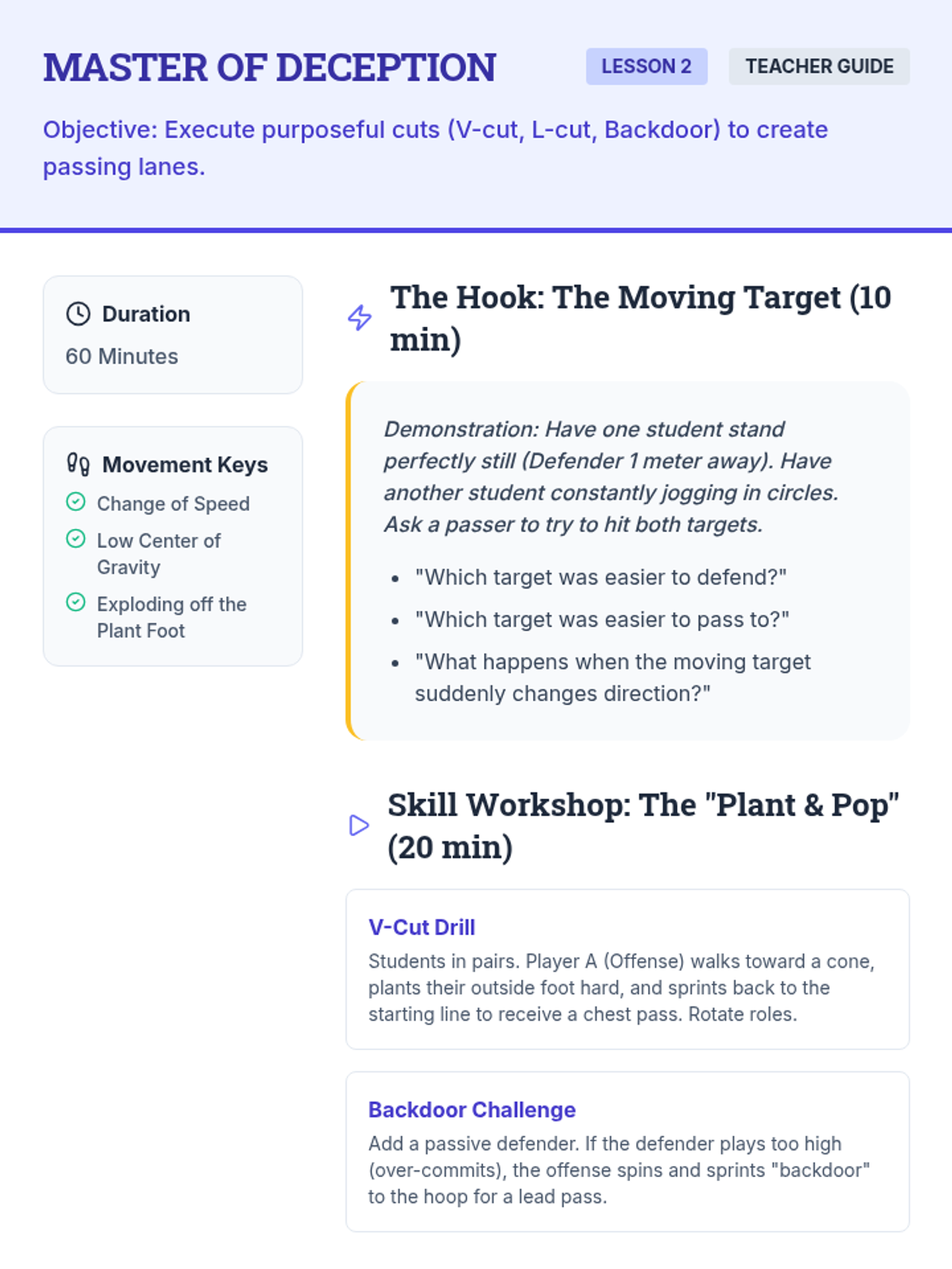A comprehensive sequence for 7th-grade students focusing on offensive movement, spatial awareness, and tactical collaboration in invasion games. Students transition from chaotic 'bunching' to sophisticated team plays including cuts, screens, and give-and-go movements.