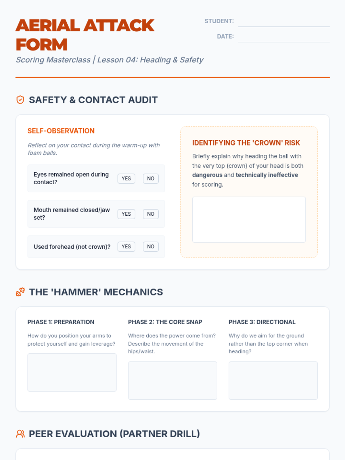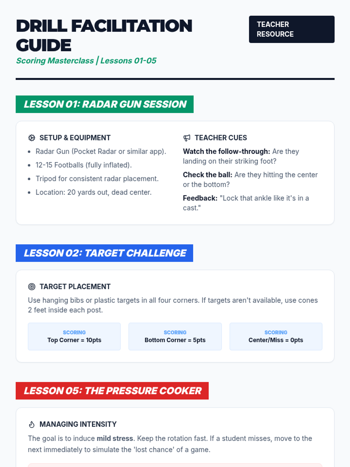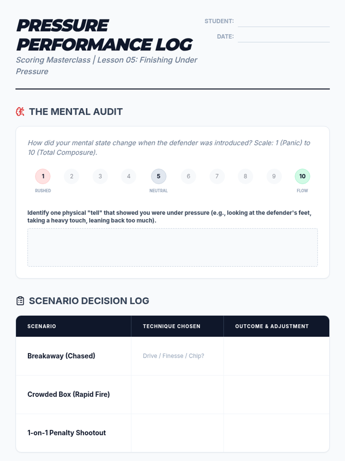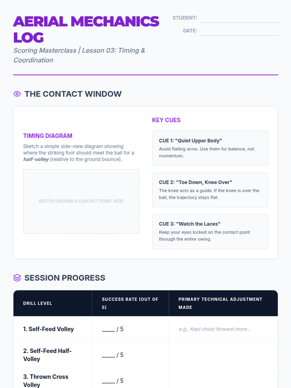 This sequence explores the biomechanics and psychology of scoring goals in football. Students will progress from foundational power striking to advanced finesse, aerial finishes, and high-pressure game simulations.