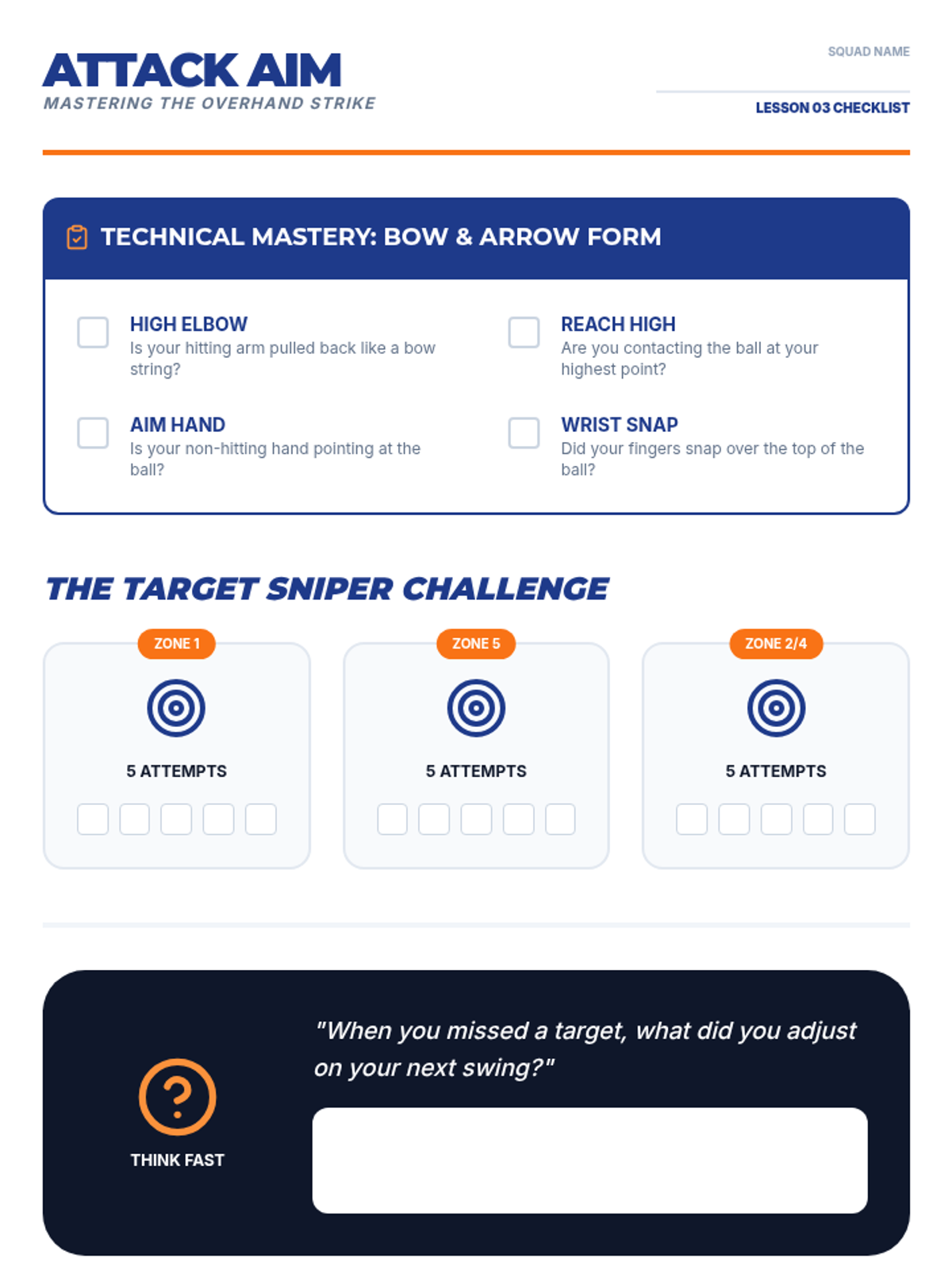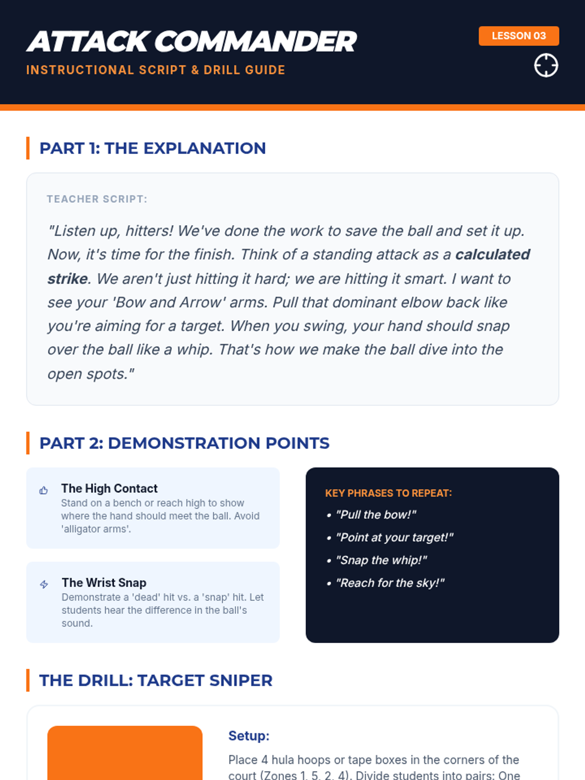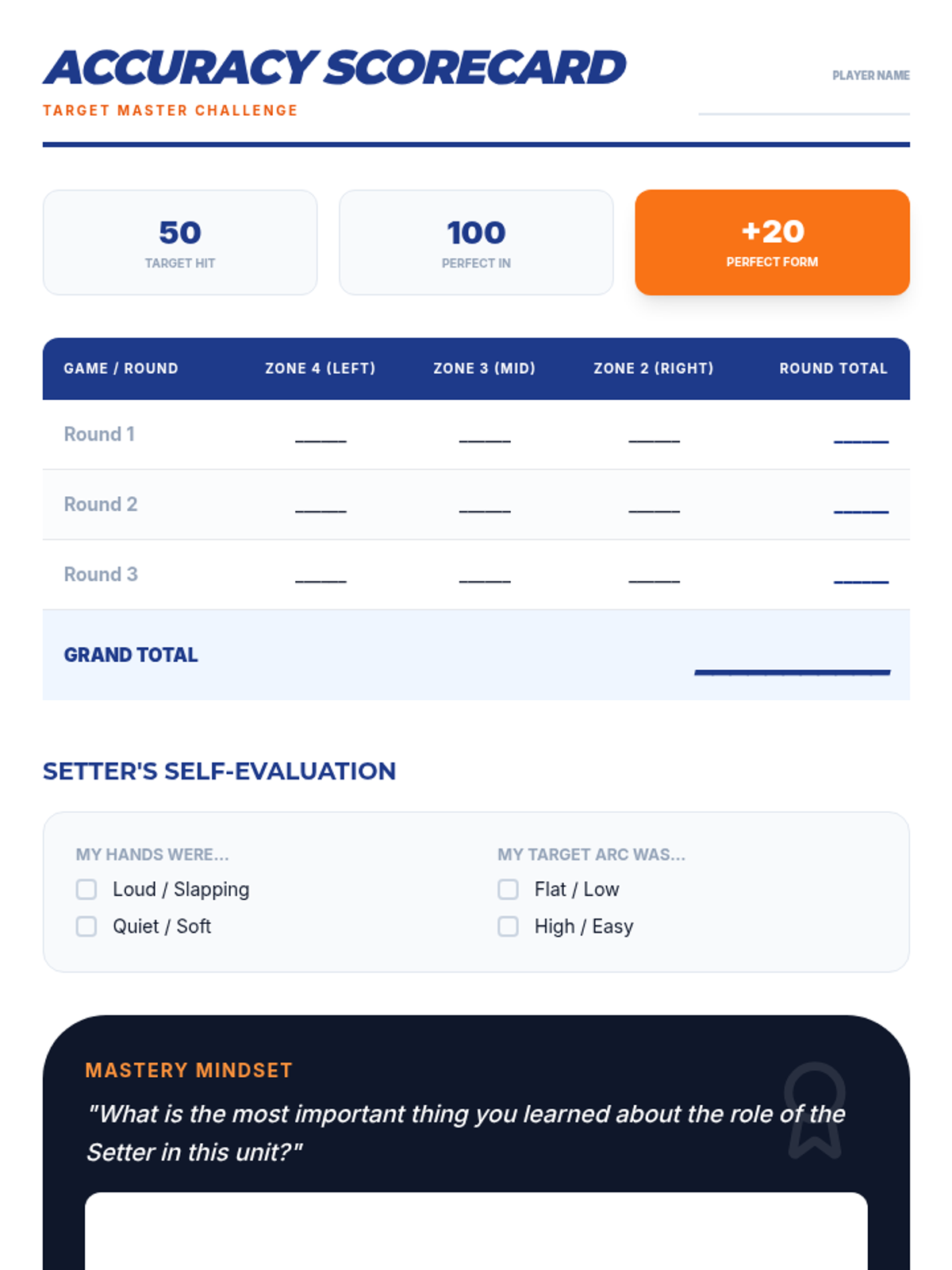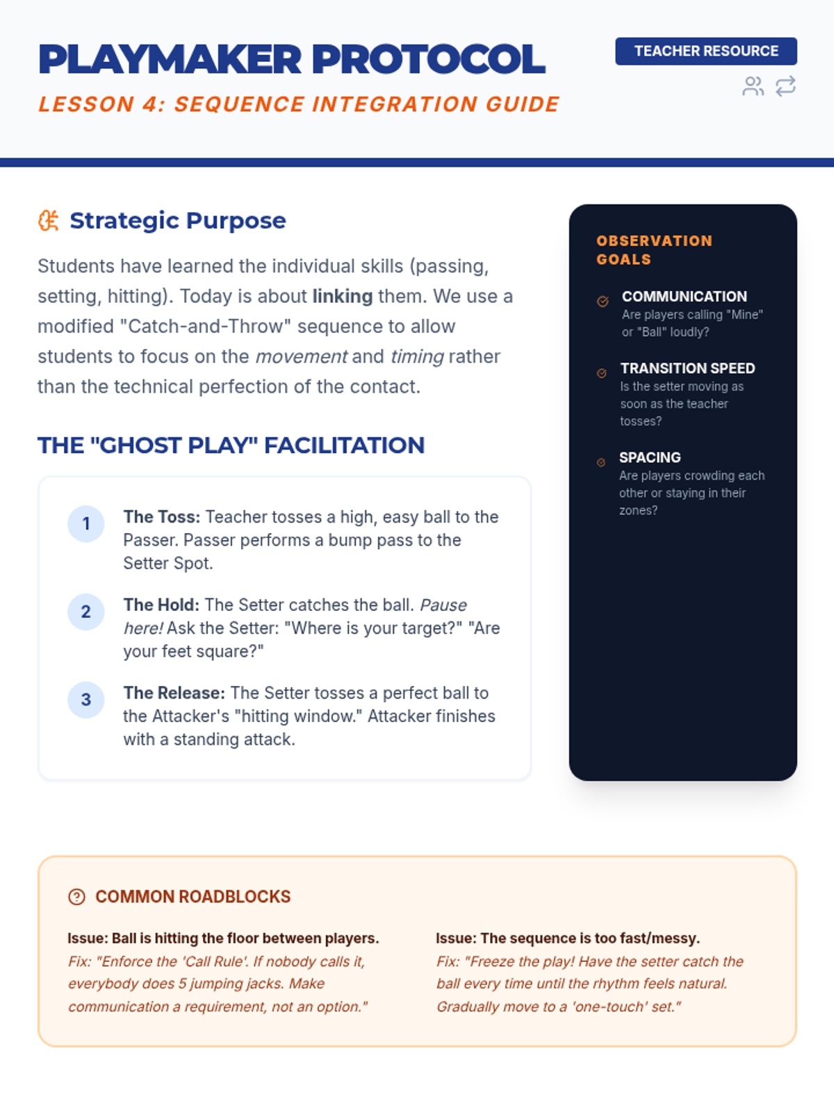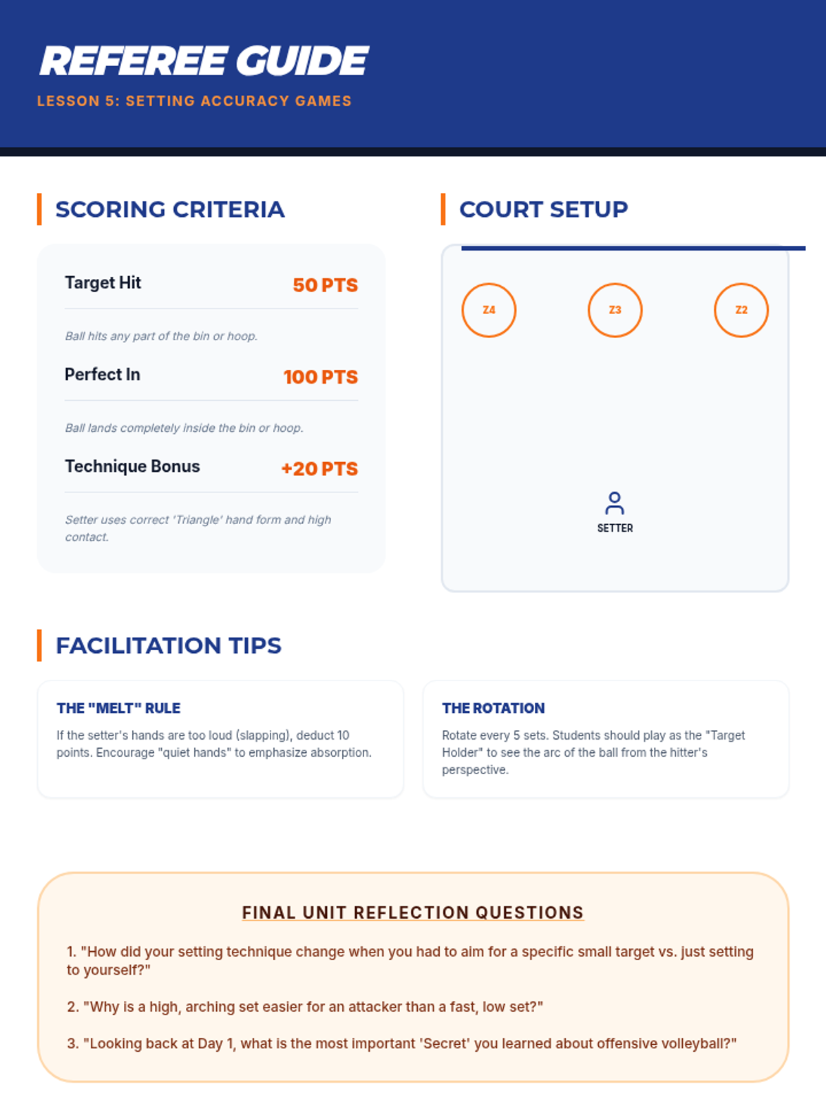 A 5-lesson sequence for 5th graders focusing on overhead setting, setter positioning, and the three-hit offensive flow in volleyball. Students will master the 'Pass-Set-Hit' rhythm and understand the strategic role of the setter.