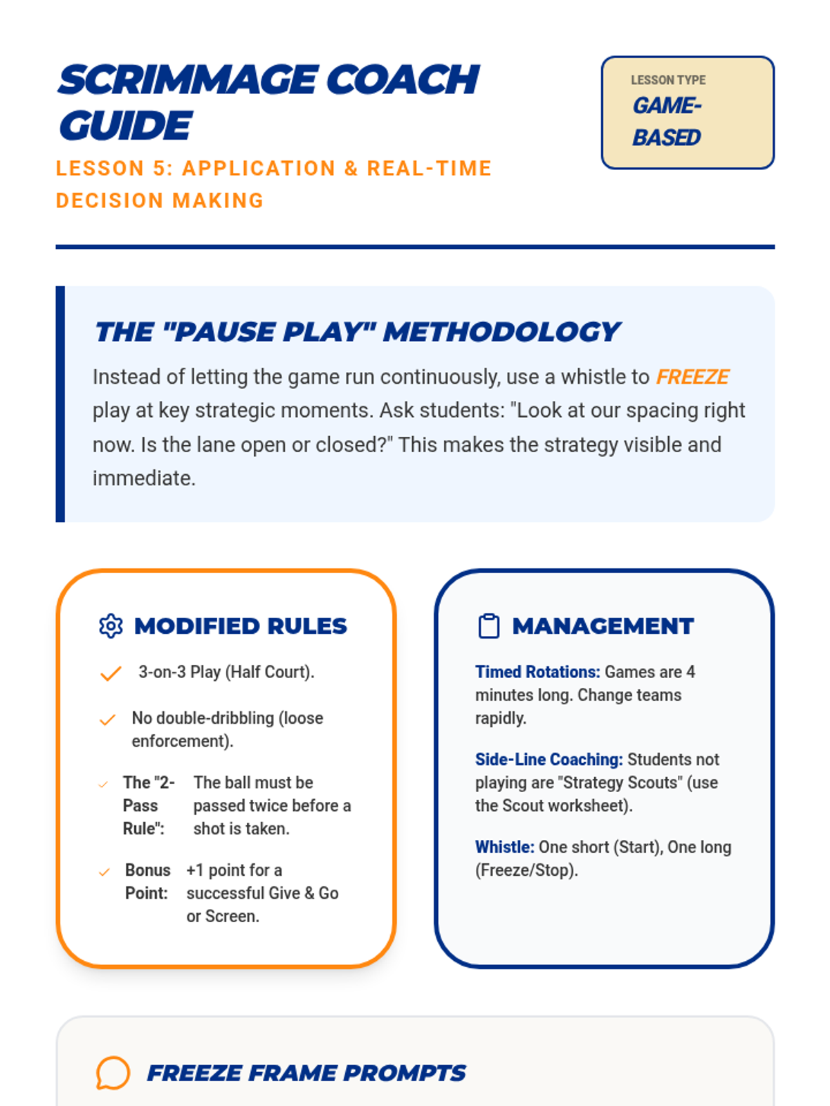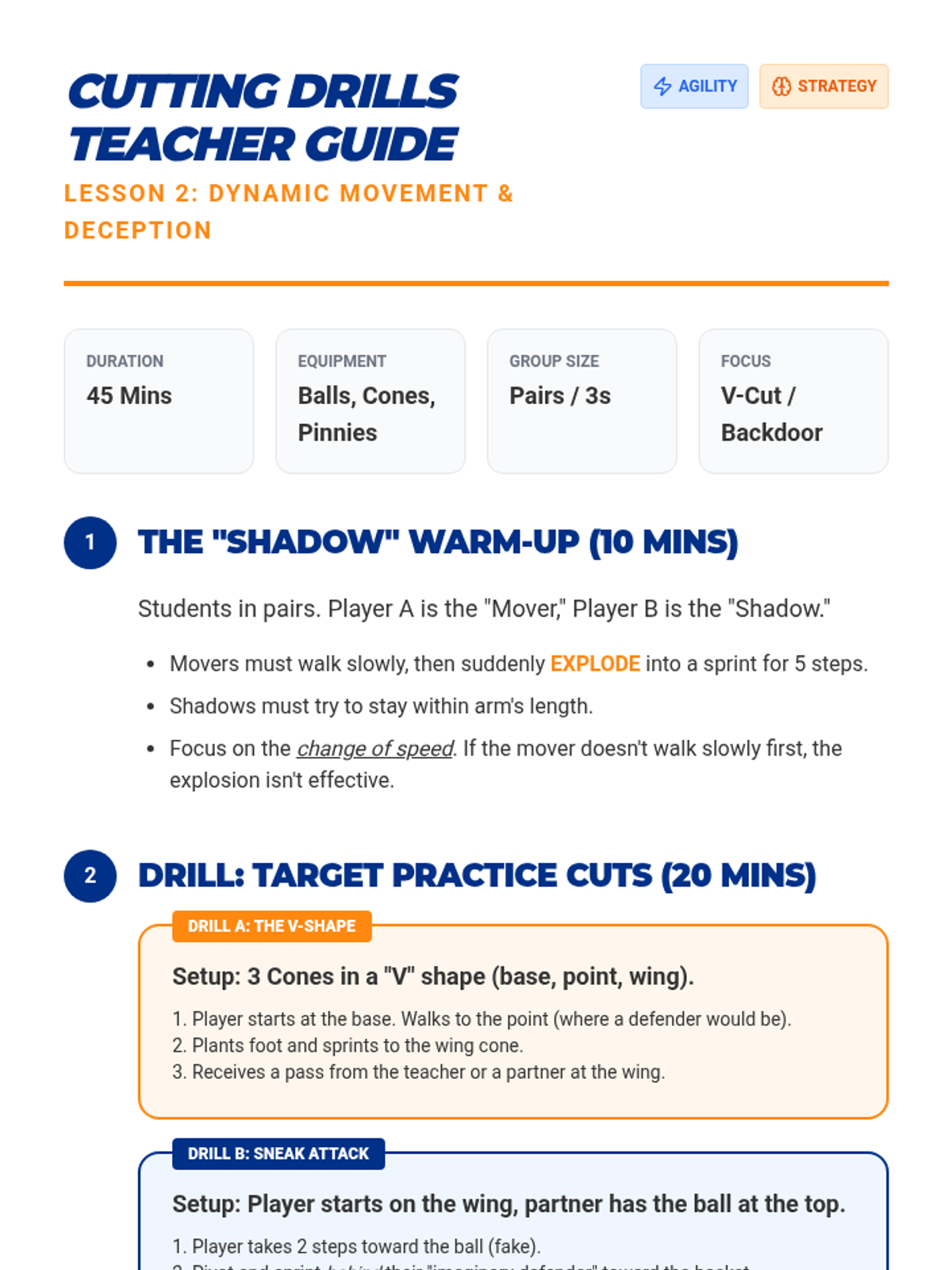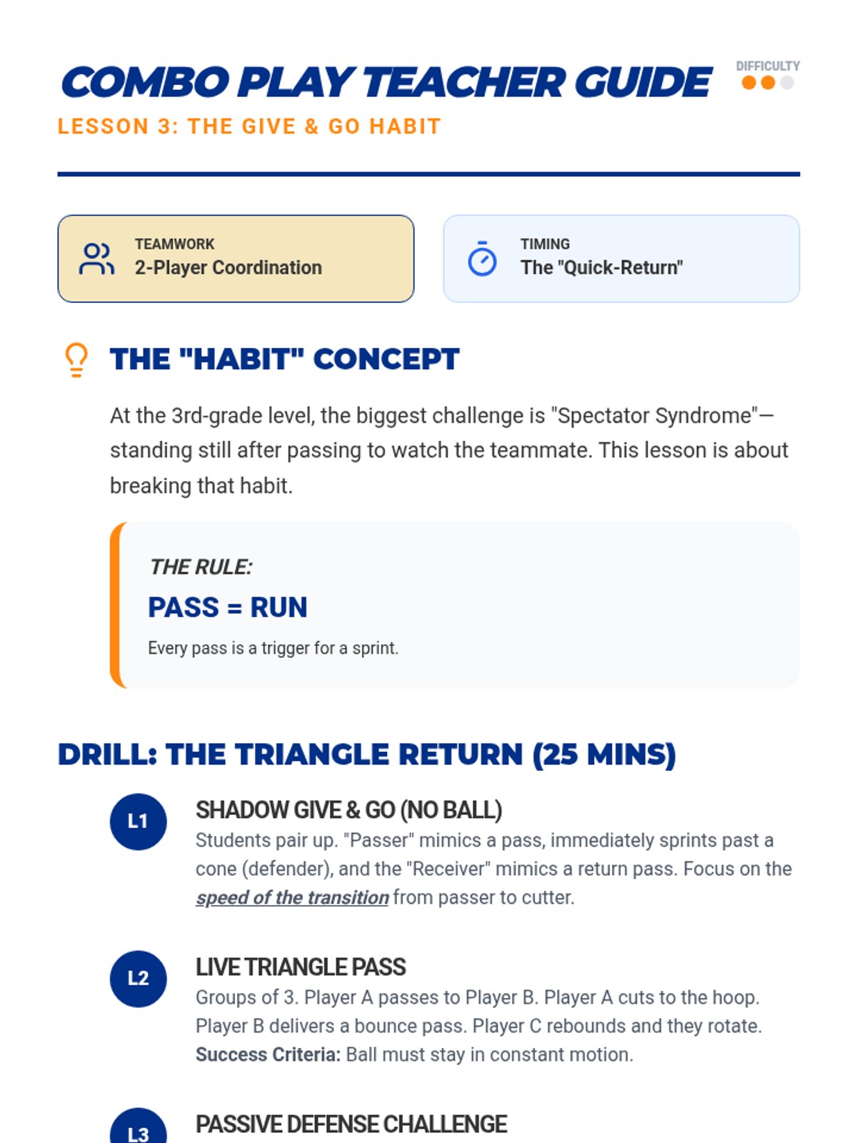 This 3rd-grade sequence focuses on offensive basketball strategy, teaching students the importance of floor spacing, cutting to the basket, the 'give and go' play, and basic screening. Students move from conceptual understanding of spatial awareness to practical application in modified 3-on-3 scrimmages.
