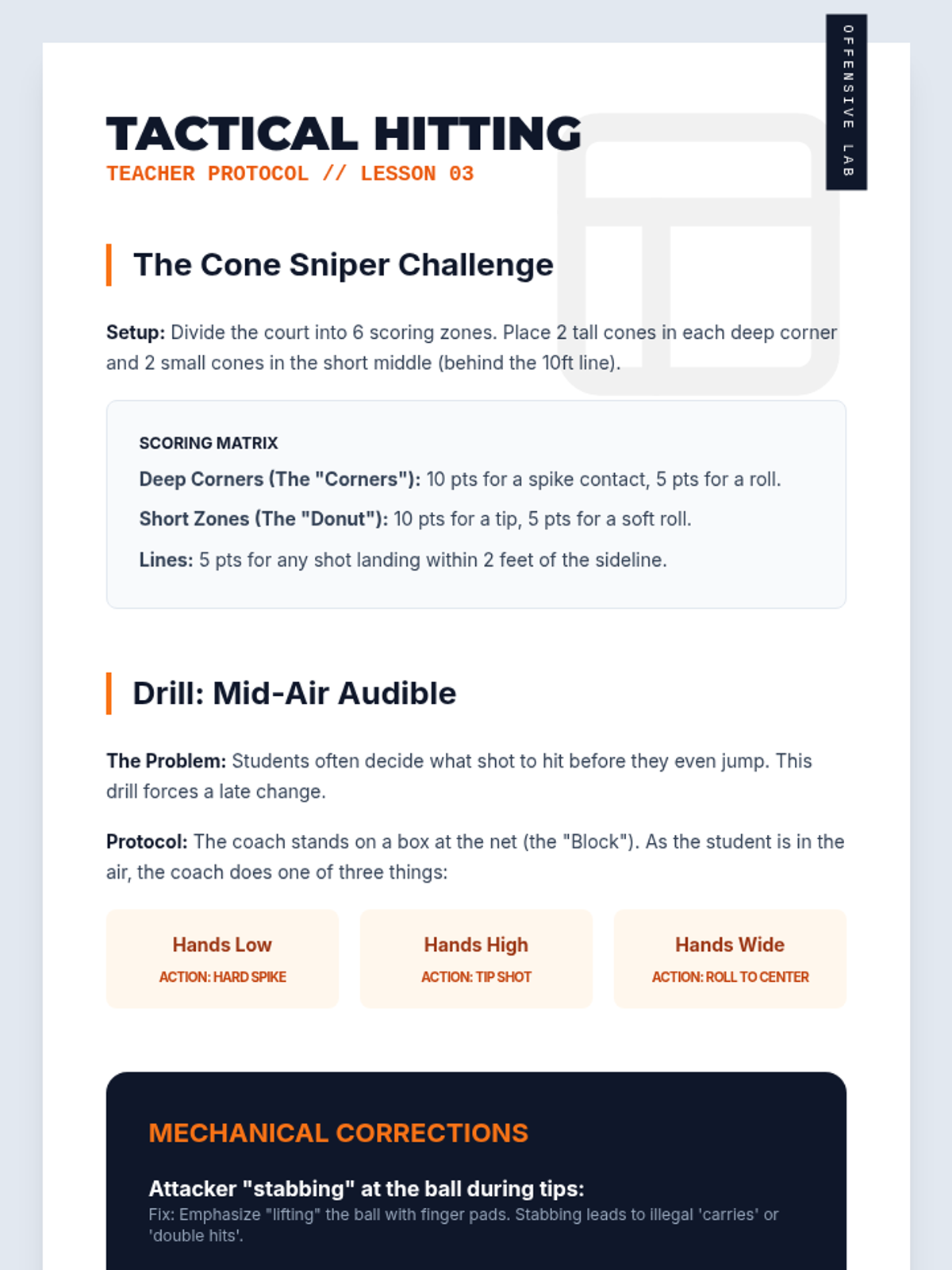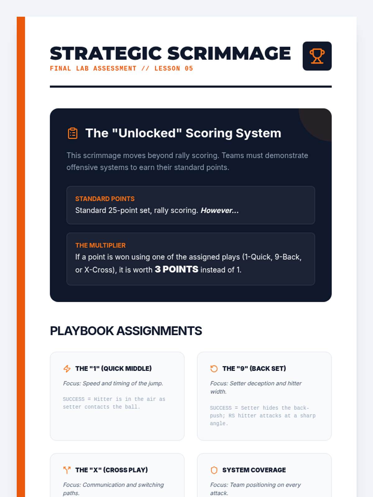 This sequence guides 11th-grade students through the complexities of volleyball's offensive side, moving from individual mechanics to team-based tactical systems. Students will master setter decision-making, the 3-step hitting approach, varied attack shots, and transition coverage to build a cohesive scoring threat.