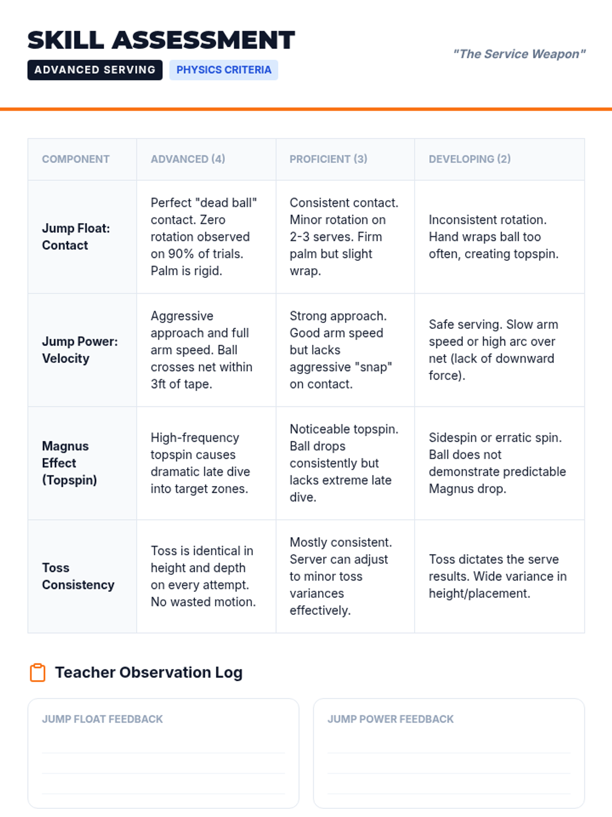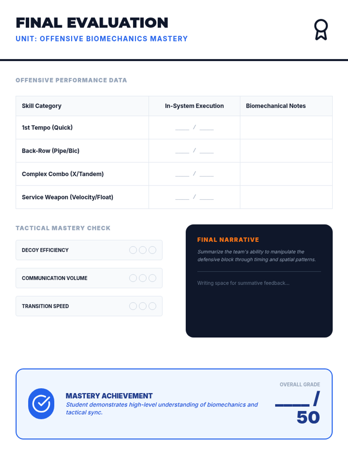 This advanced physical education unit for 12th graders explores the biomechanical principles of elite volleyball offense. Students analyze the physics of the arm swing, service trajectories, and offensive tempo to refine their power, accuracy, and strategic execution on the court.