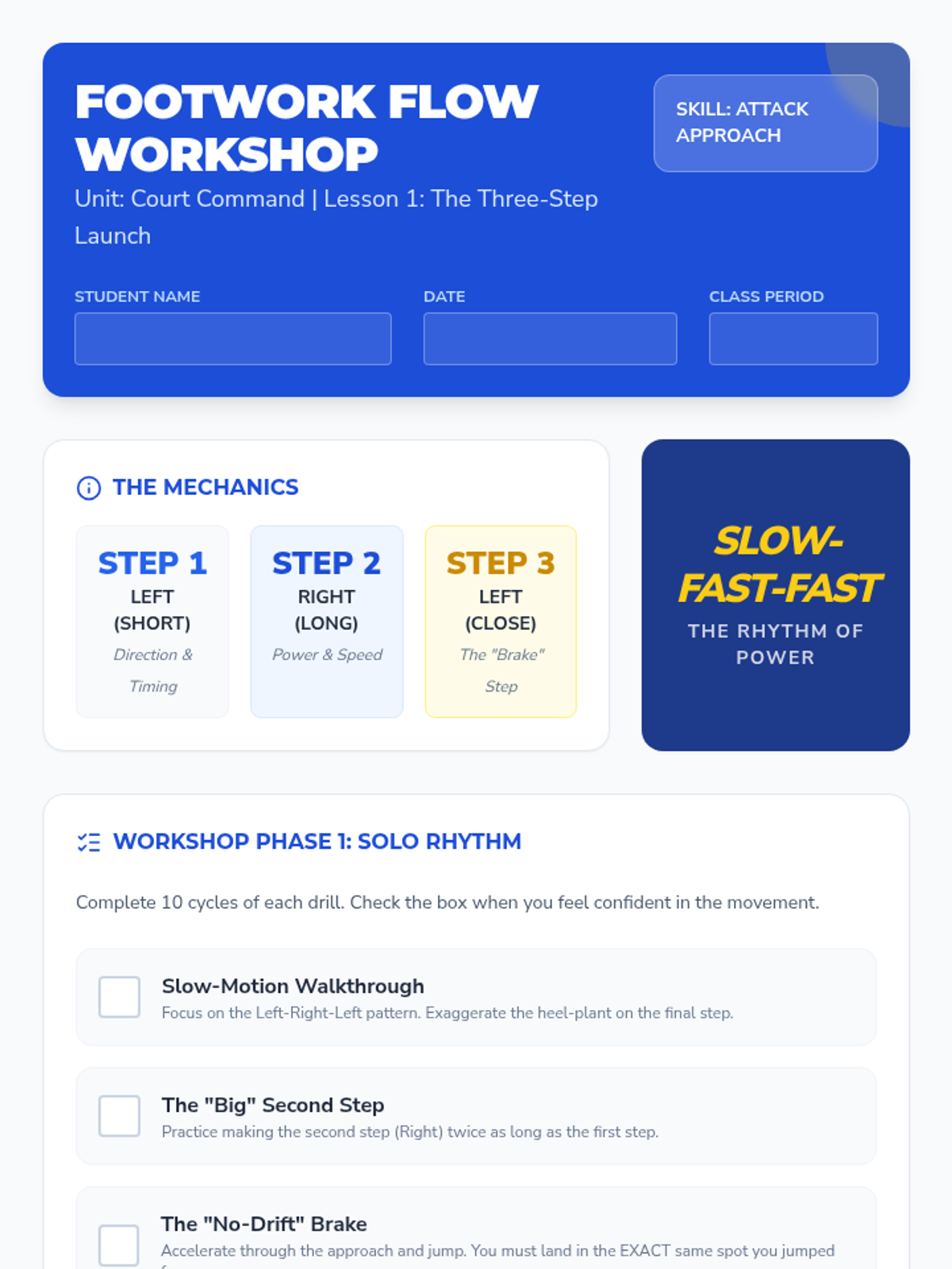 A comprehensive 9th-grade volleyball sequence focusing on the transition from defensive play to an aggressive offensive attack. Students master the three-step approach, arm swing mechanics, timing, and team-wide transition strategies to transform their game from simple returns to tactical scoring.