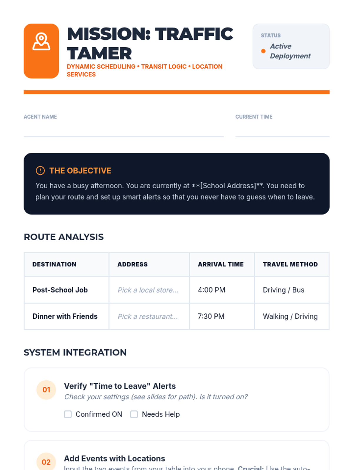 A comprehensive sequence for 12th-grade students focusing on utilizing mobile assistive technology for calendar management, transitioning from basic voice input to complex real-world navigation and troubleshooting.