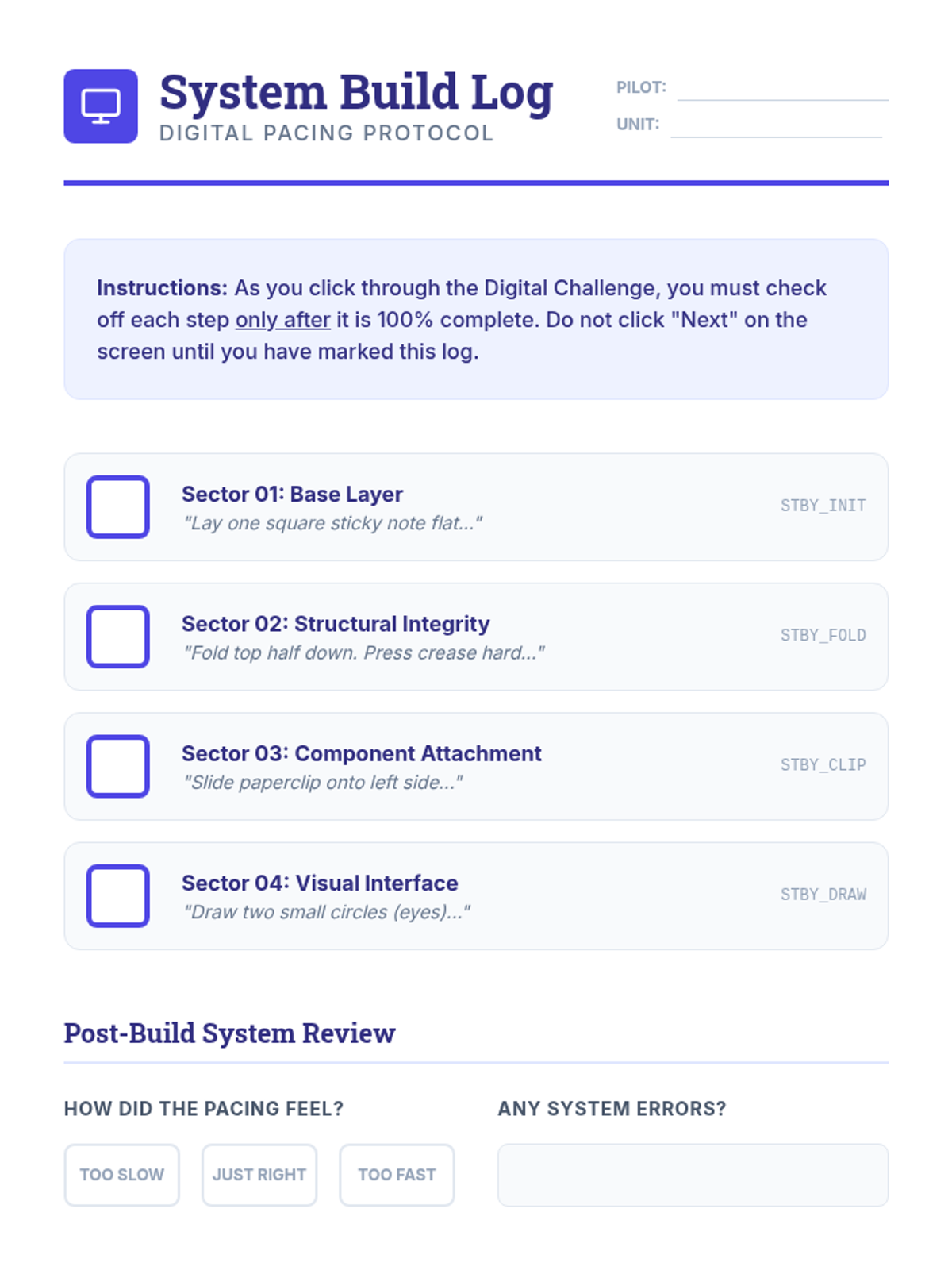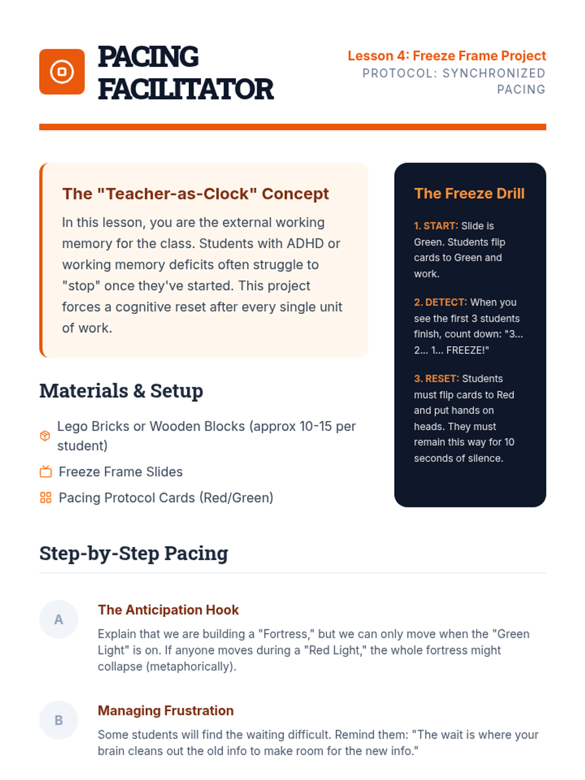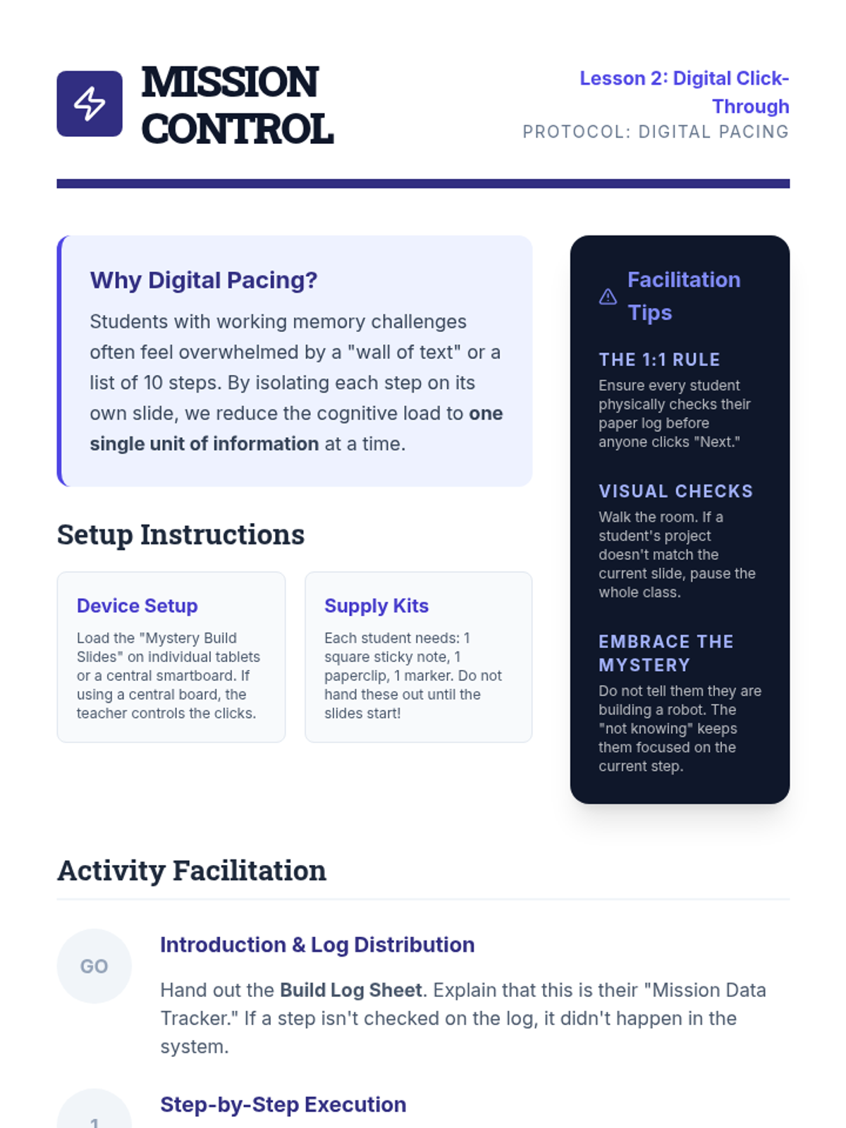 A specialized sequence for 5th-grade students focusing on working memory support through task segmentation. Students learn to break complex tasks into single steps, using digital pacing and physical checklists to manage cognitive load and reduce anxiety.