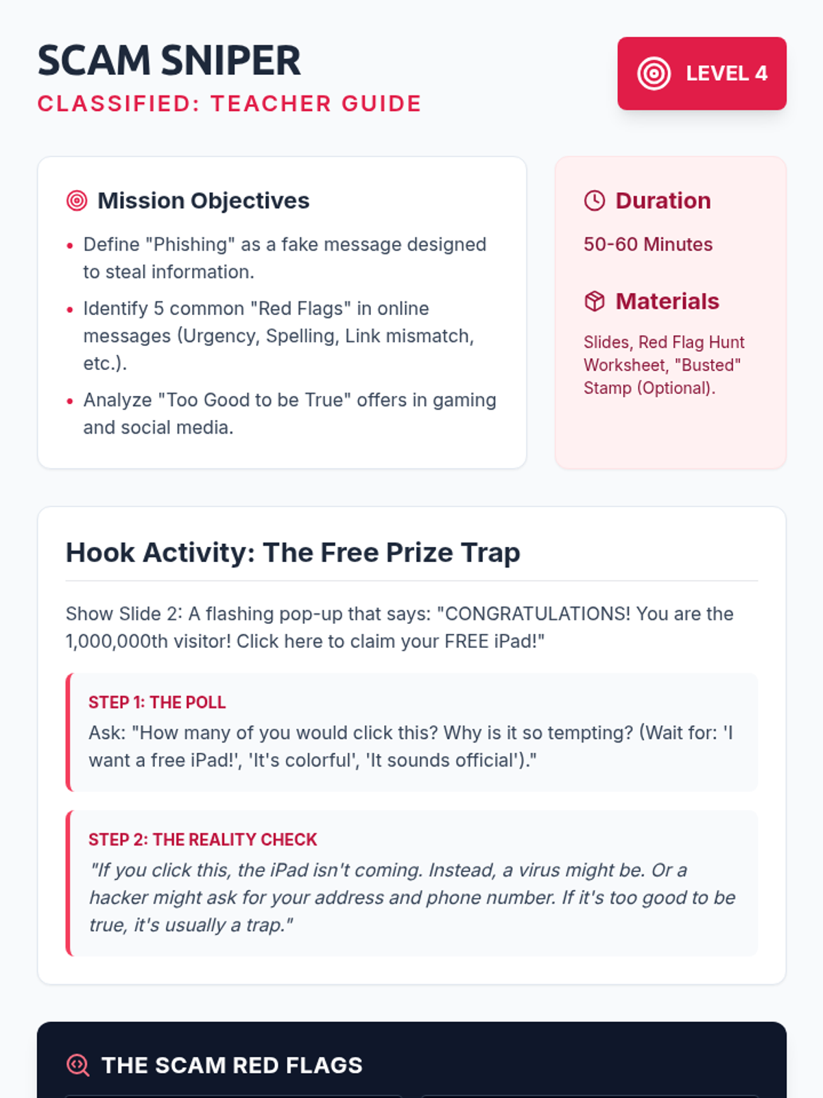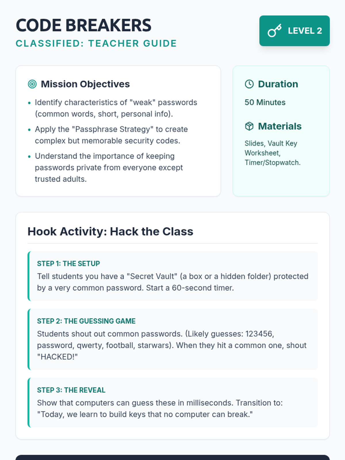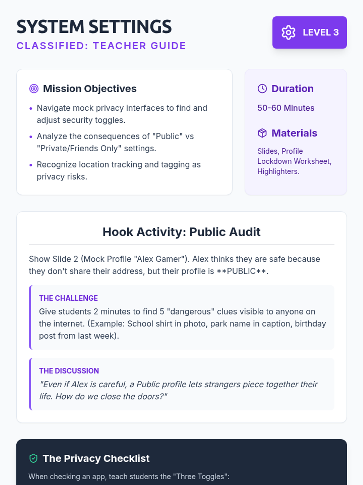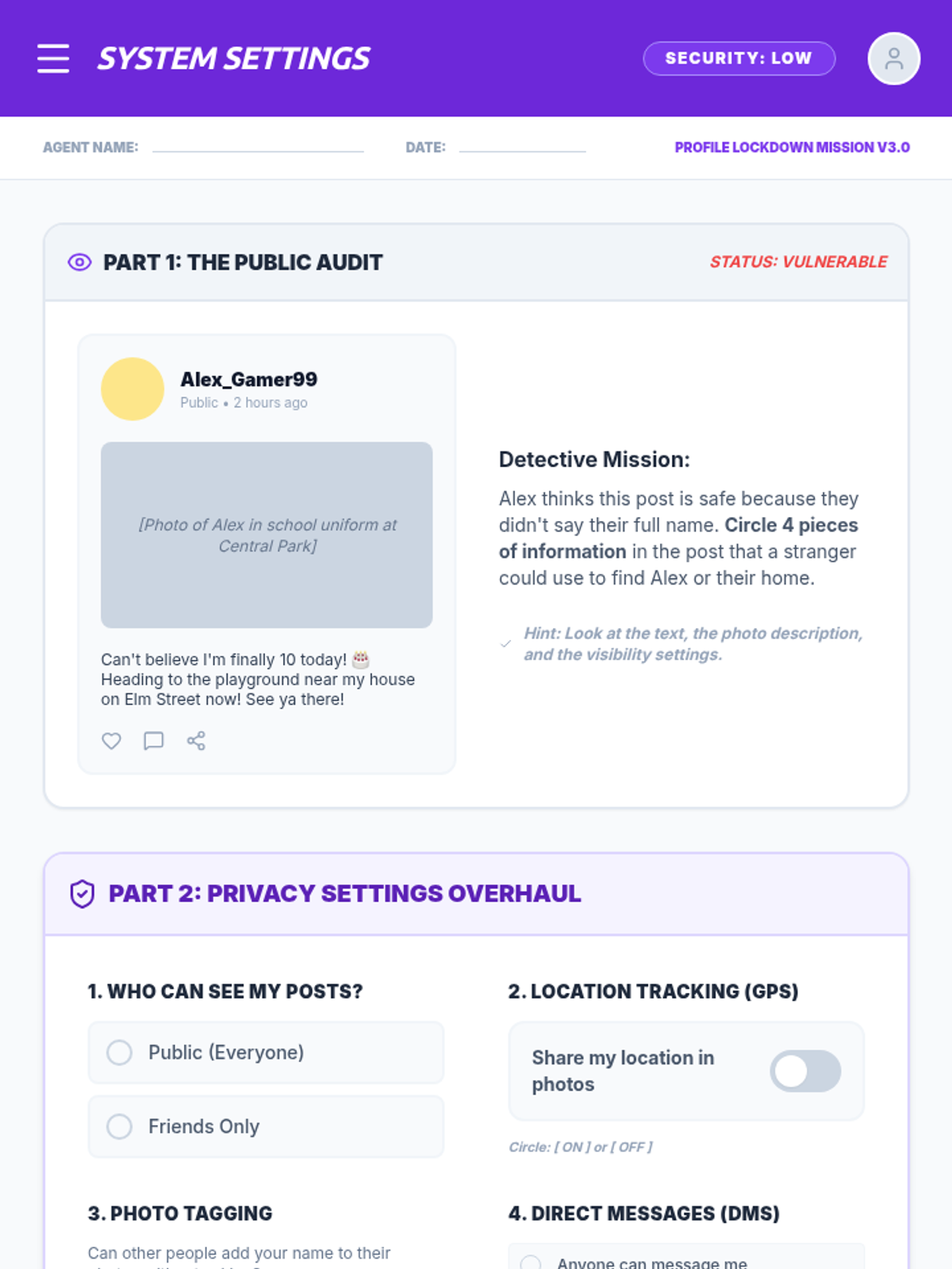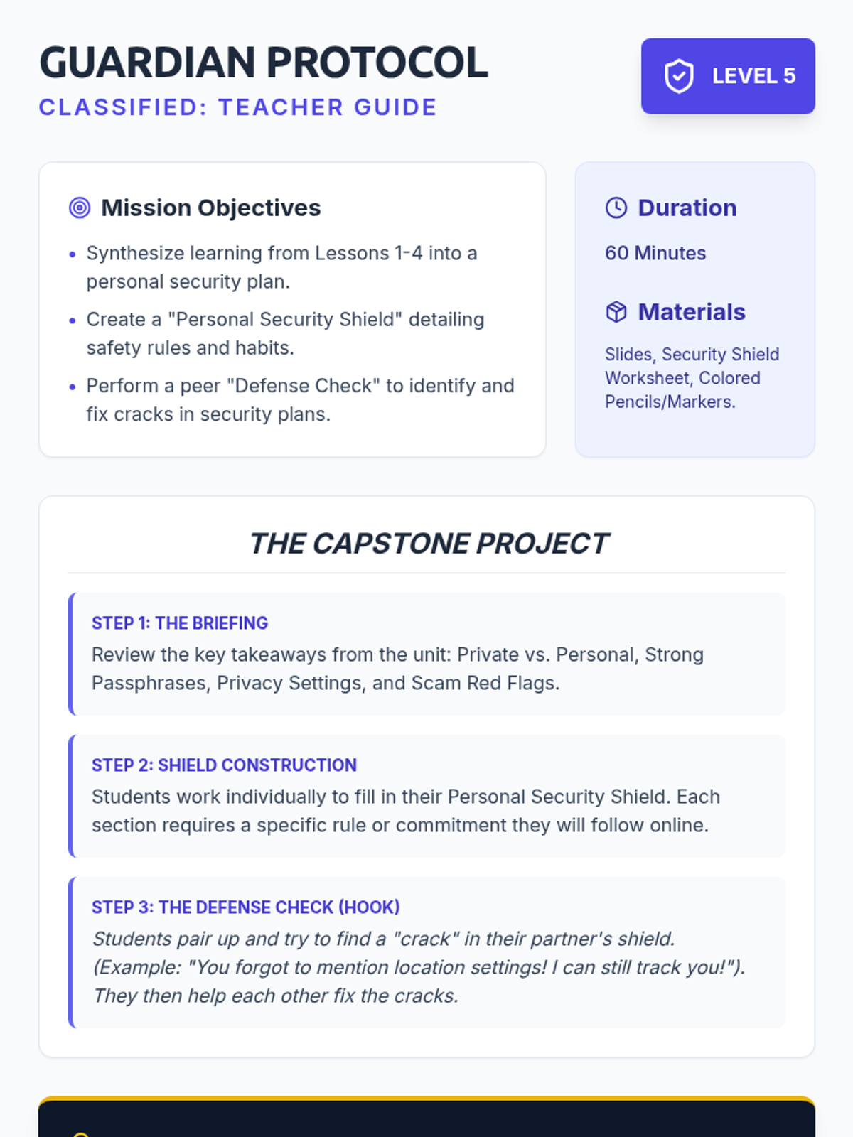 A comprehensive 4th-grade sequence on digital literacy and online safety, focusing on privacy, passwords, settings, and scam recognition through a 'Cyber Spy' theme.
