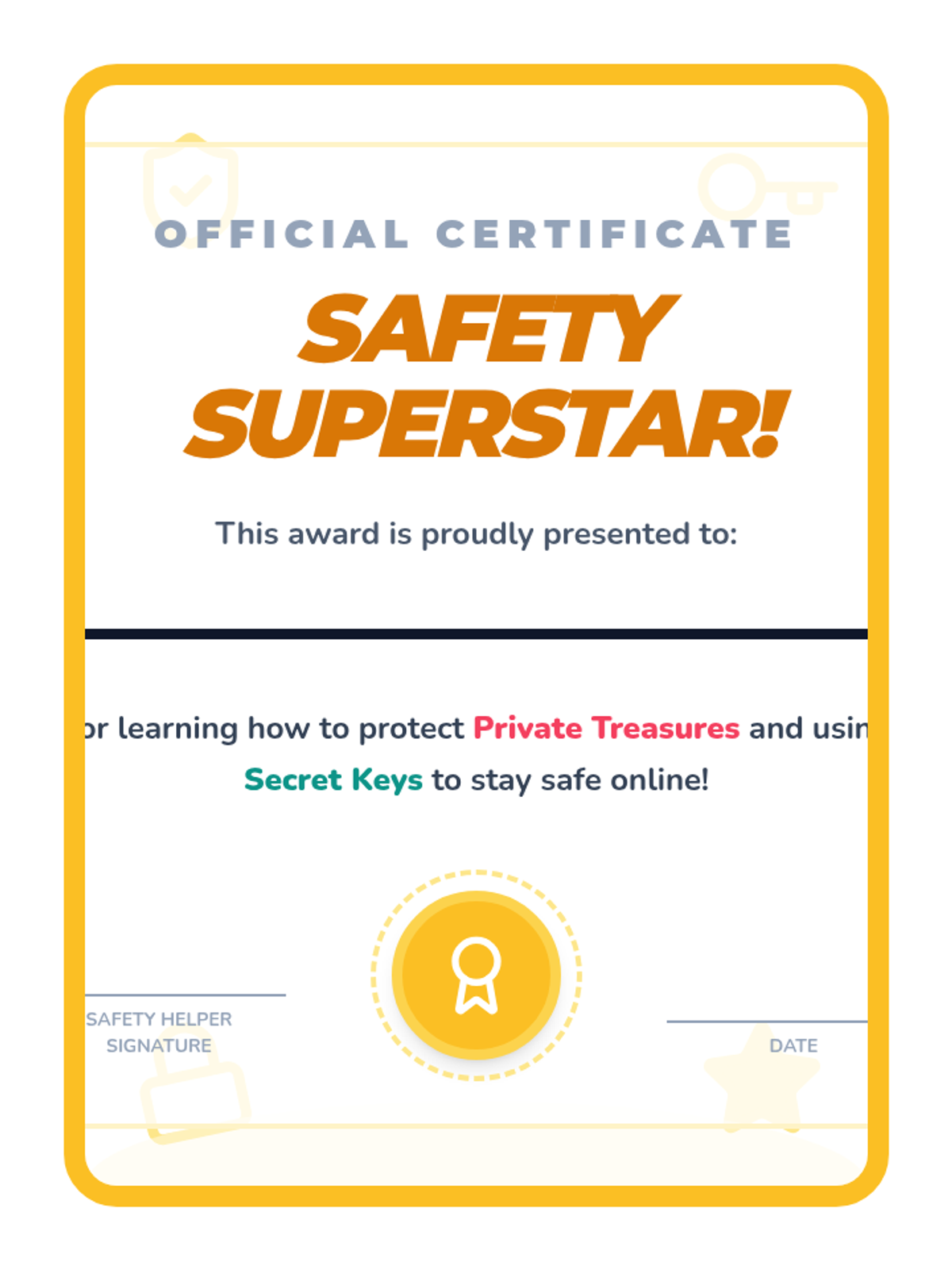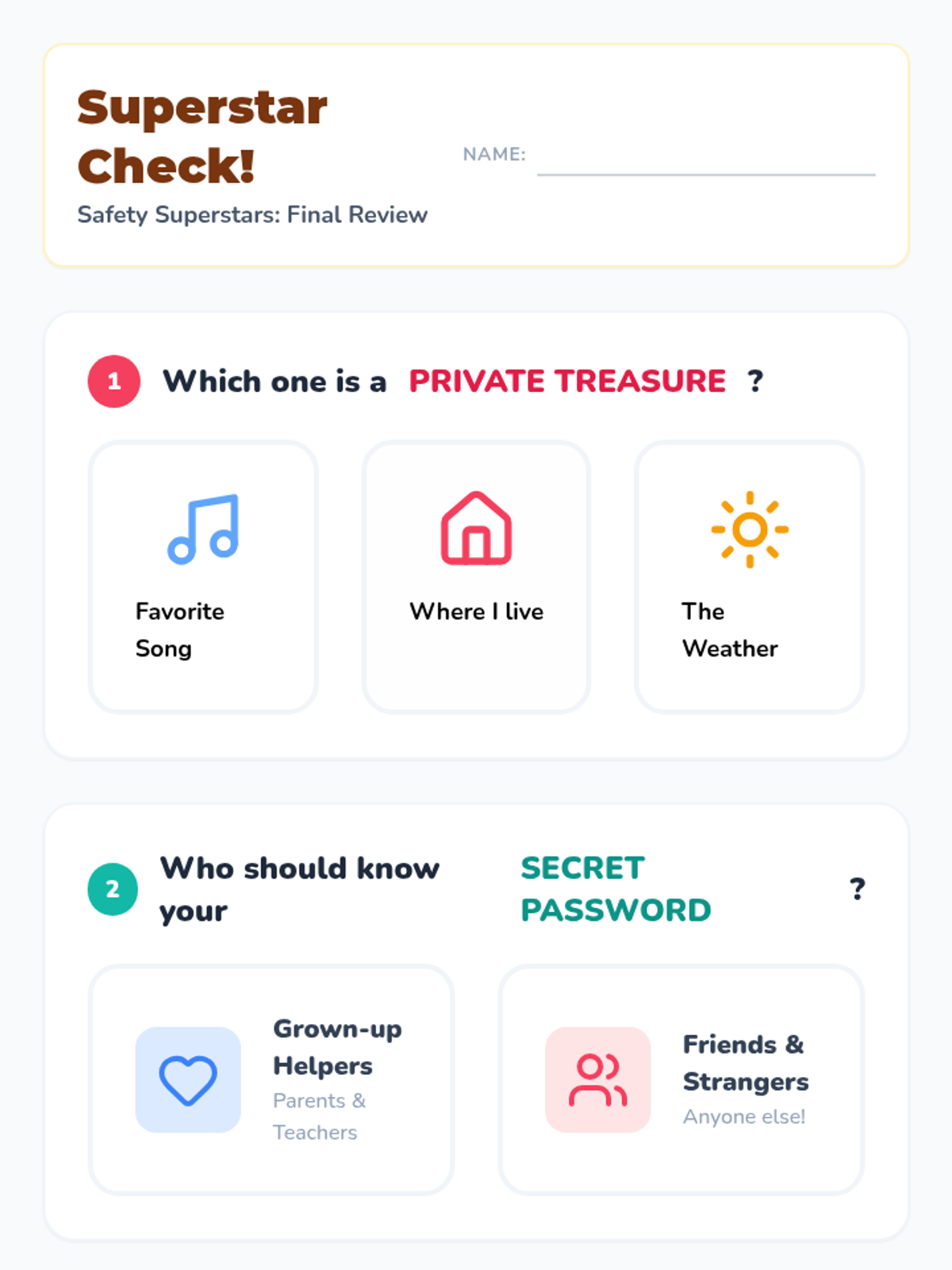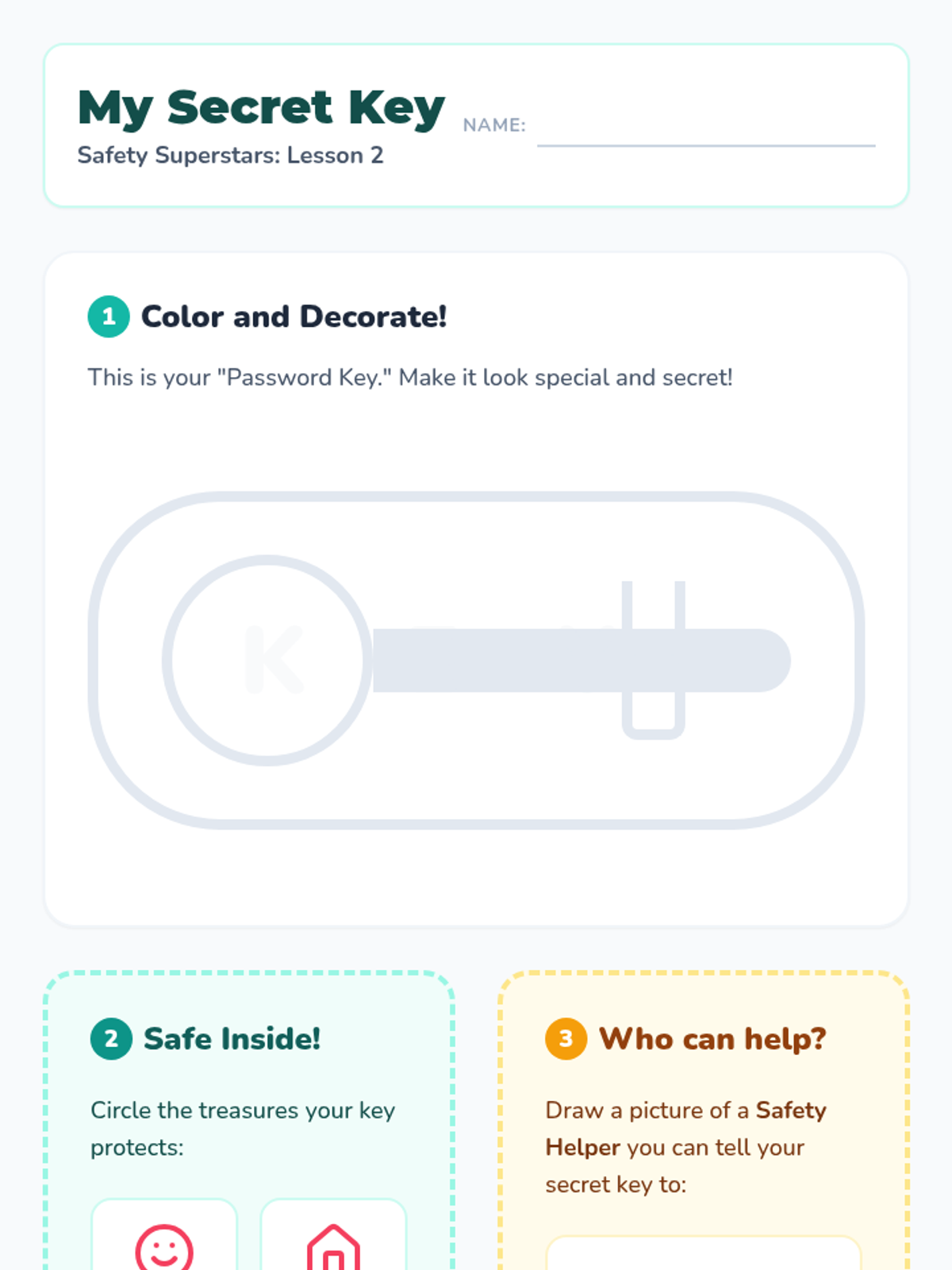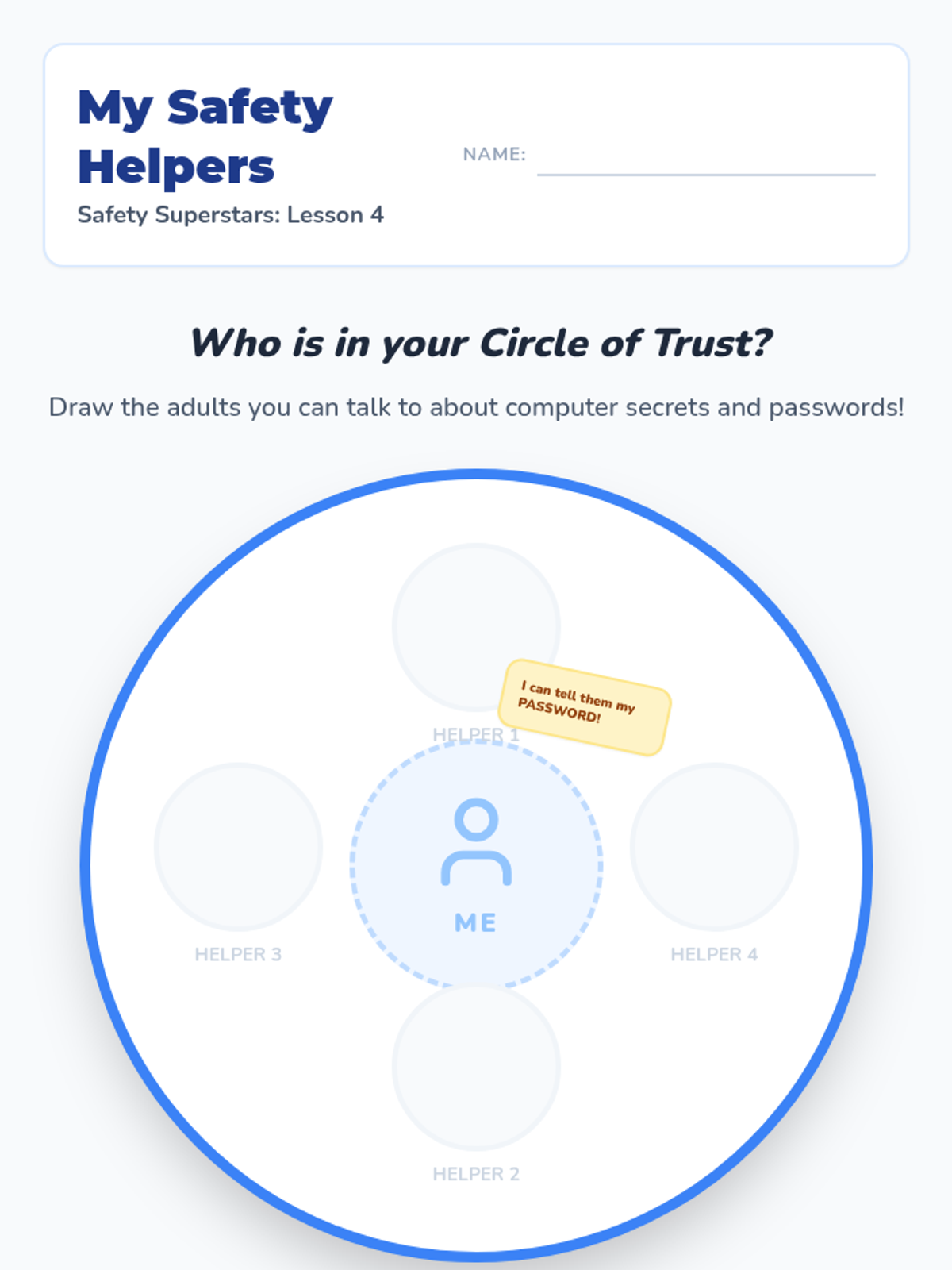 A foundational sequence for Kindergarten students exploring digital privacy and security. Students learn to distinguish between public and private information, understand the purpose of passwords, and identify trusted adults for online help.