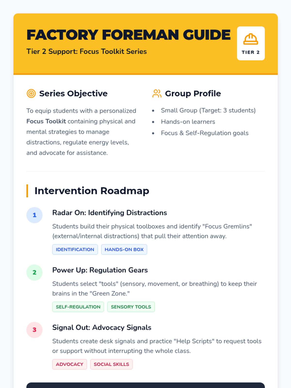 A Tier 2 intervention series designed for small groups to improve focus, self-regulation, and self-advocacy through the creation of a hands-on 'Focus Toolkit'. Students learn to identify distractions, use regulation strategies, and advocate for their needs in the classroom.