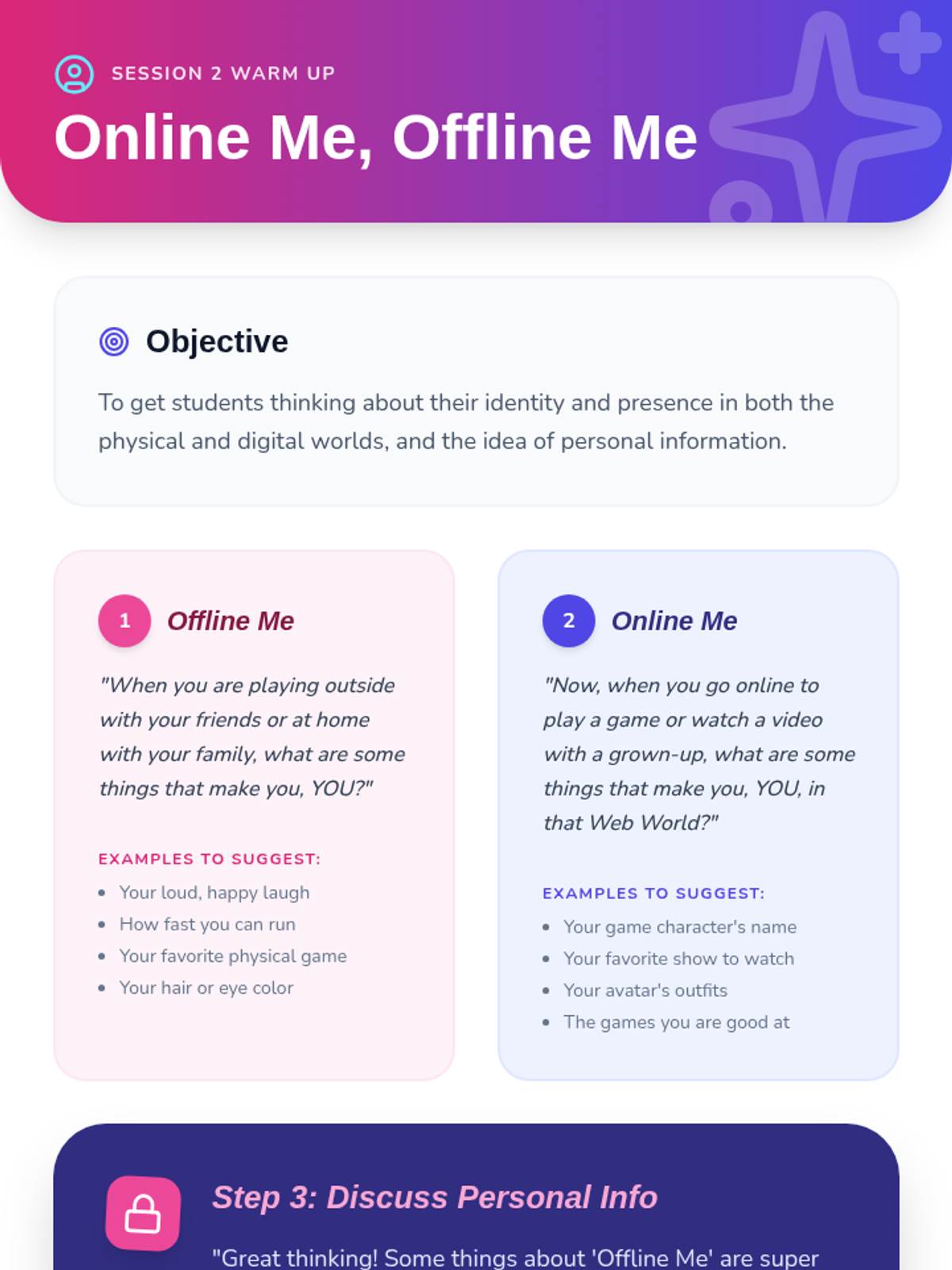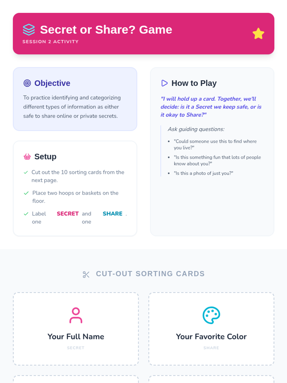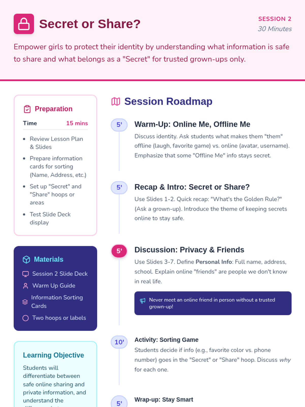 A 9-week program for girls aged 6-9 focused on online safety, digital citizenship, and empowered web exploration. Each session builds foundational skills to navigate the digital world confidently and safely.