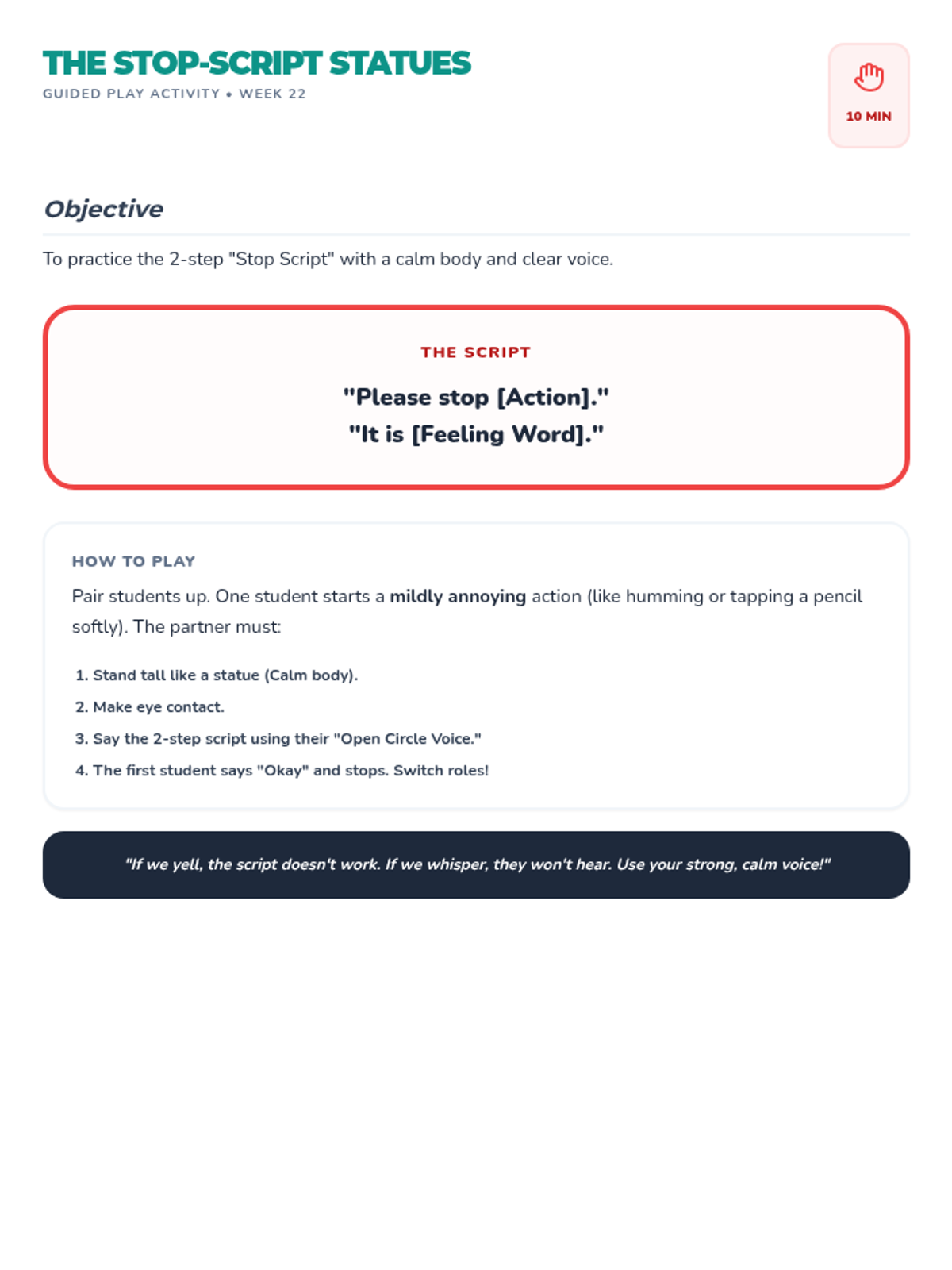 A 10-session sensory regulation intervention for small groups, utilizing SkillStreaming techniques to replace crashing and pushing behaviors with isometric squeezes and fidget use. The program, titled 'Pressure Pros', provides explicit steps for counselors to guide students through awareness, skill acquisition, and real-world application.