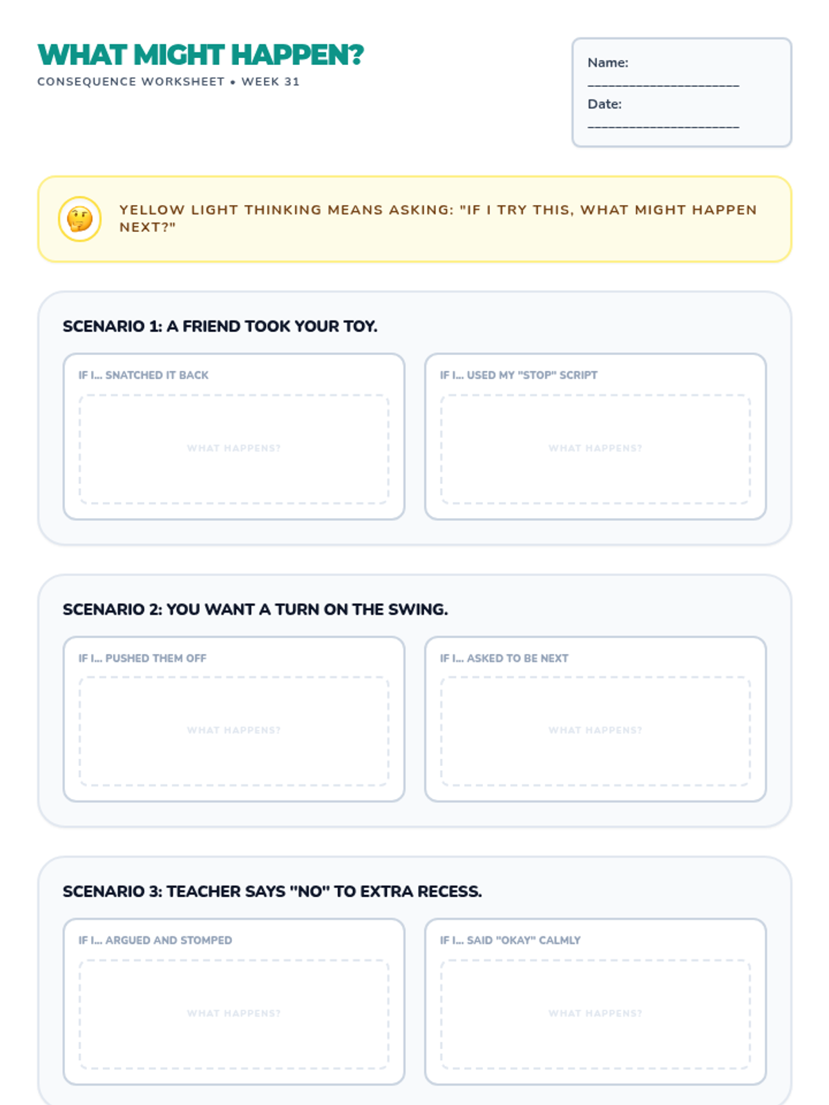 A three-part 1-on-1 counseling sequence for first graders focused on emotional regulation, peer conflict, and following directions through an 'Explorer' theme.