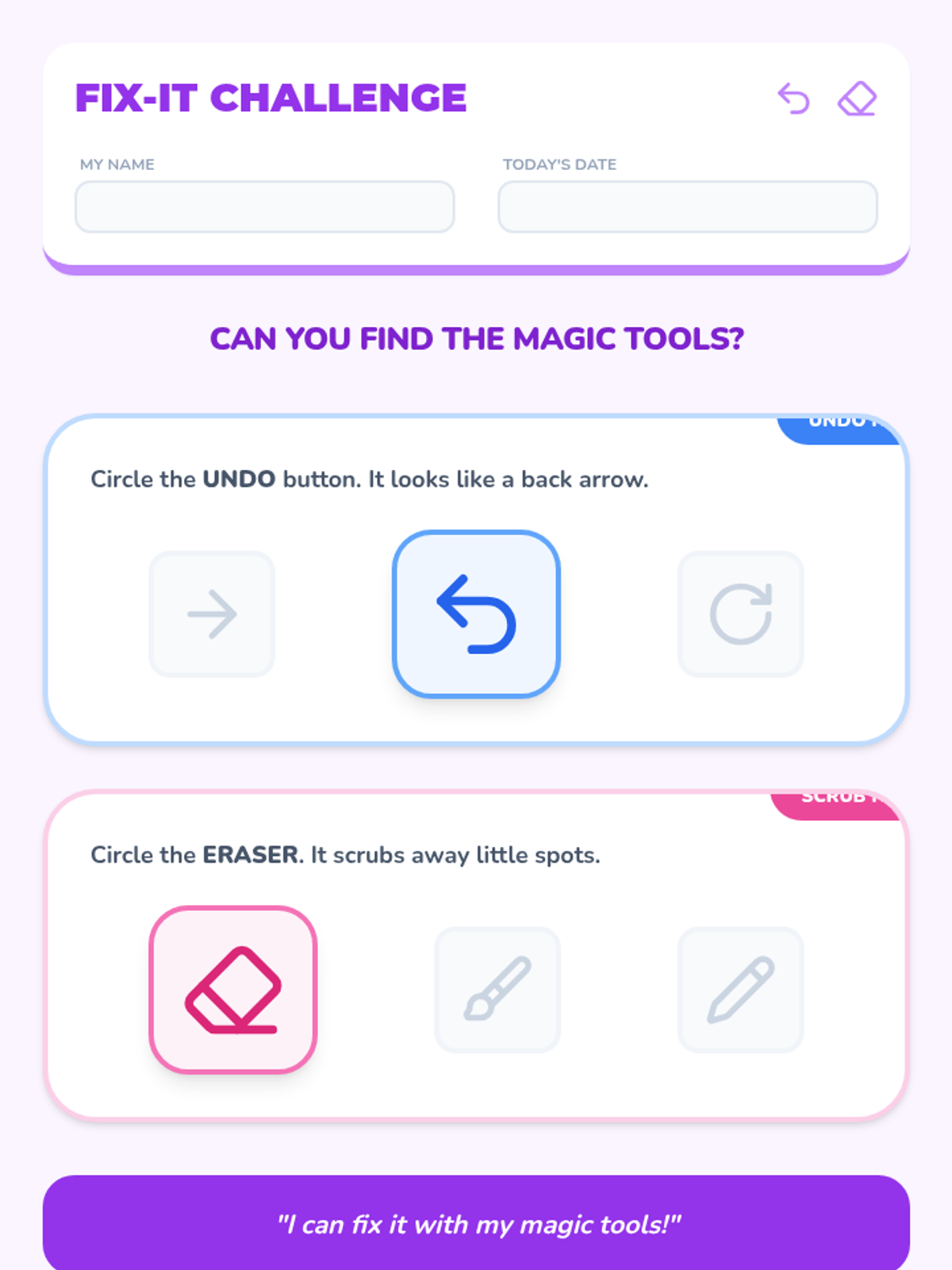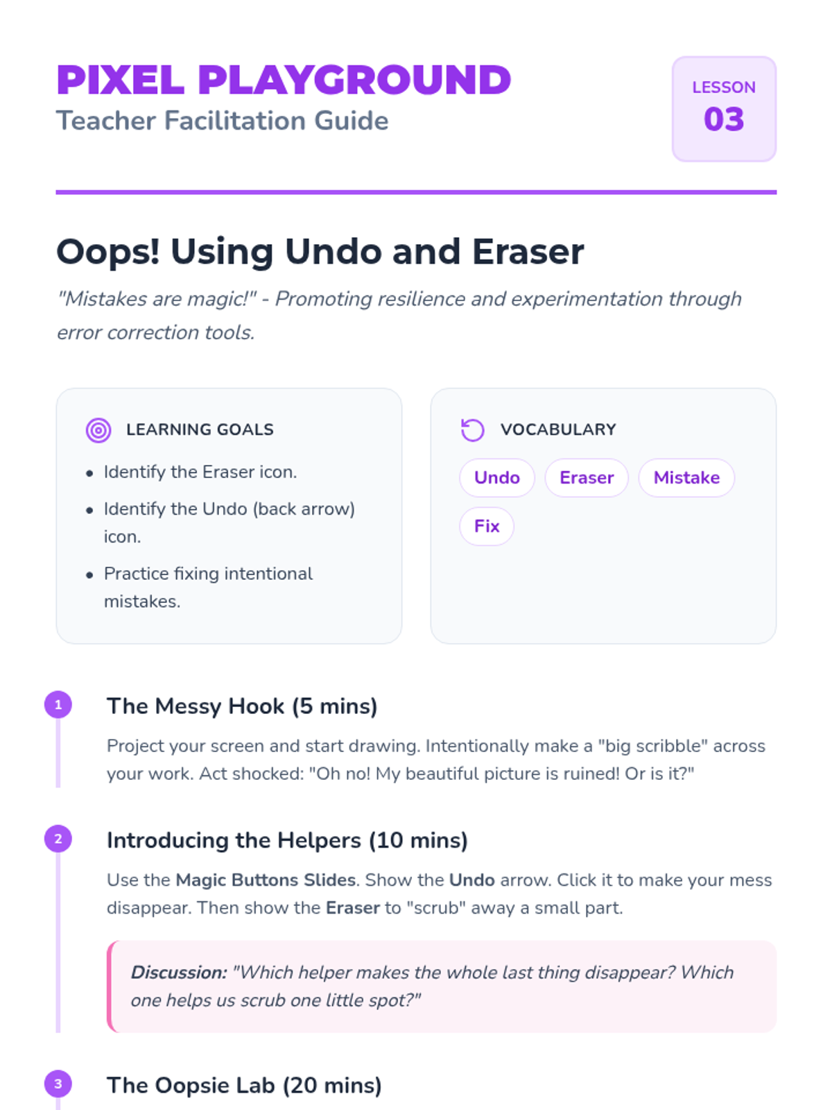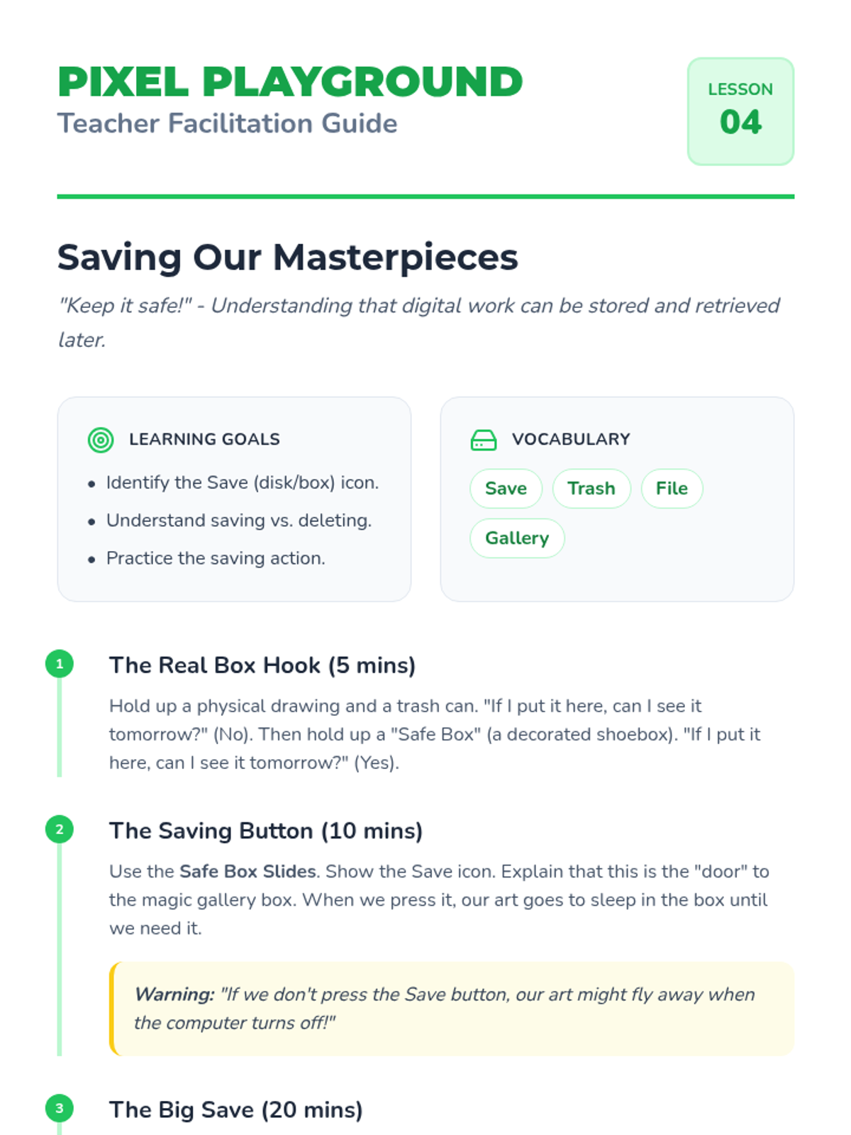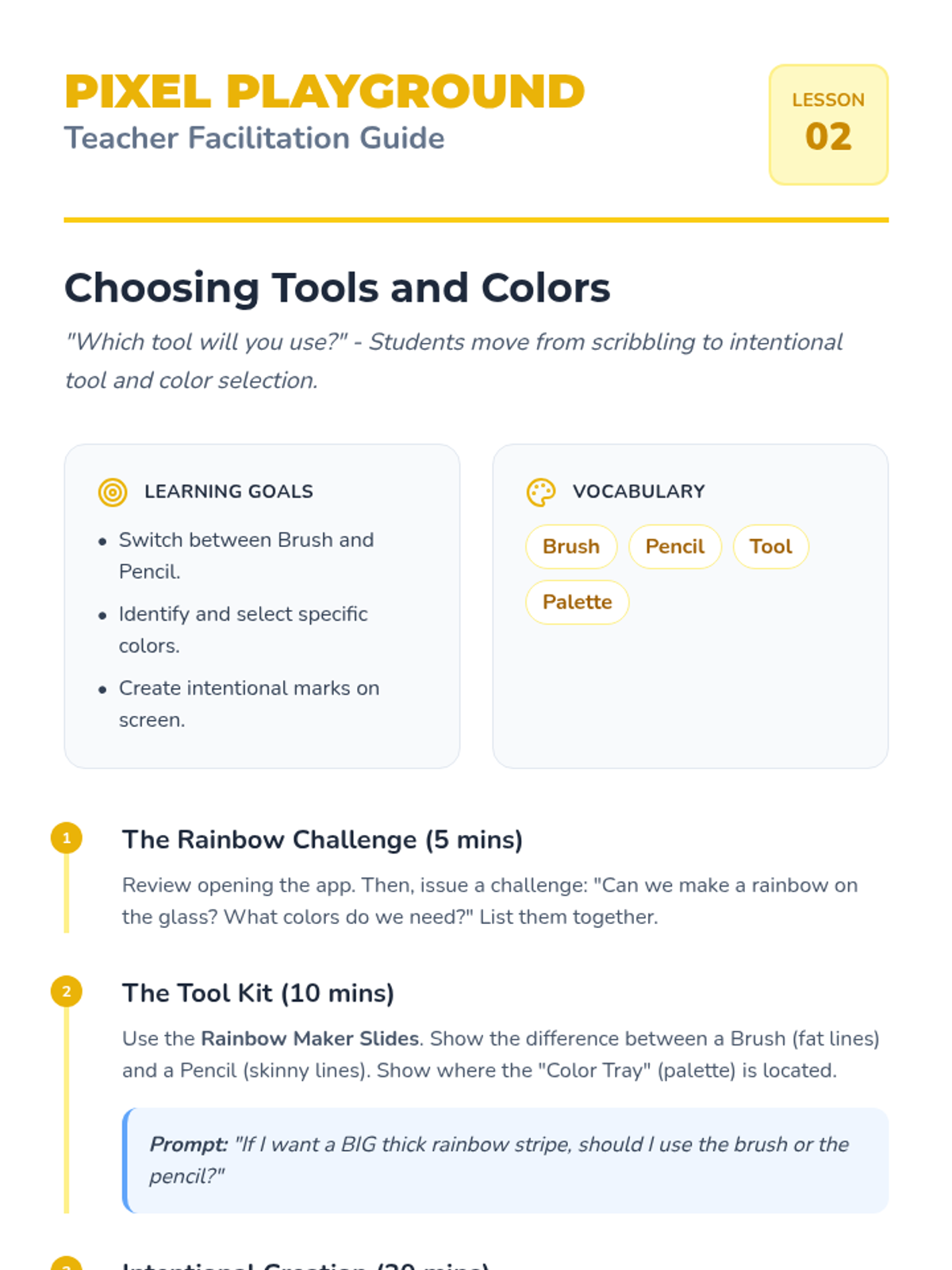 A project-based sequence for Pre-K students to learn basic digital creative tools, from launching apps to saving and showcasing digital art. Students develop mouse/touch skills and an understanding of file management through a 'Pixel Playground' theme.