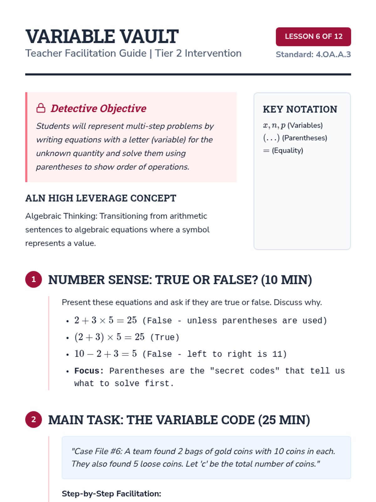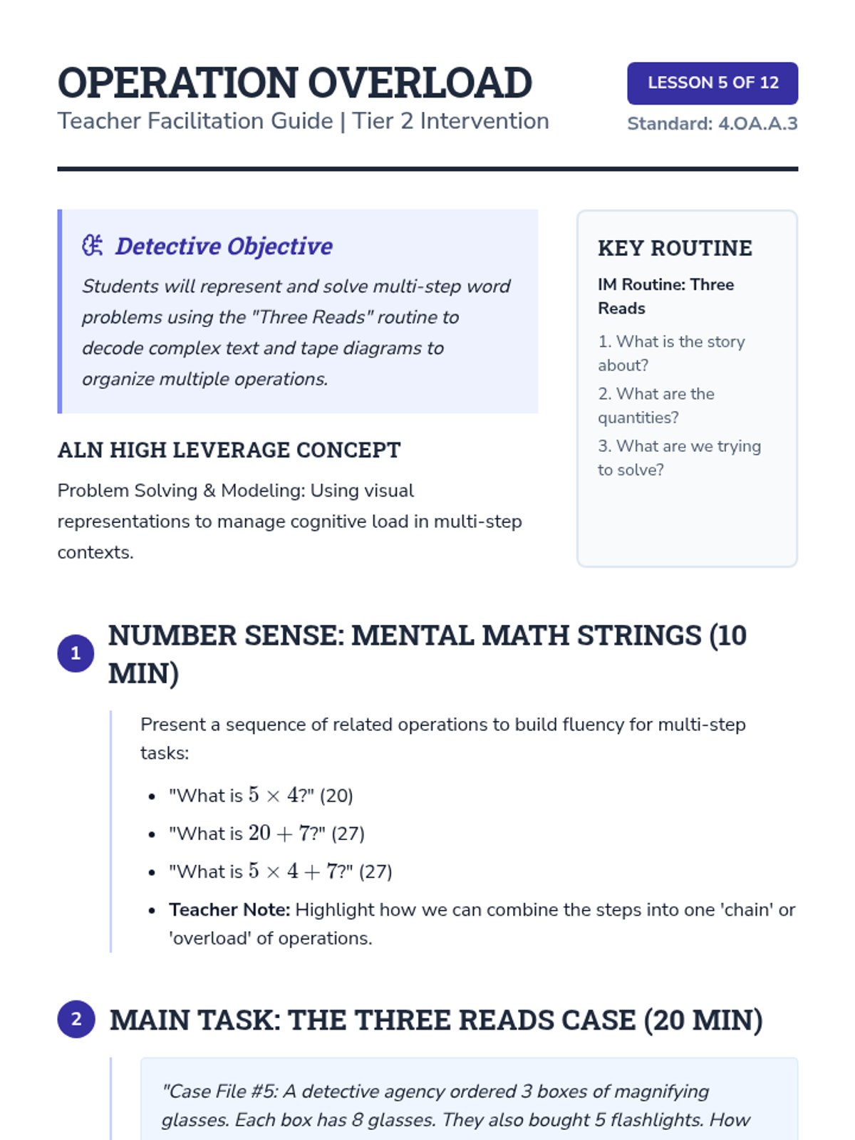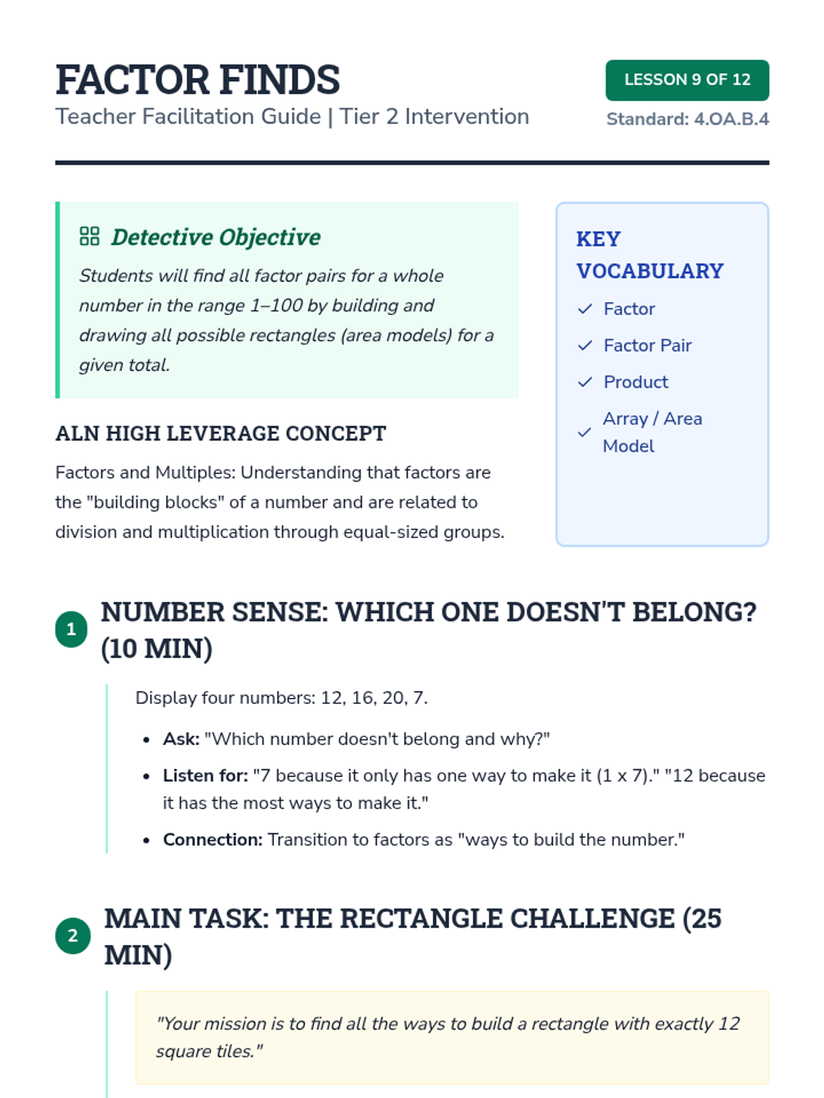 A 12-lesson Tier 2 intervention sequence focused on 4th-grade algebraic thinking standards 4.OA.A and 4.OA.B. The sequence uses All Learners Network (ALN) high-leverage concepts and Illustrative Mathematics (IM) methods like tape diagrams and number talks to build multiplicative reasoning.