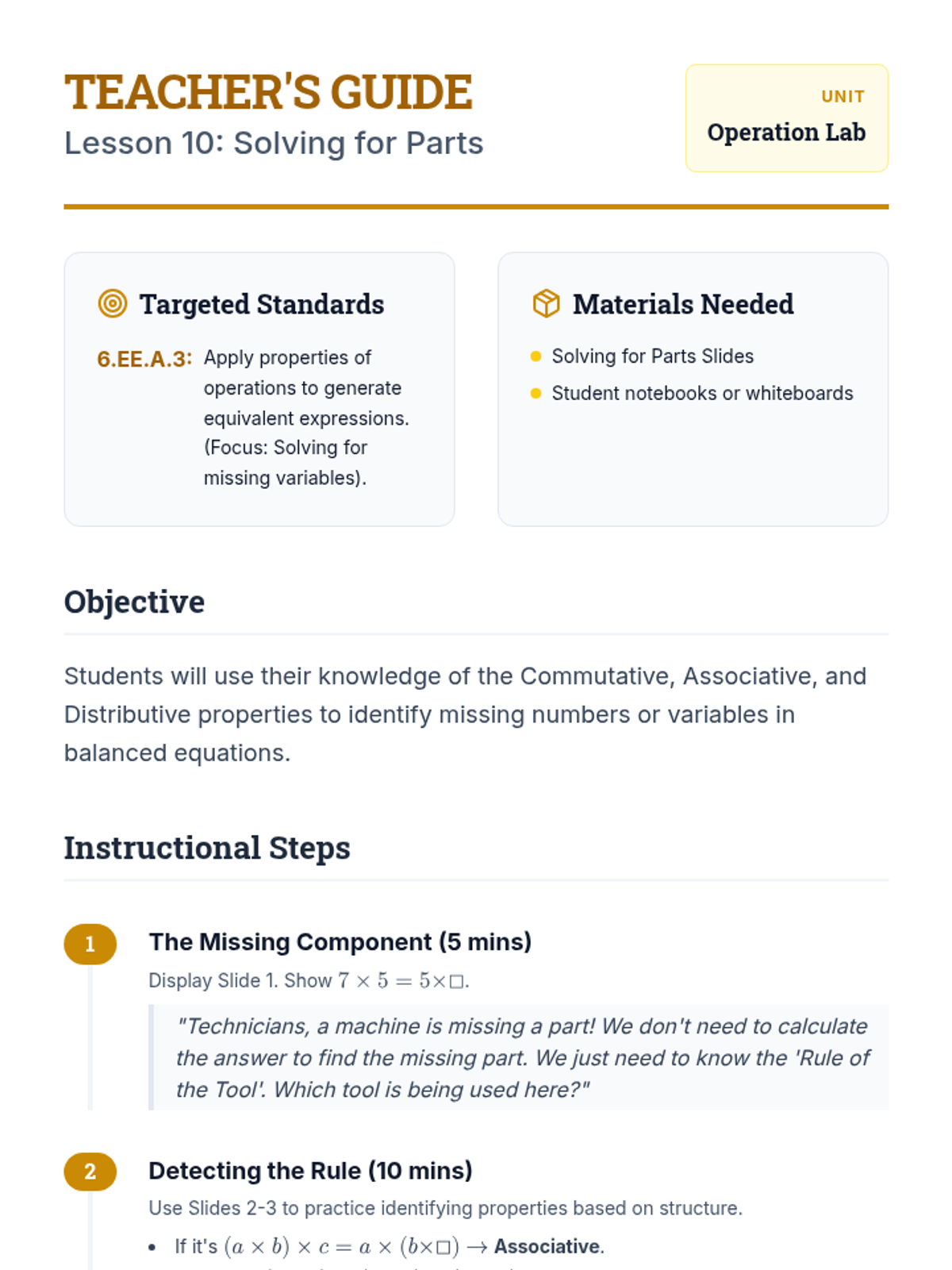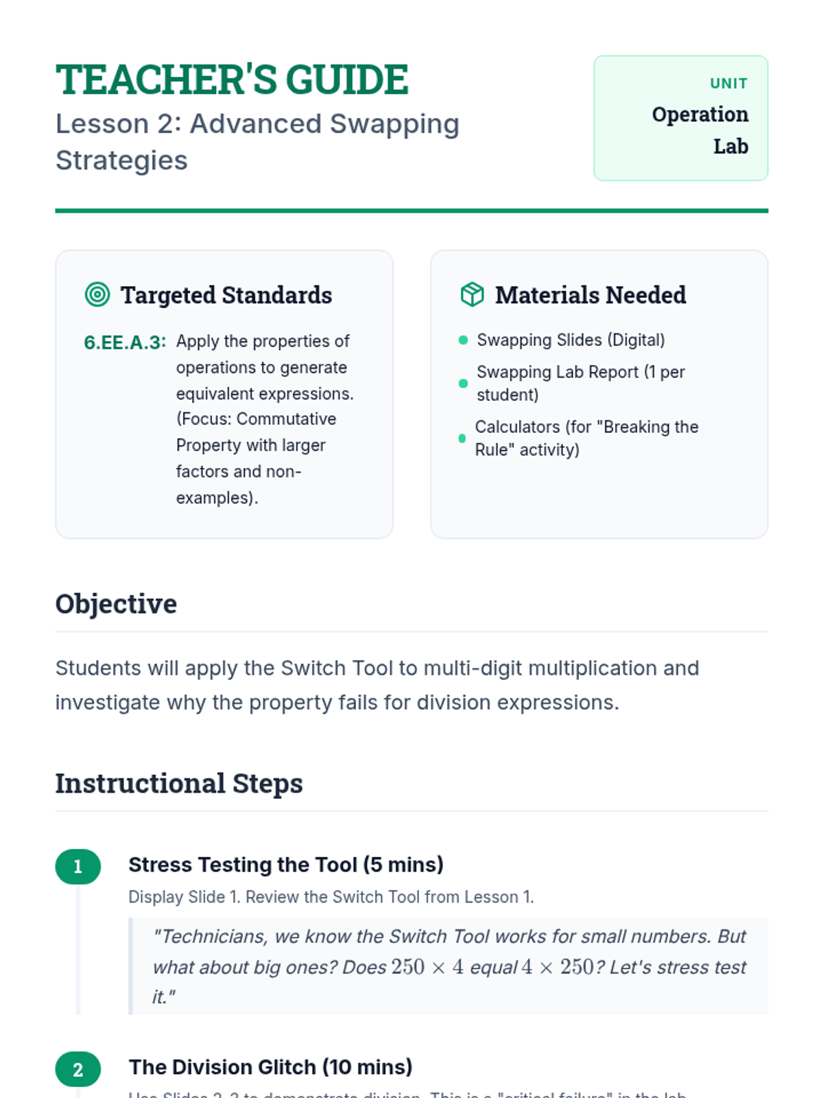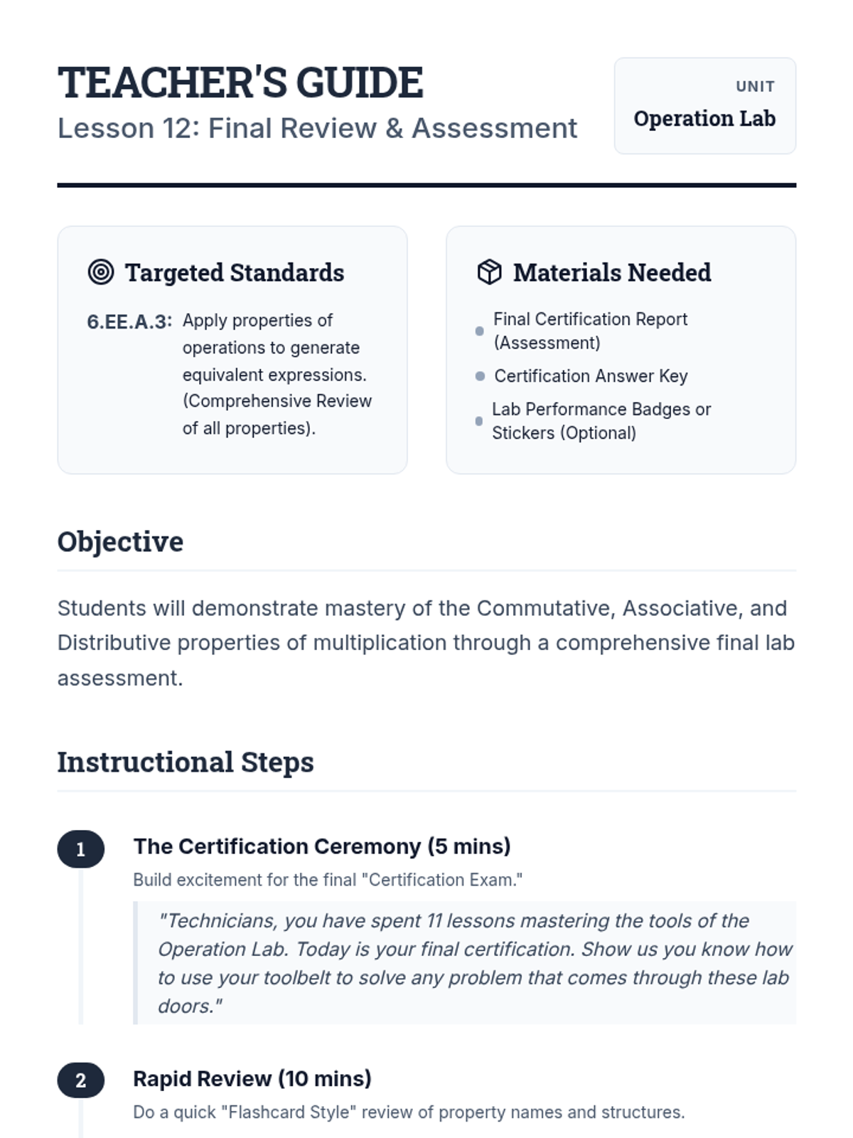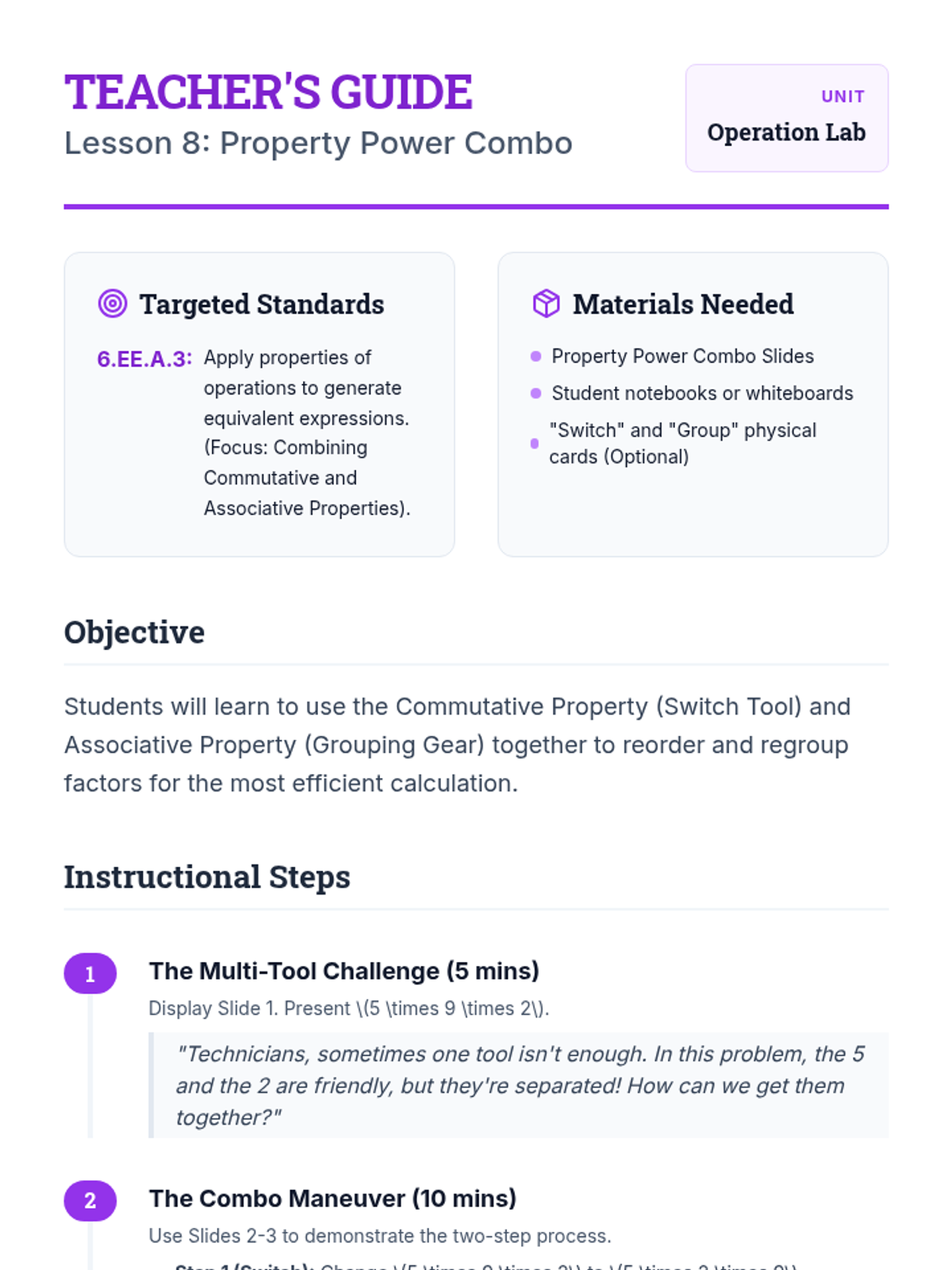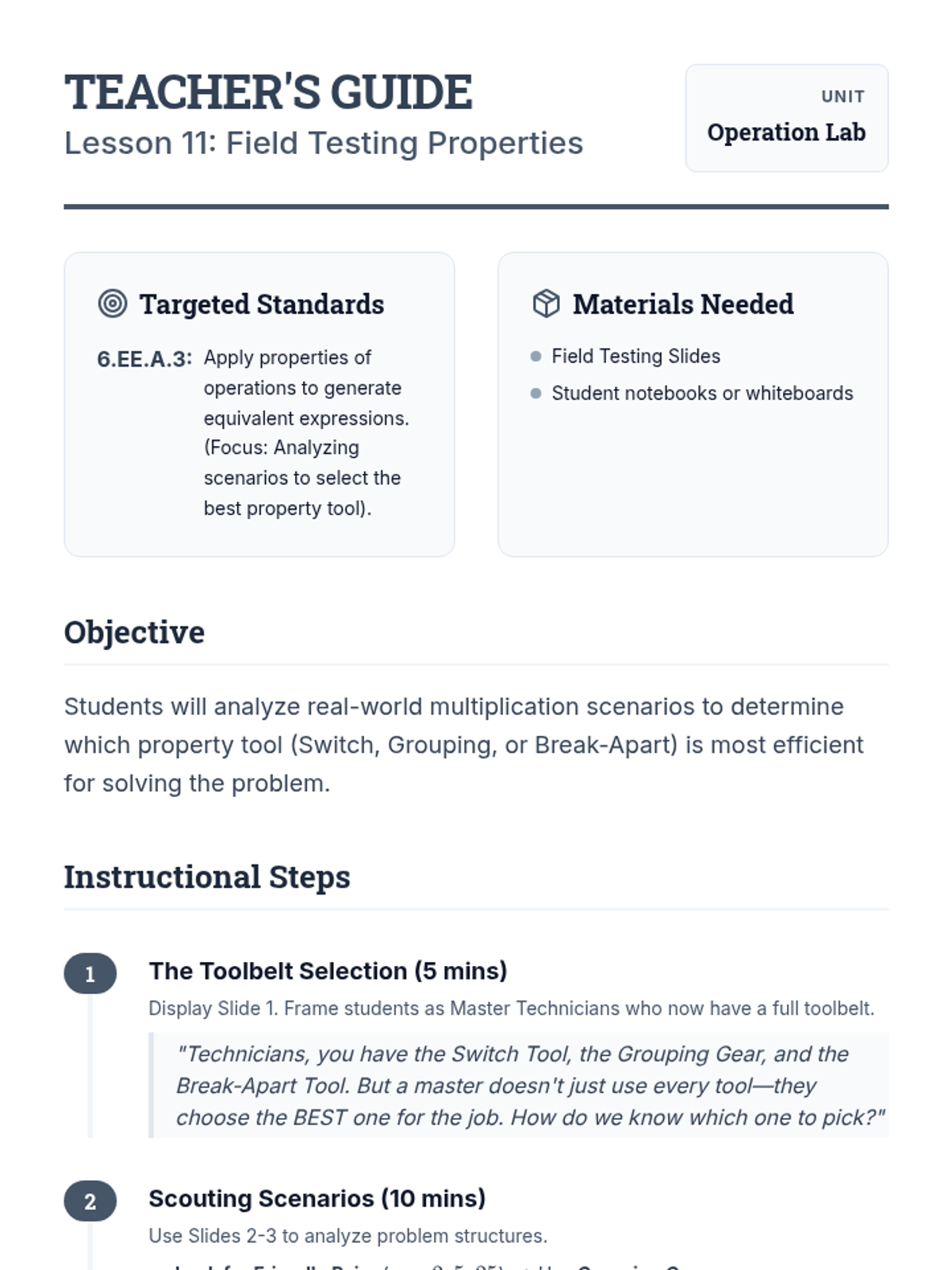 A 12-lesson Tier 2 intervention unit for 6th-grade students focusing on the properties of operations (Commutative, Associative, and Distributive). Students learn to use these properties as "tools" in an "Operation Lab" to simplify multiplication and division tasks, progressing from visual models to mental math applications.