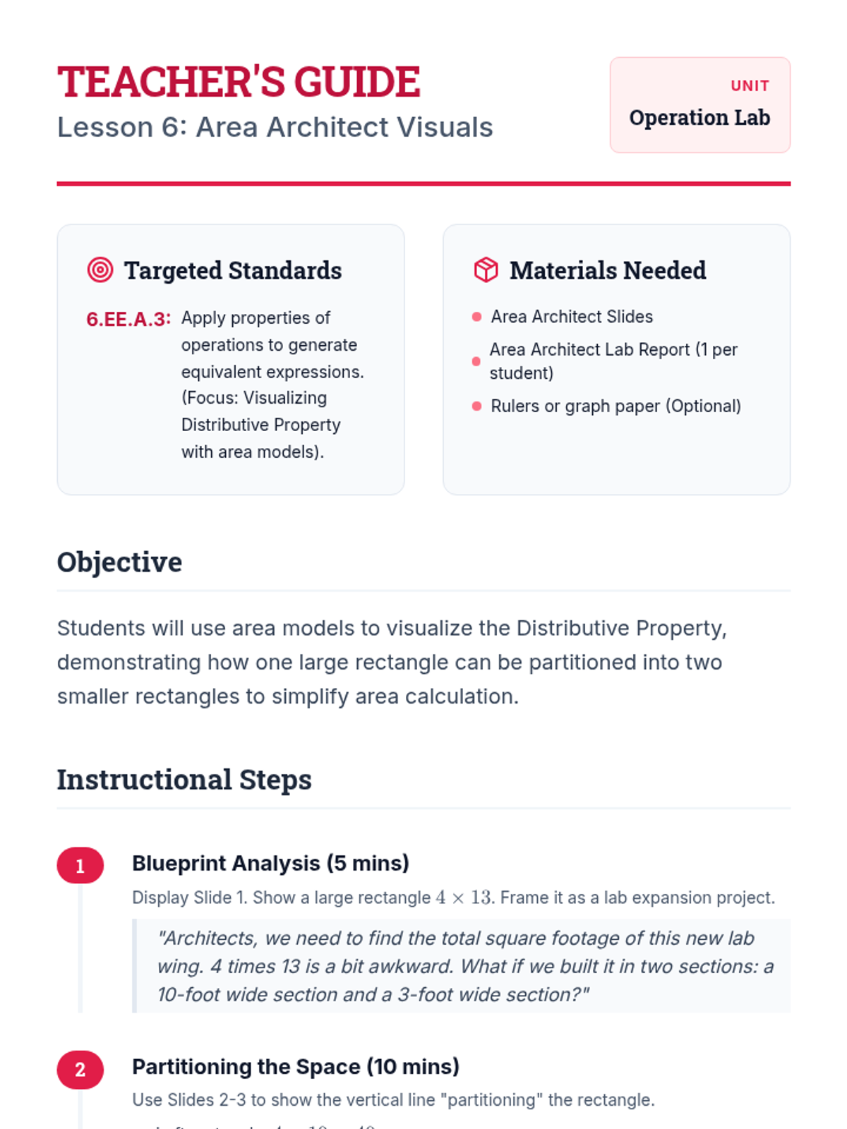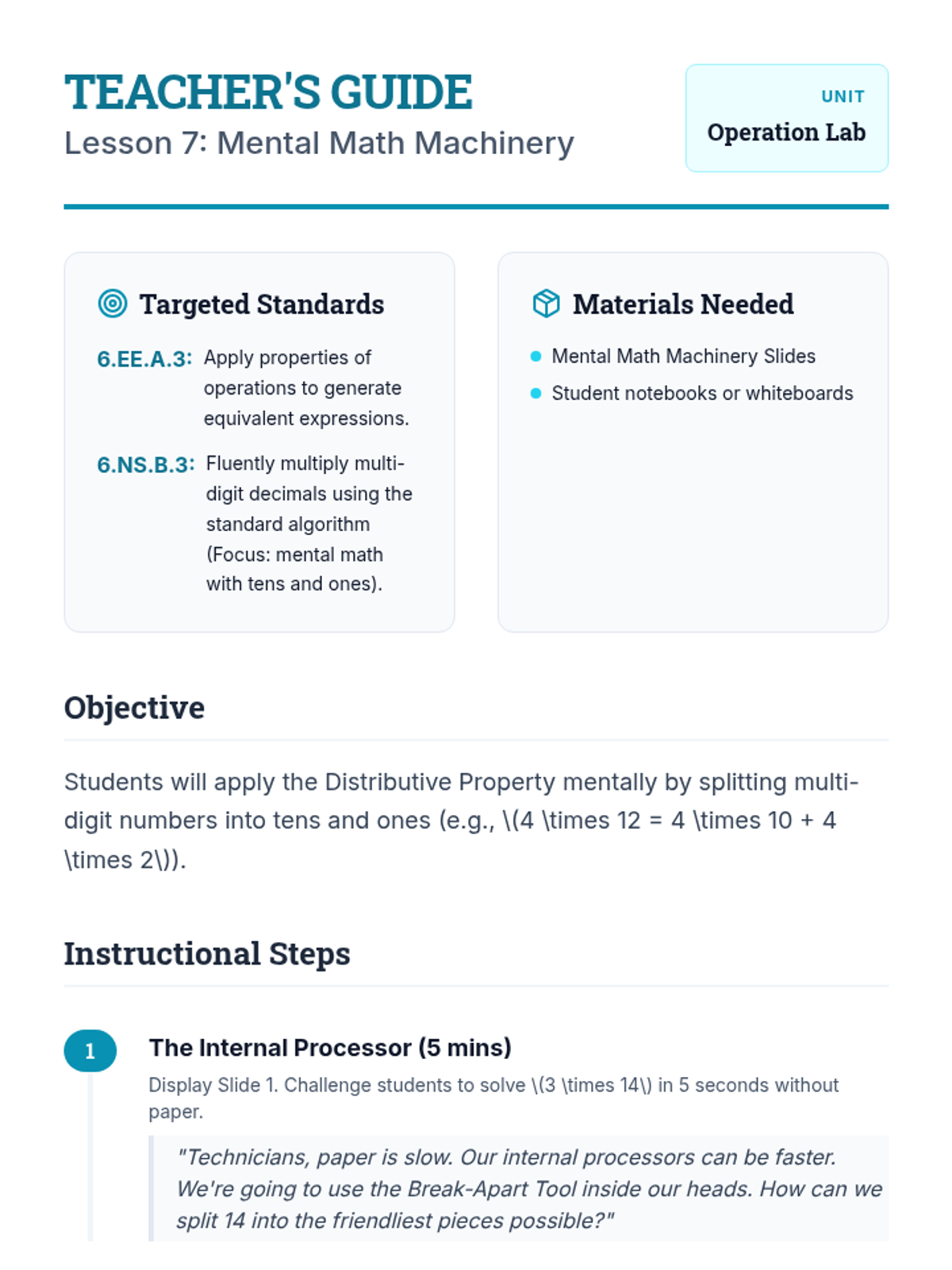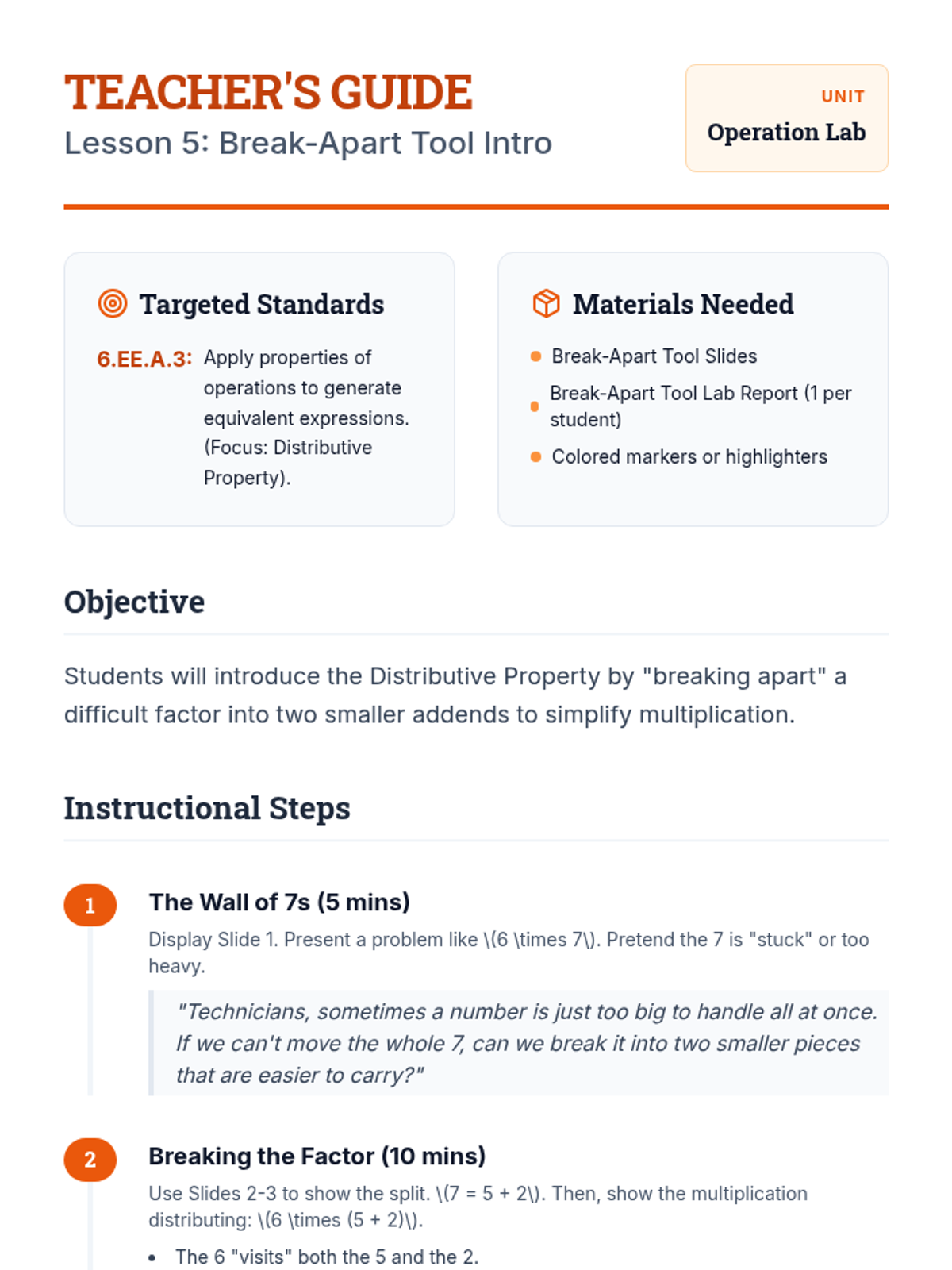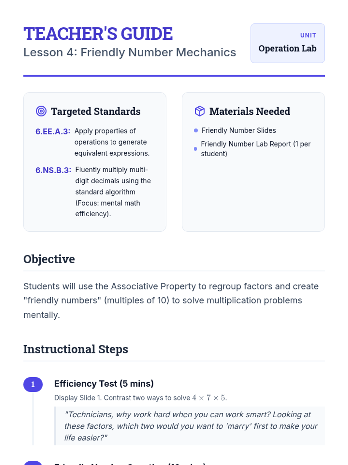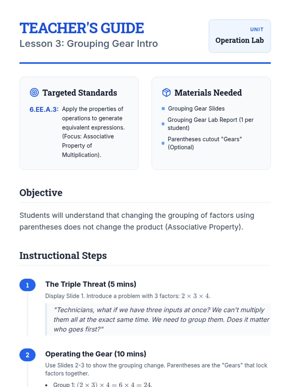 A 12-lesson Tier 2 intervention unit for 6th-grade students focusing on the properties of operations (Commutative, Associative, and Distributive). Students learn to use these properties as "tools" in an "Operation Lab" to simplify multiplication and division tasks, progressing from visual models to mental math applications.