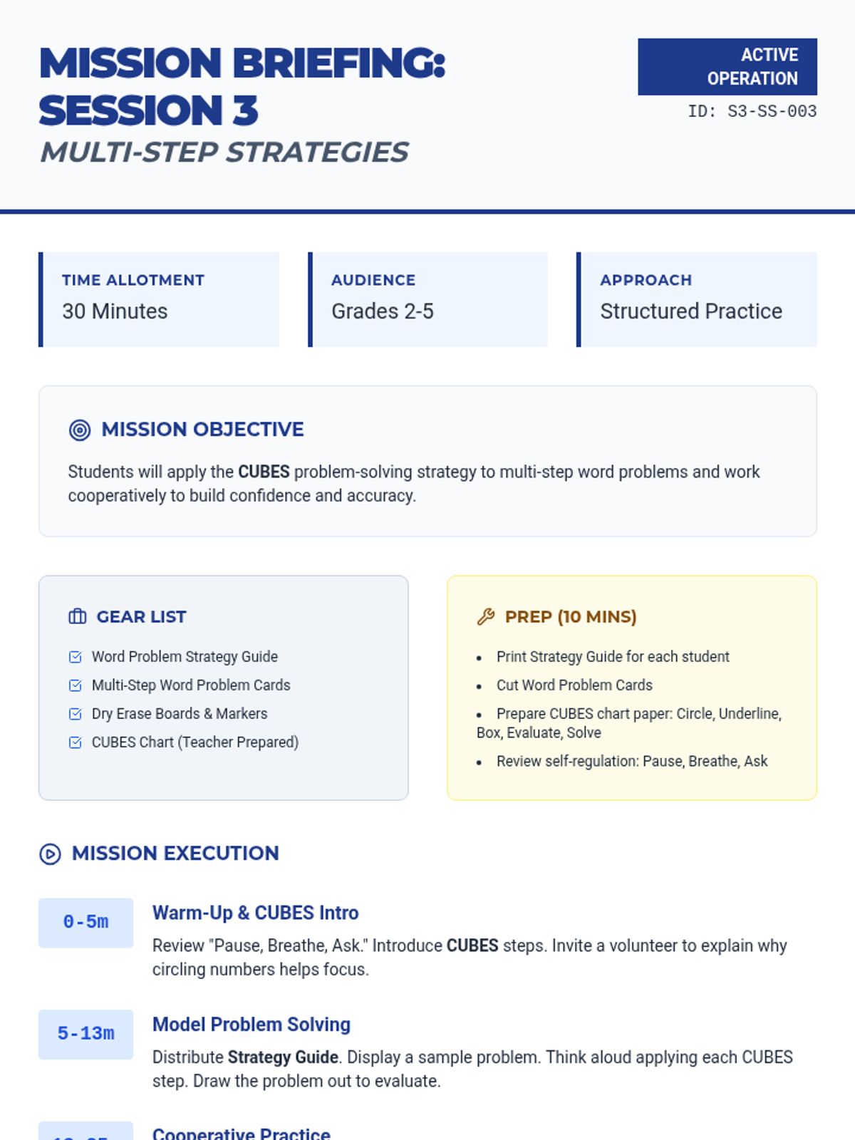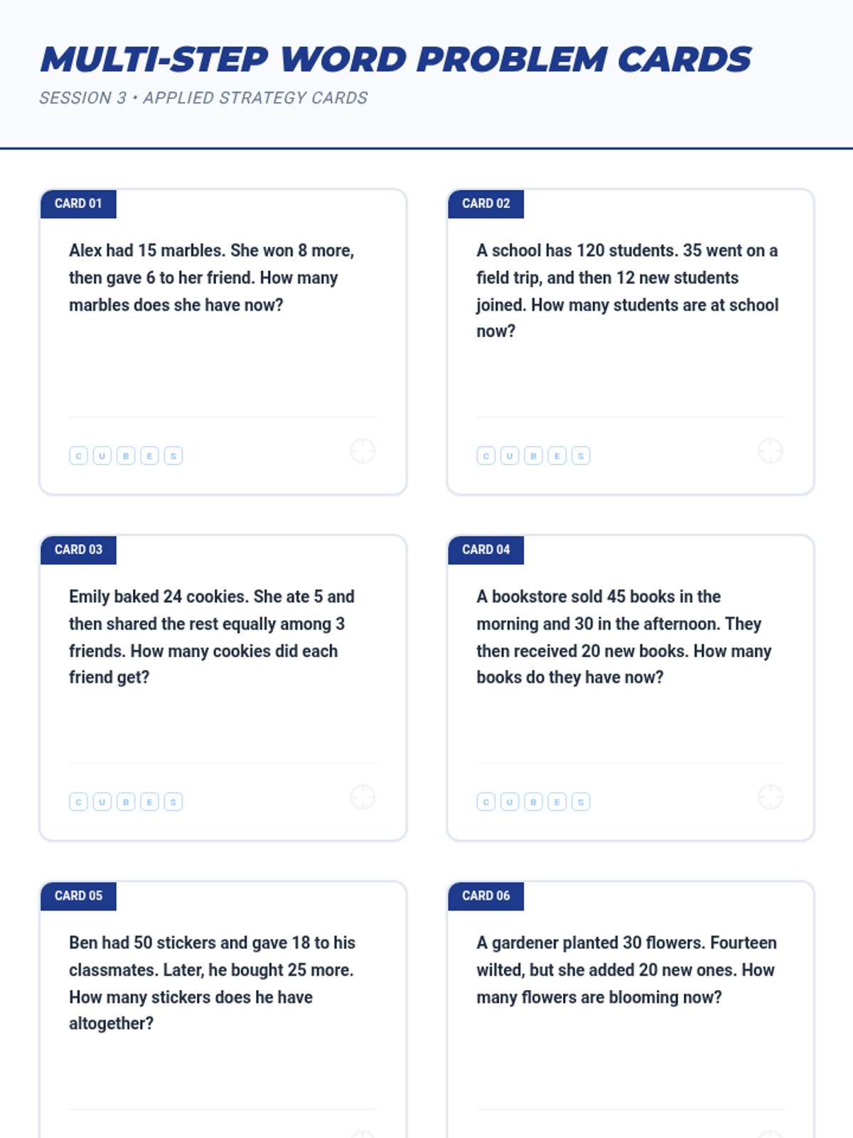 A 3-day small group math sequence designed to move students from NWEA RIT 170-180 to 181-190. Students master missing addend word problems, skip counting sequences, and input-output tables through investigative word problems.