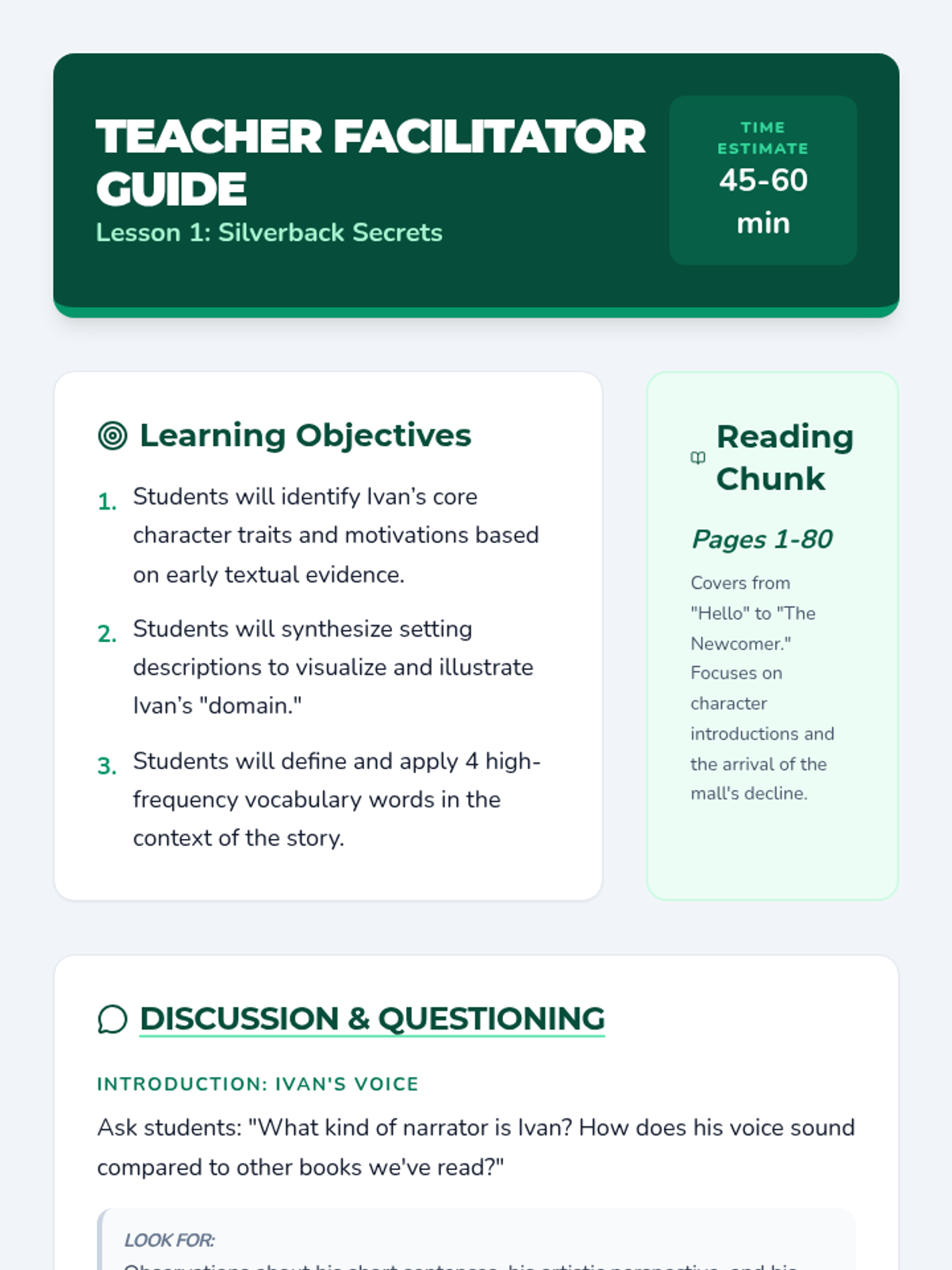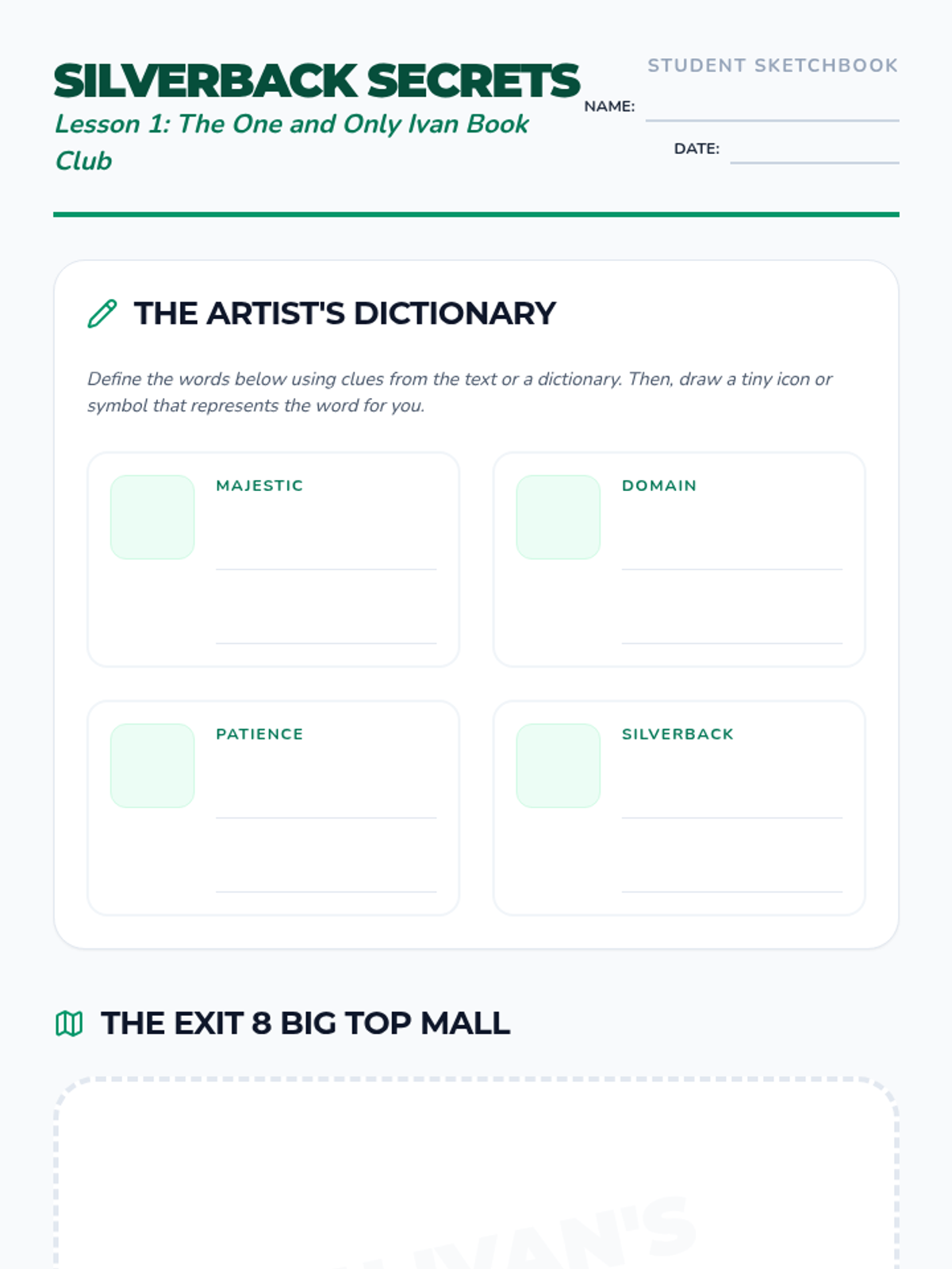 A comprehensive book club unit for Katherine Applegate's 'The One and Only Ivan', focusing on character development, plot structure, and vocabulary through the lens of Ivan's artistic journey. Students explore the transition from the Big Top Mall to the zoo while practicing synthesis and analytical writing.