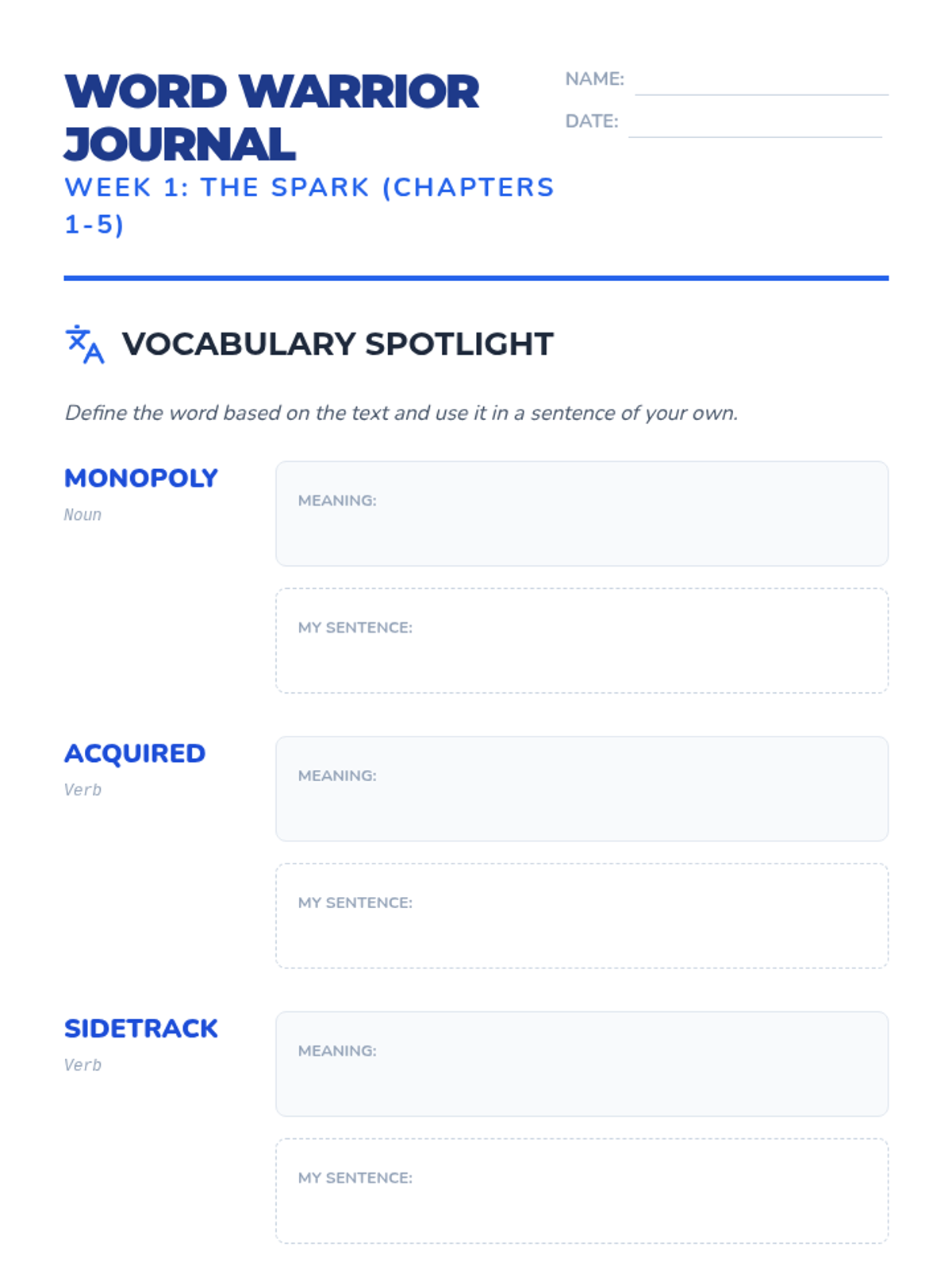 A three-week comprehensive book club for 'Frindle' by Andrew Clements, focusing on the power of language, character evolution, and the skills of summarizing and synthesizing. Students explore how a simple idea can spark a school-wide movement while building their vocabulary and analytical thinking.