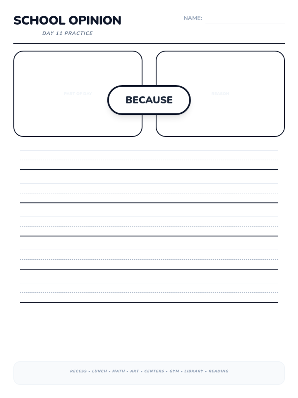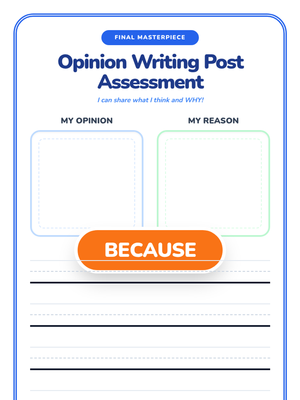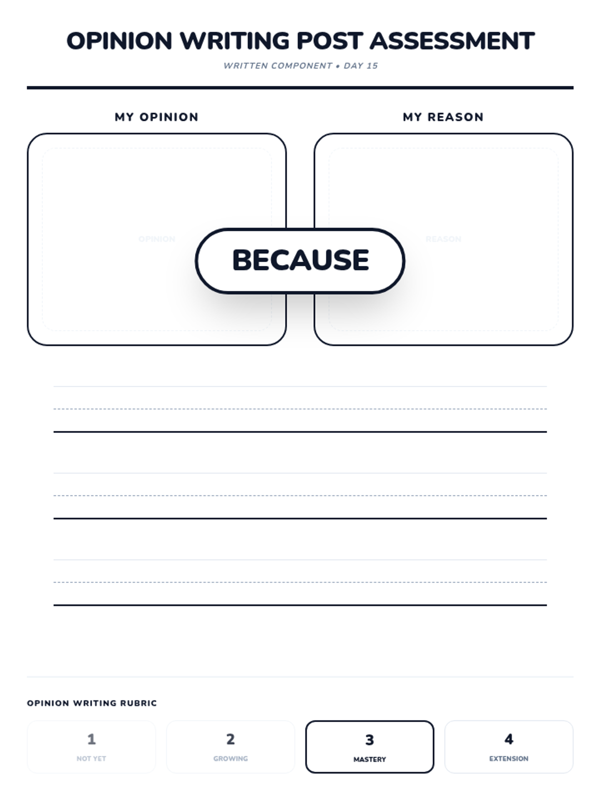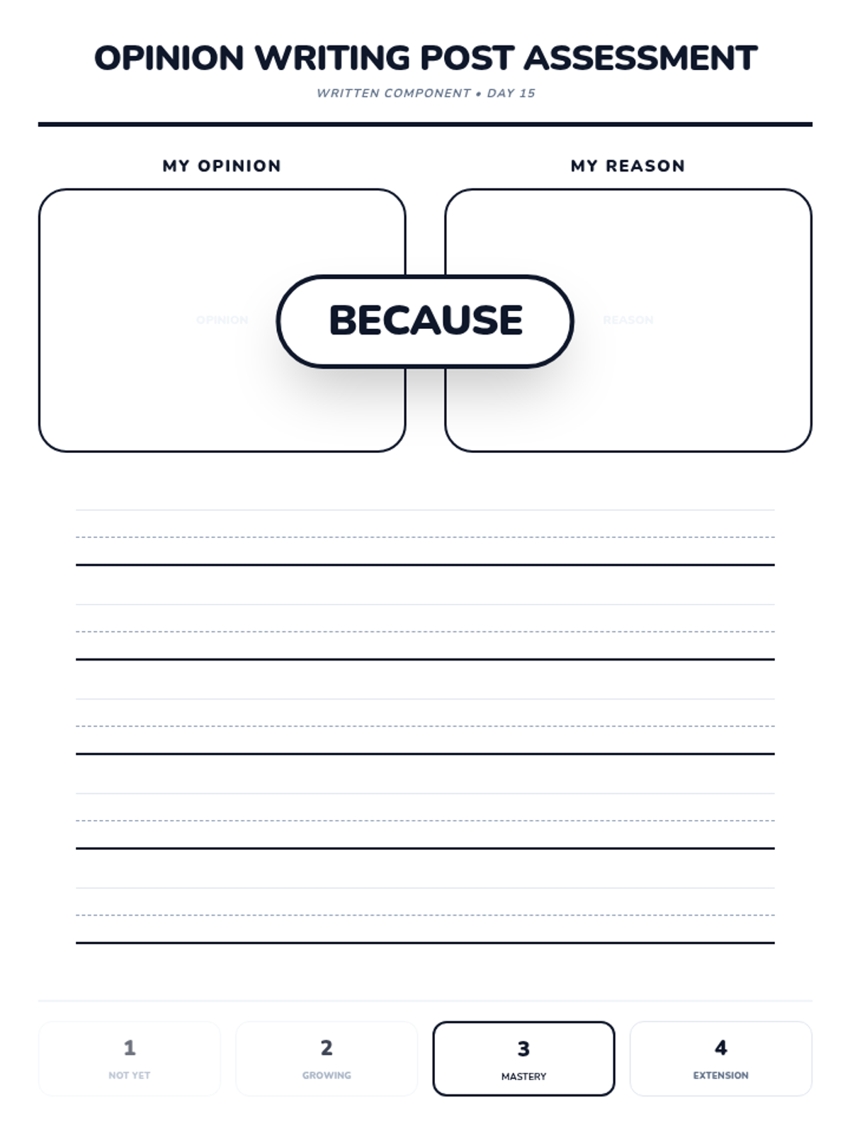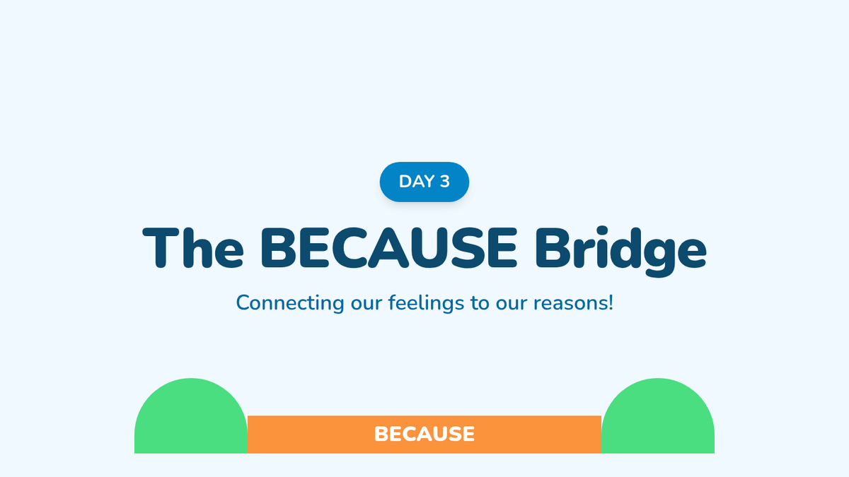 A 15-day introductory unit for Kindergarten students focused on identifying, stating, and supporting opinions using the bridge word 'because'. The sequence includes a pre-assessment, mid-point check, and post-assessment, with daily visual slides and printable practice activities.