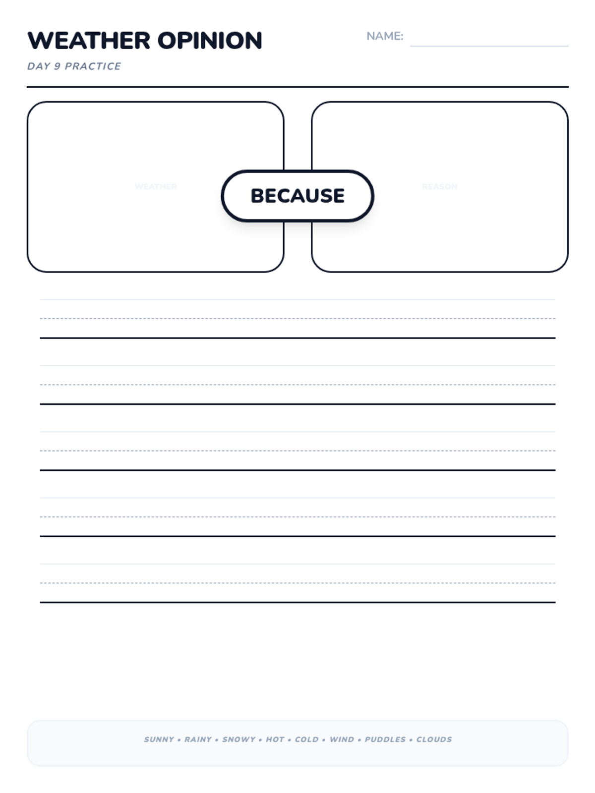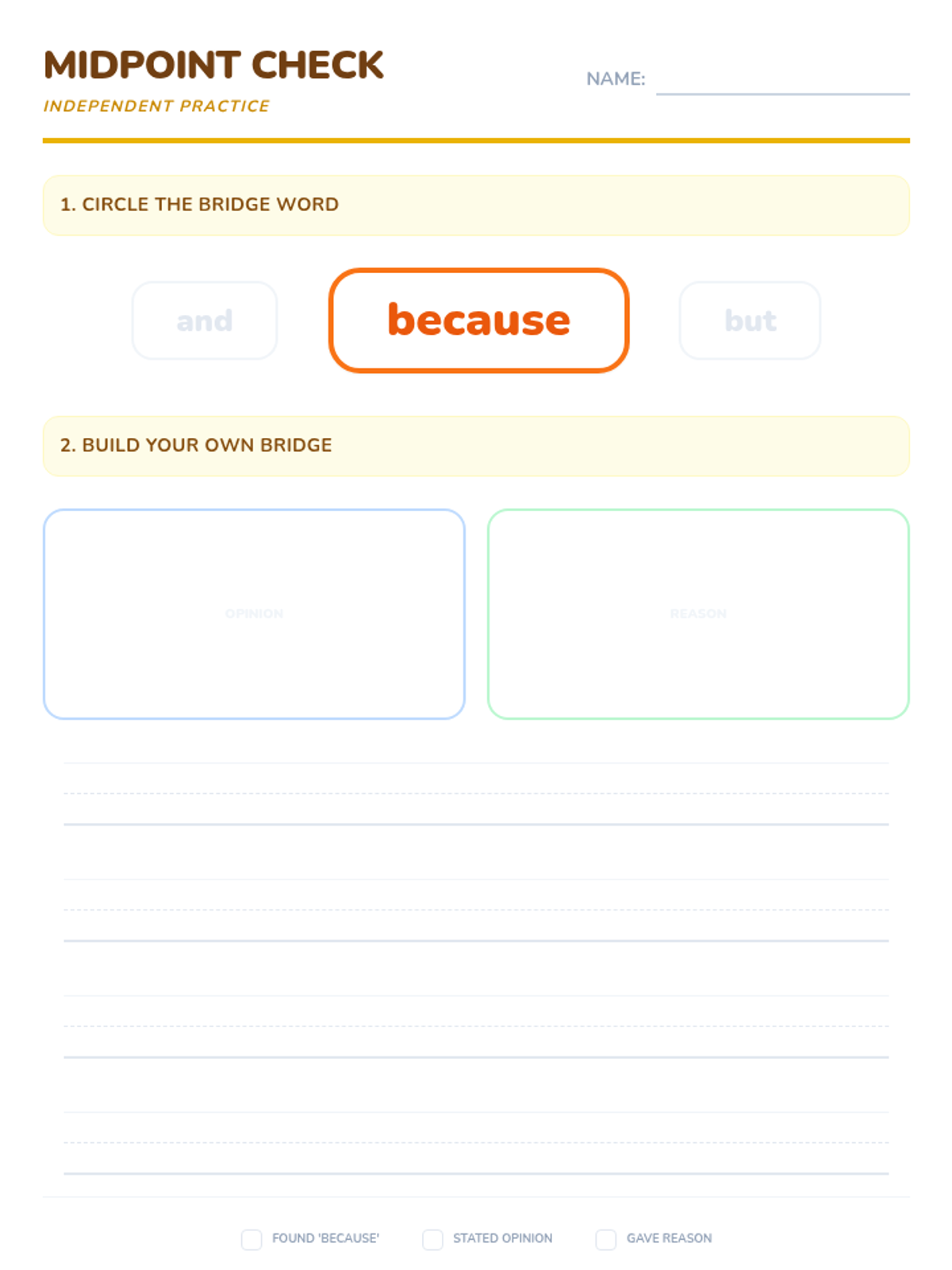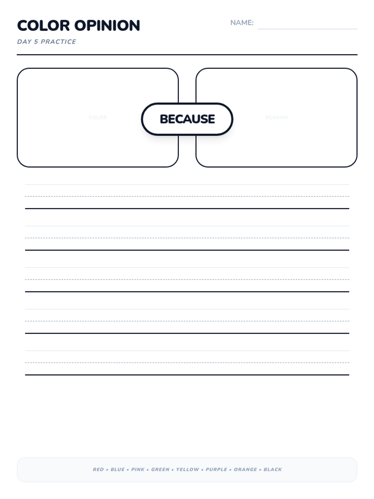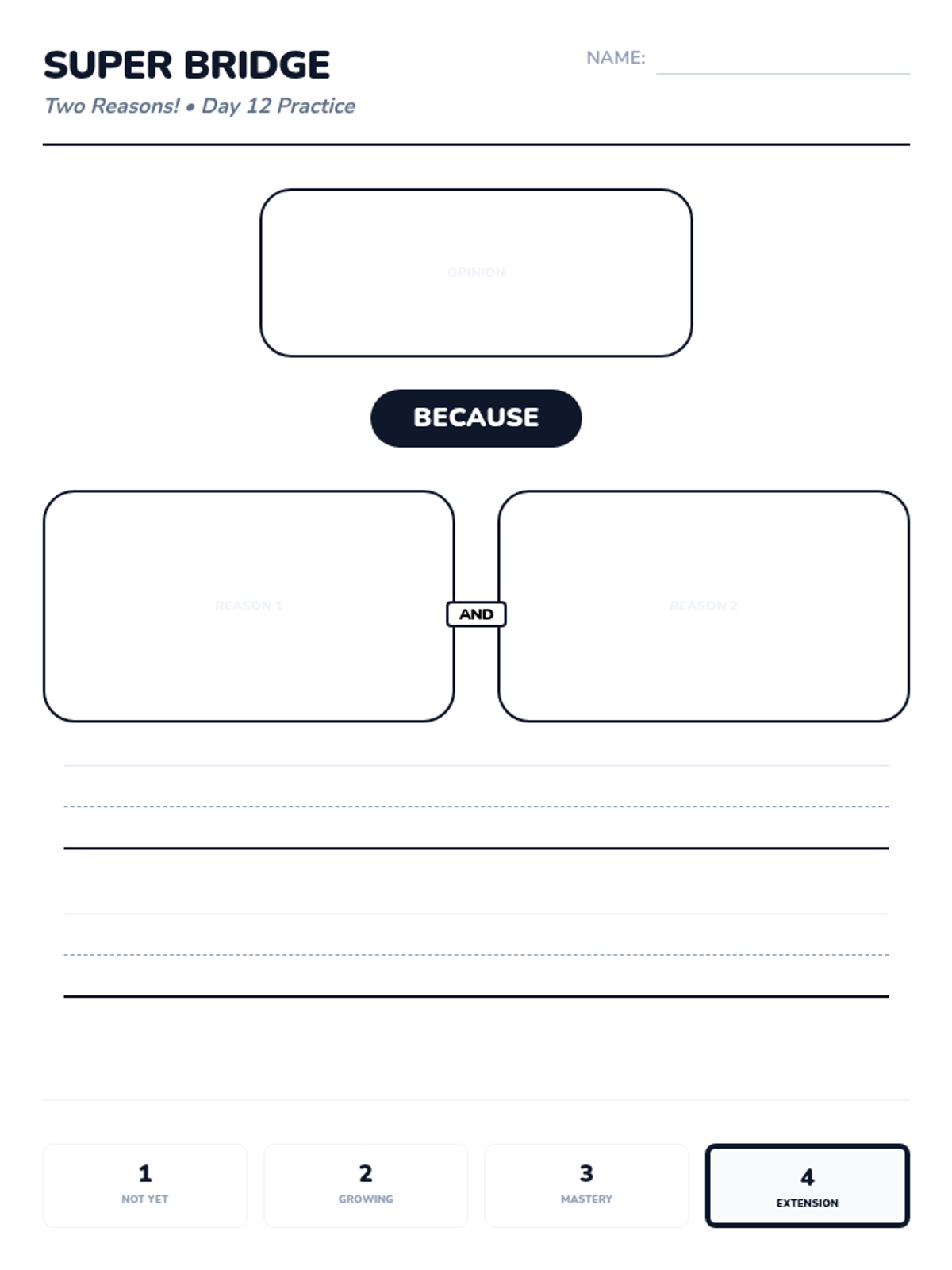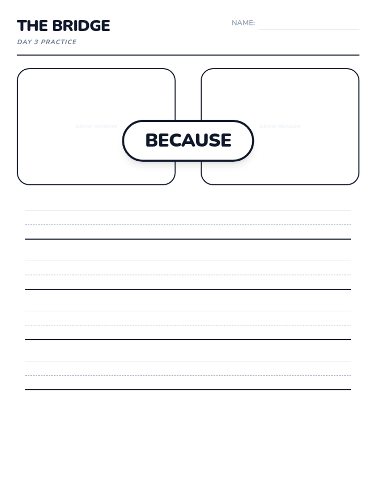 A 15-day introductory unit for Kindergarten students focused on identifying, stating, and supporting opinions using the bridge word 'because'. The sequence includes a pre-assessment, mid-point check, and post-assessment, with daily visual slides and printable practice activities.