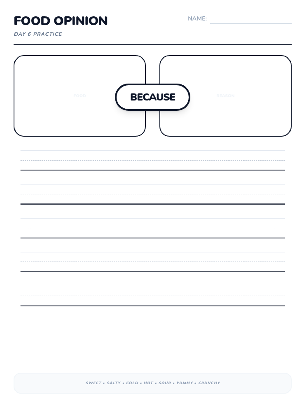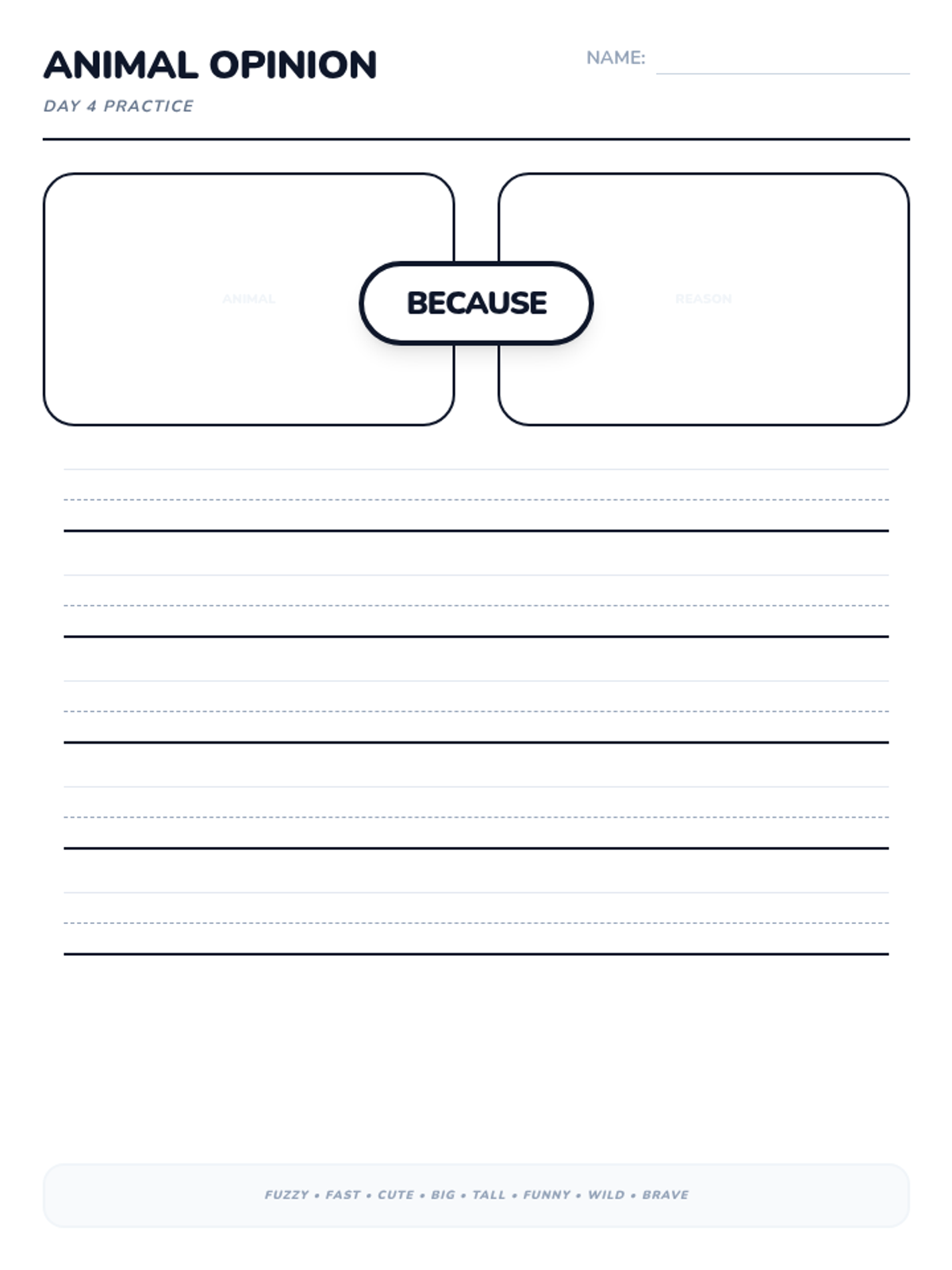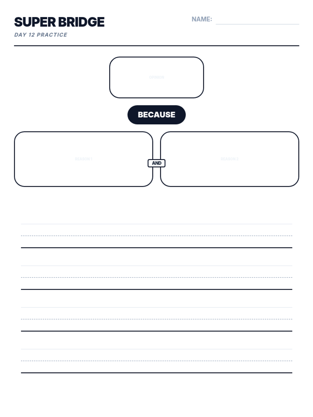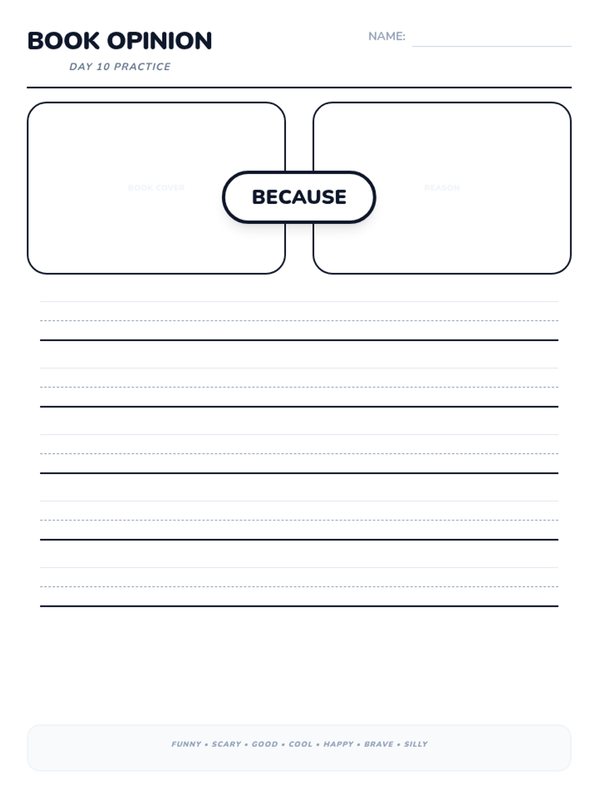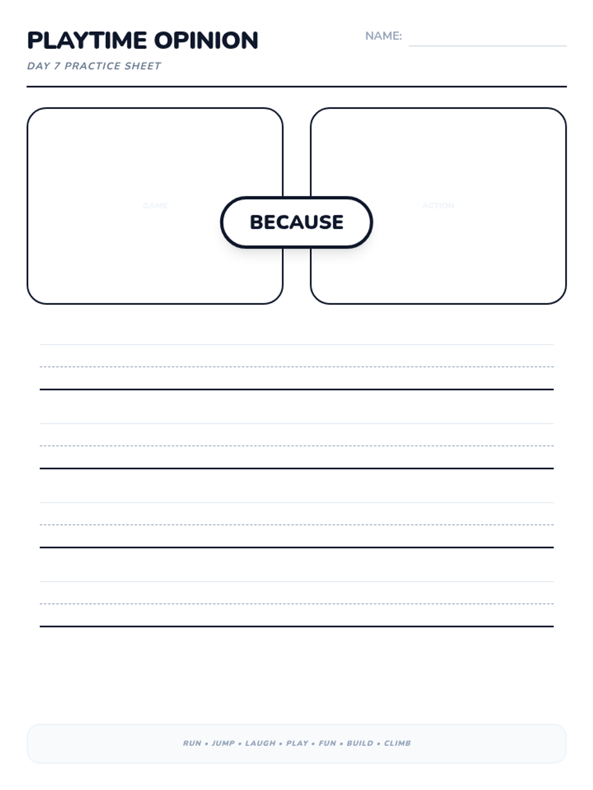 A 15-day introductory unit for Kindergarten students focused on identifying, stating, and supporting opinions using the bridge word 'because'. The sequence includes a pre-assessment, mid-point check, and post-assessment, with daily visual slides and printable practice activities.
