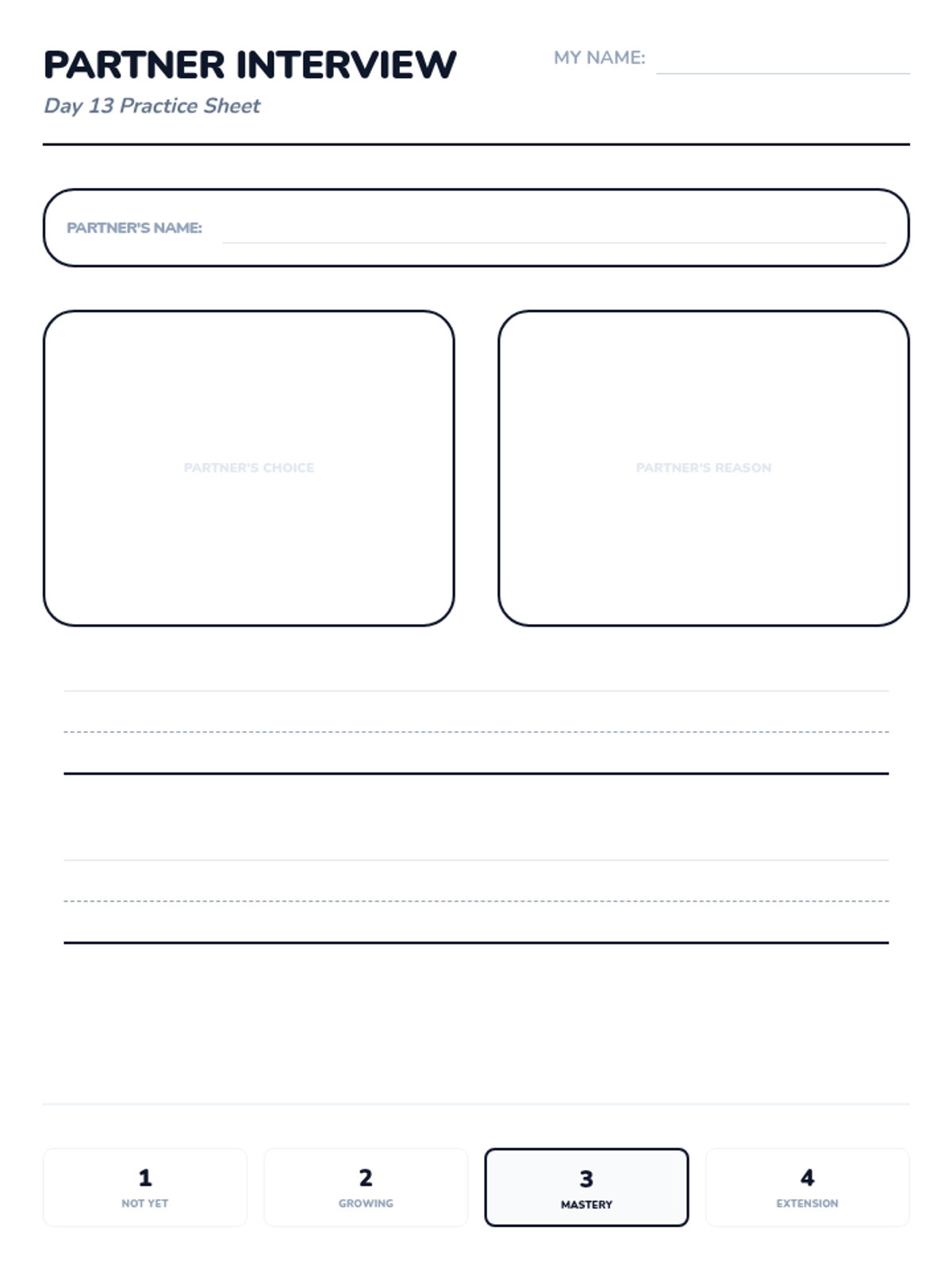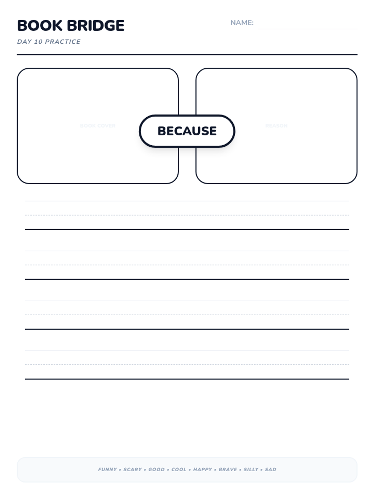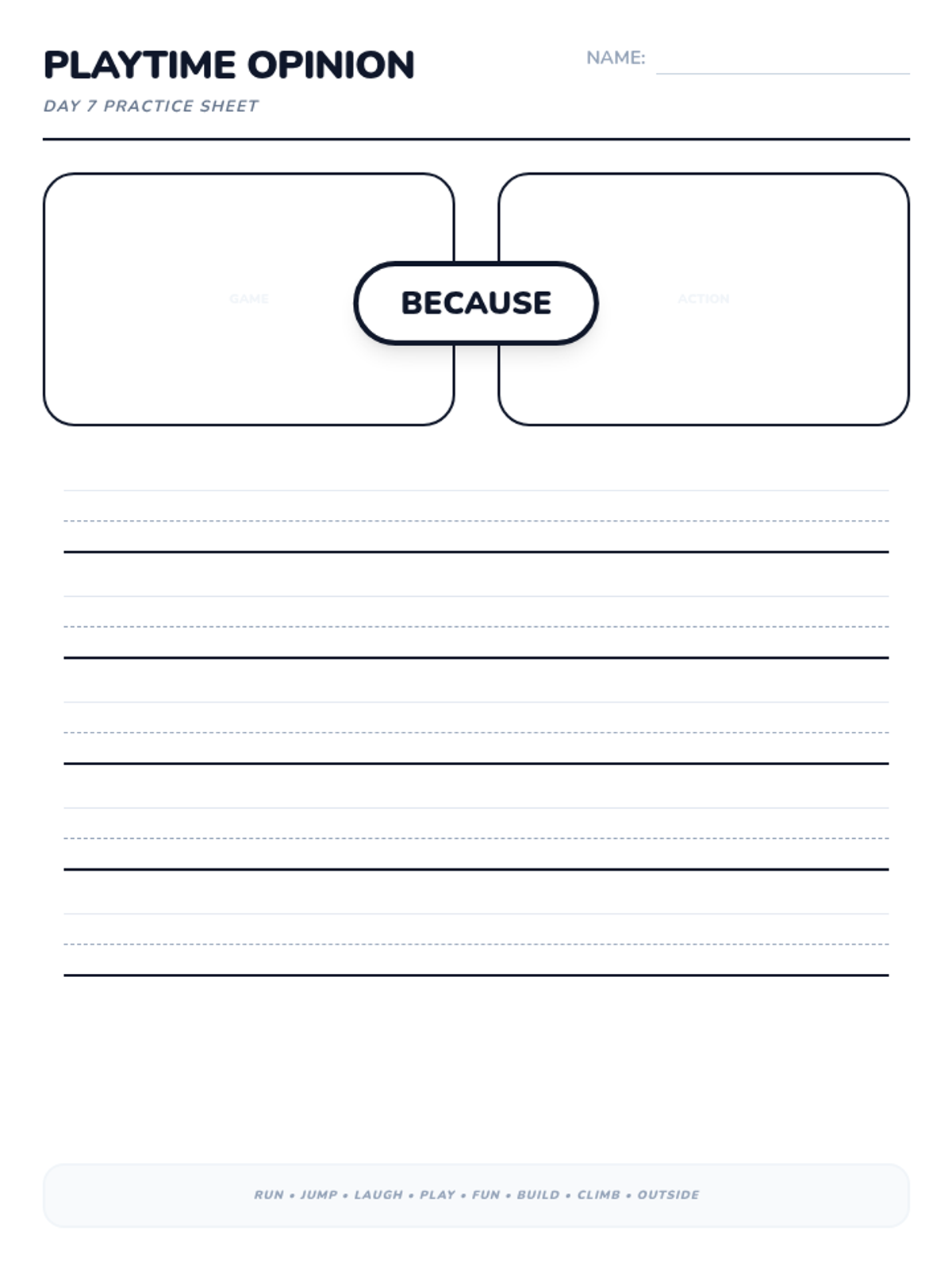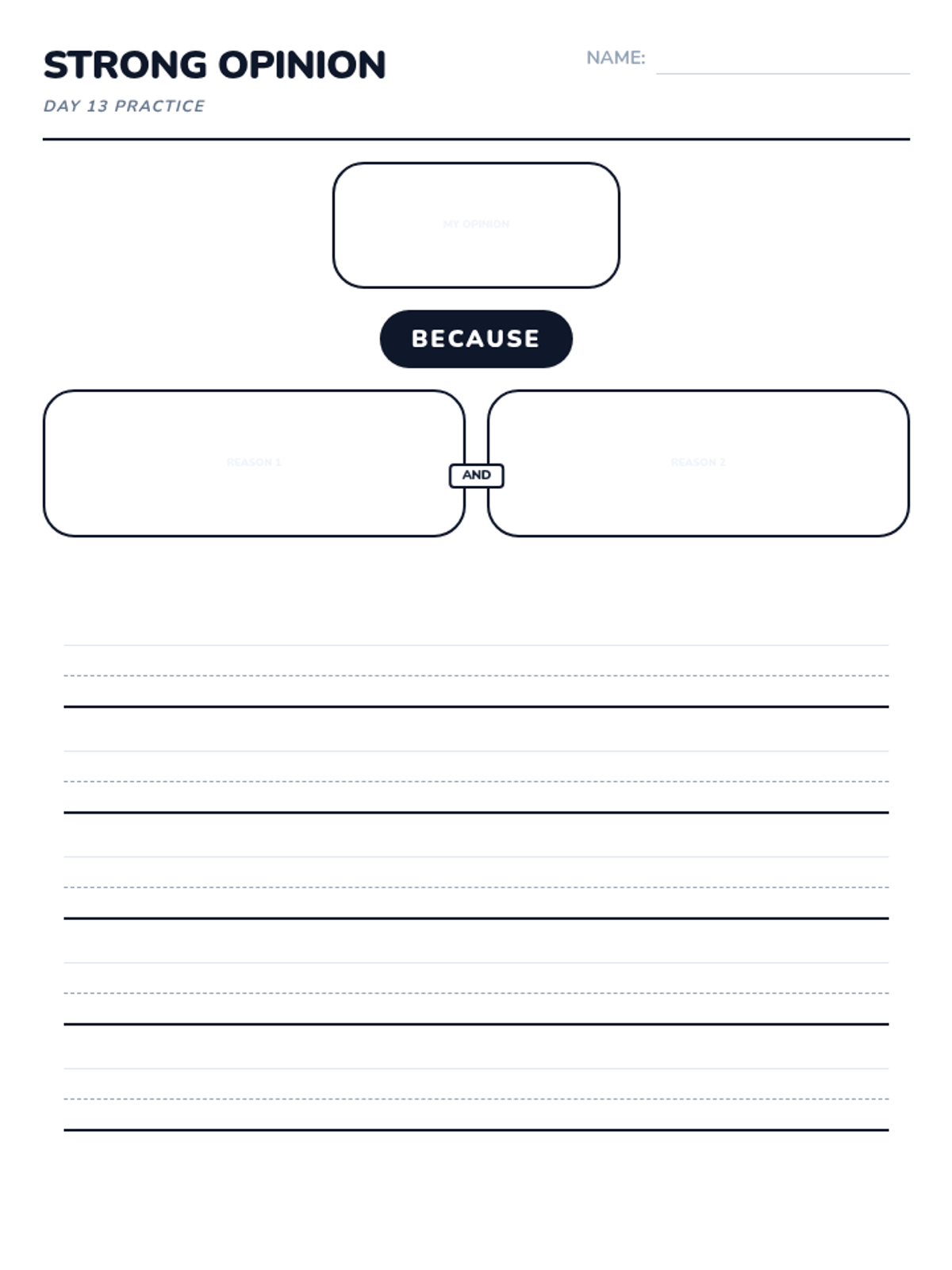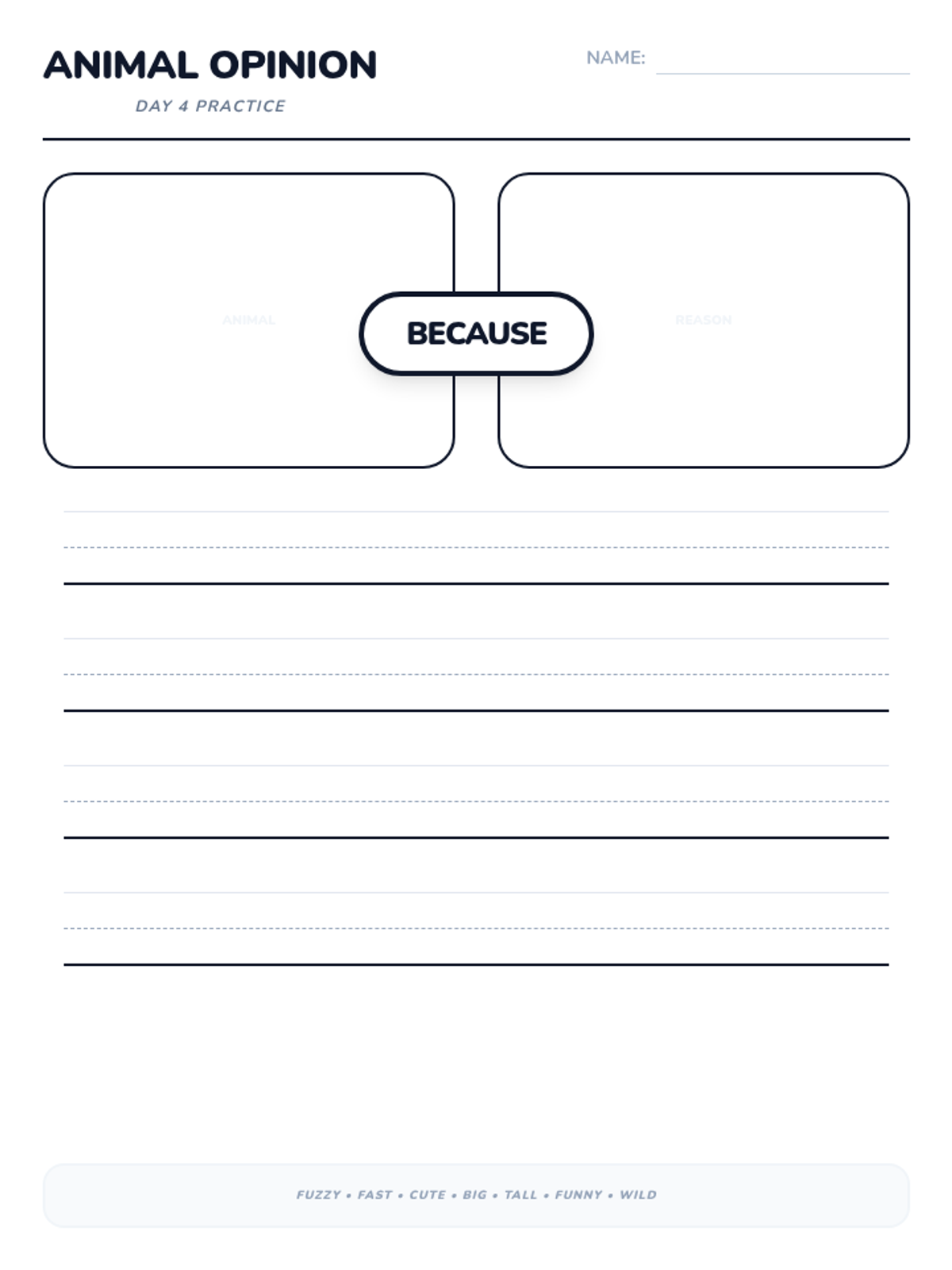 A 15-day introductory unit for Kindergarten students focused on identifying, stating, and supporting opinions using the bridge word 'because'. The sequence includes a pre-assessment, mid-point check, and post-assessment, with daily visual slides and printable practice activities.