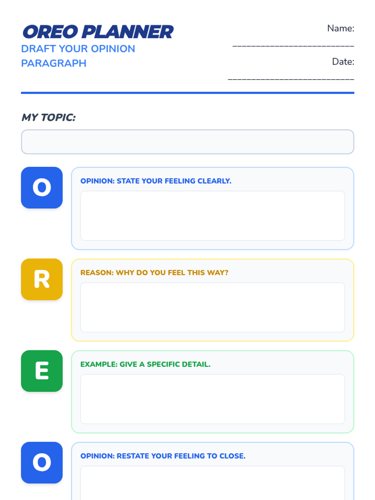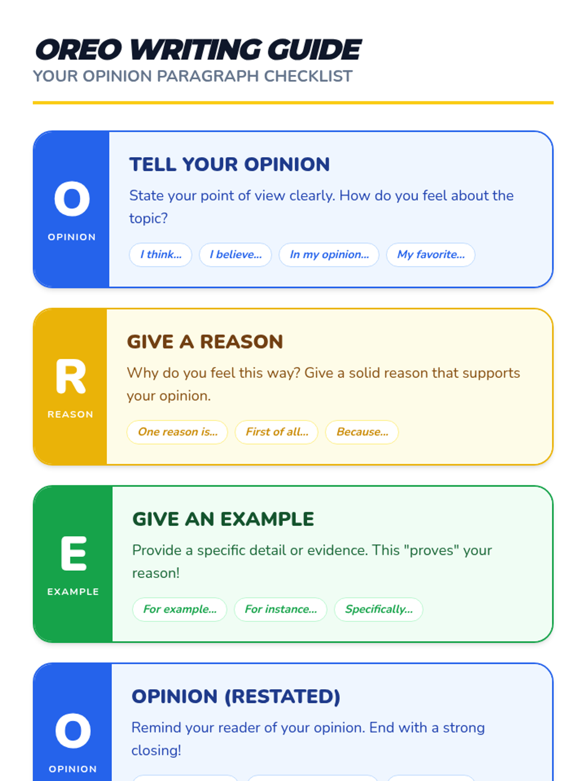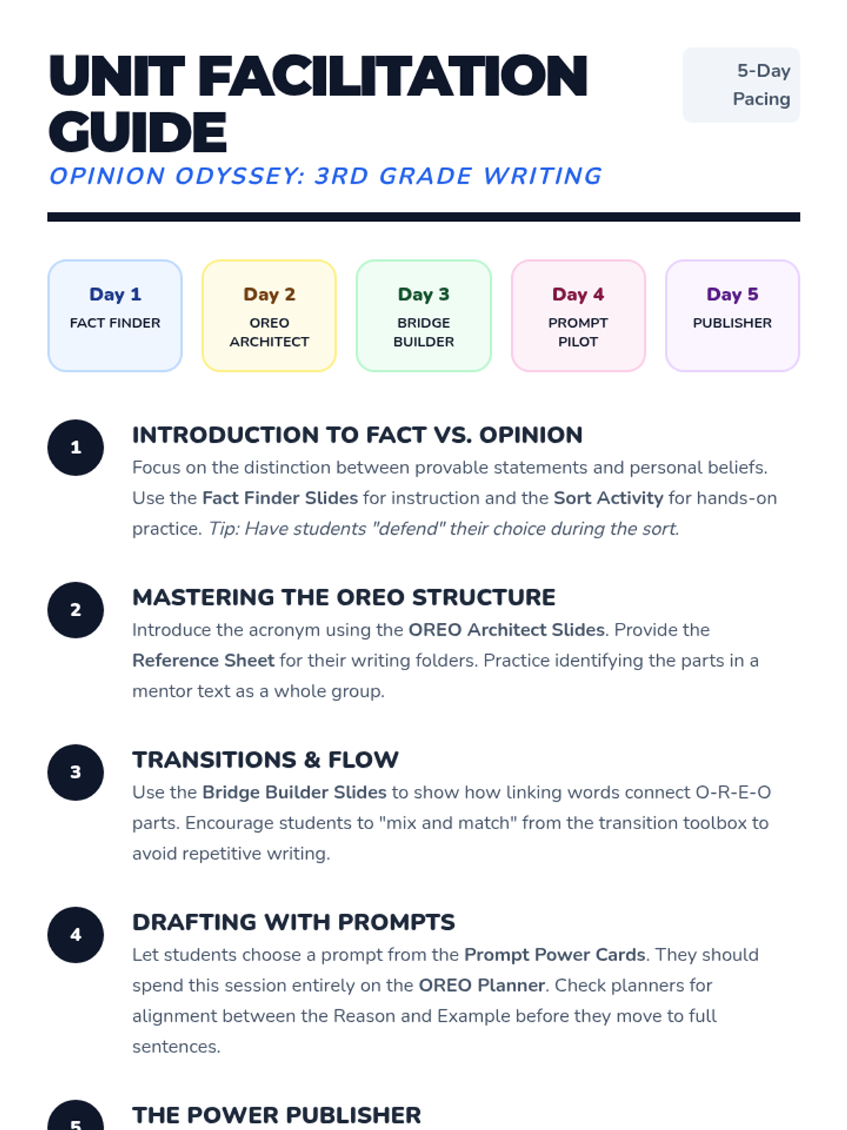 A comprehensive 5-day unit for 3rd graders to master opinion paragraph writing using the OREO structure, featuring interactive slides, hands-on activities, and structured drafting tools.