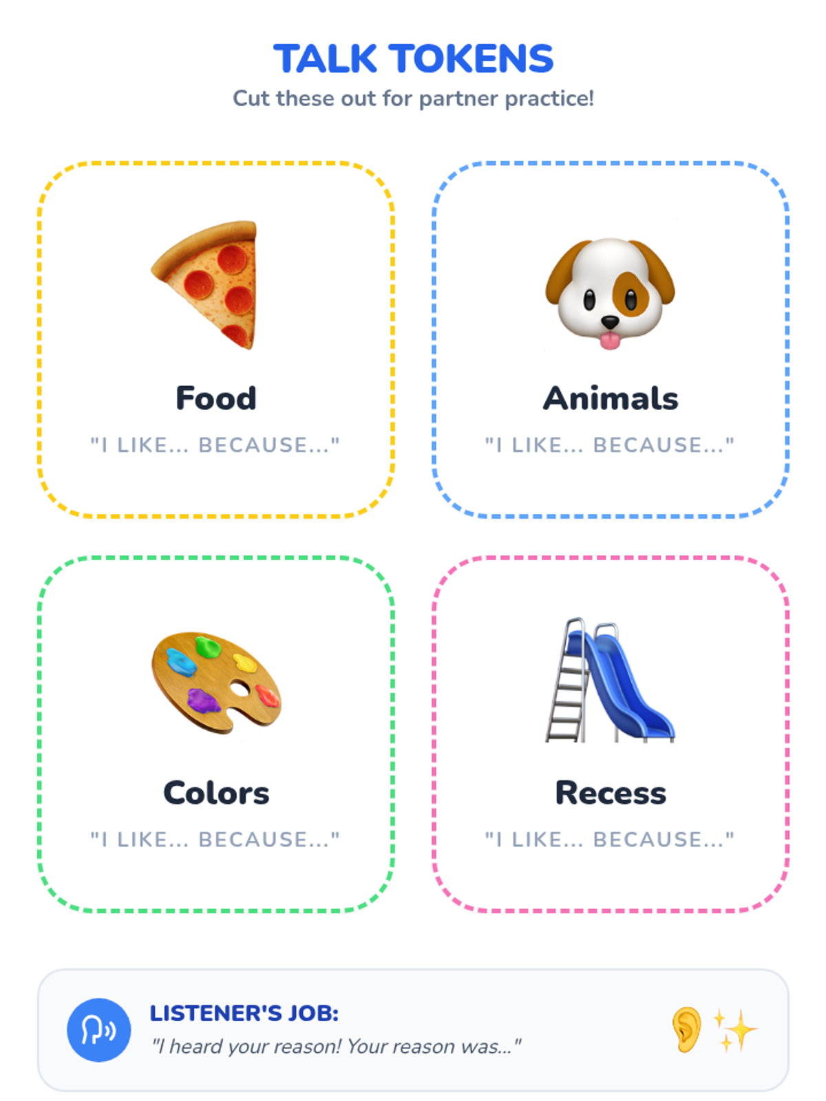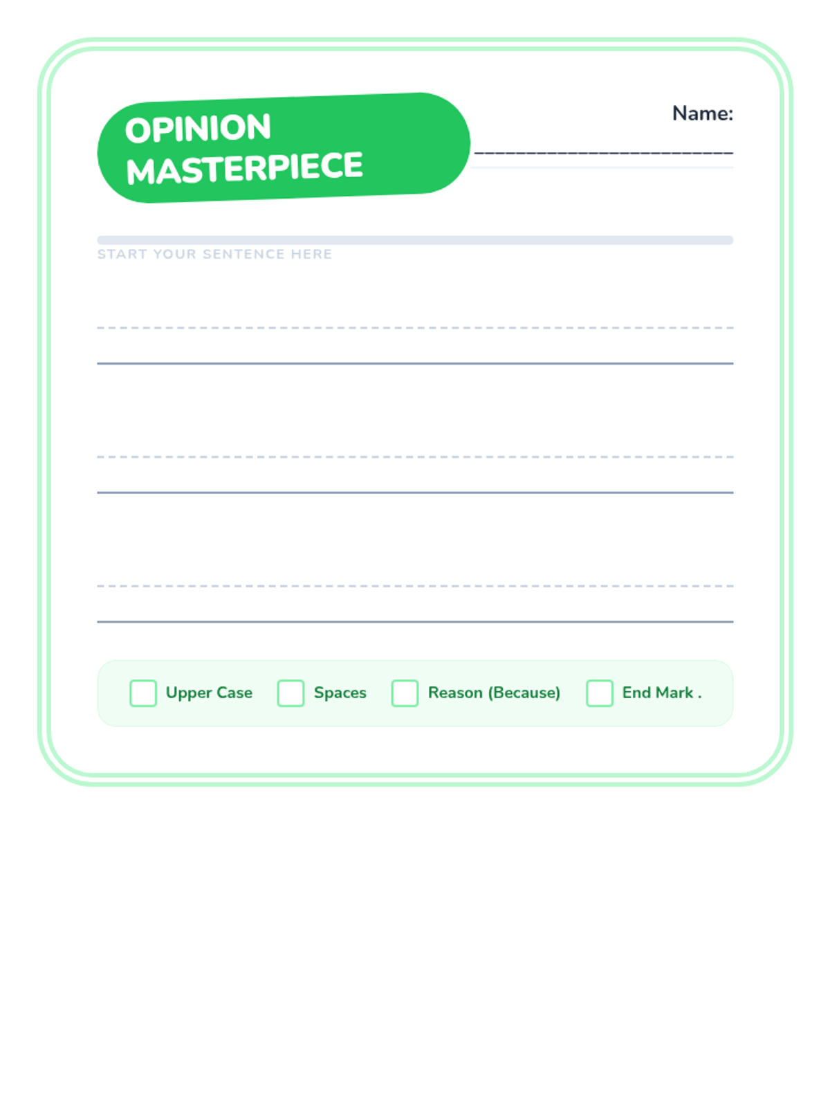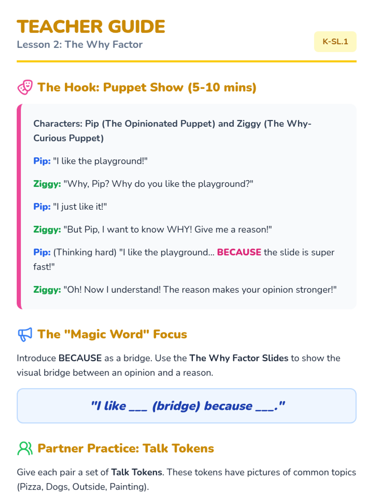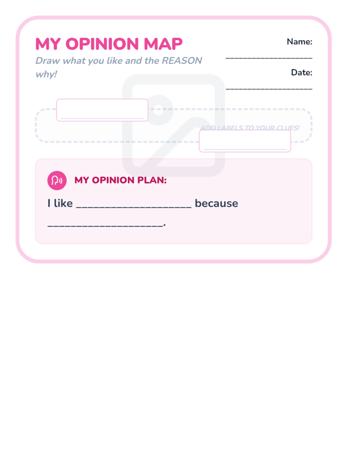 A foundational writing sequence for early learners focused on developing opinion writing skills. Students progress from stating simple preferences to supporting their opinions with reasons and descriptive details using 'I like' and 'because'.