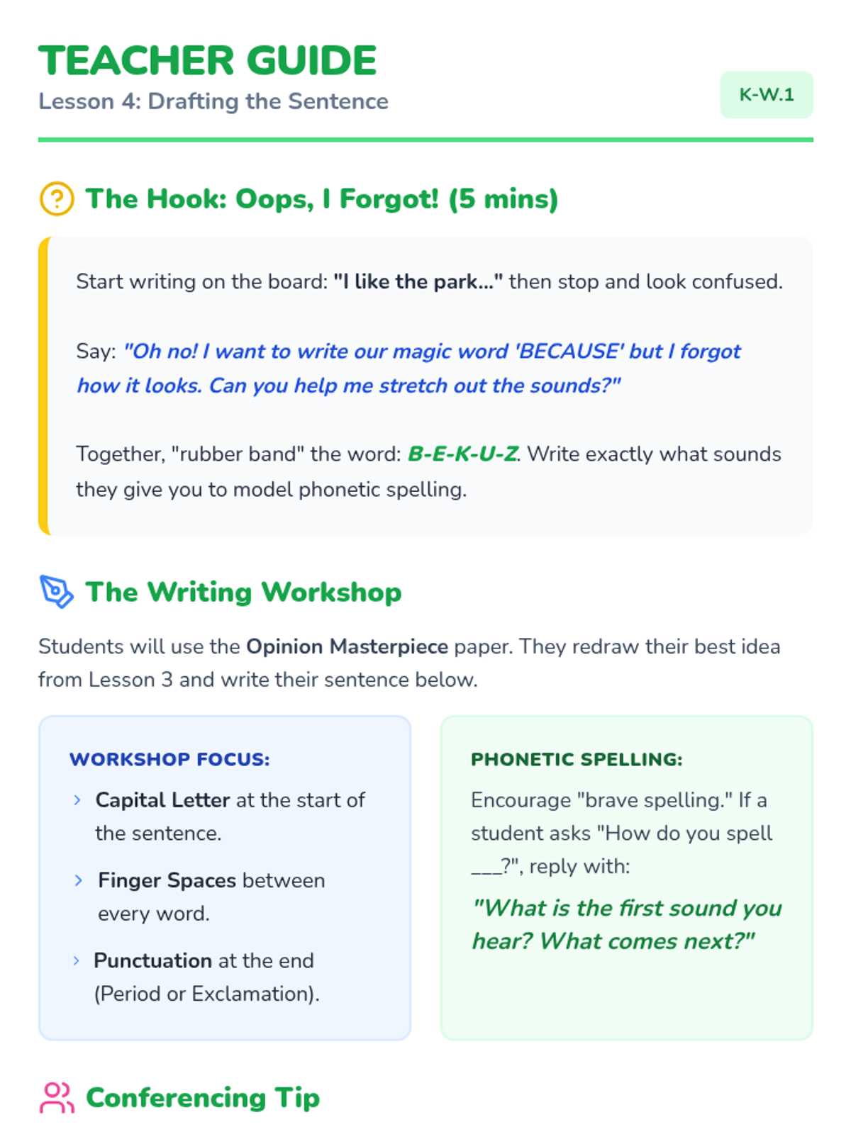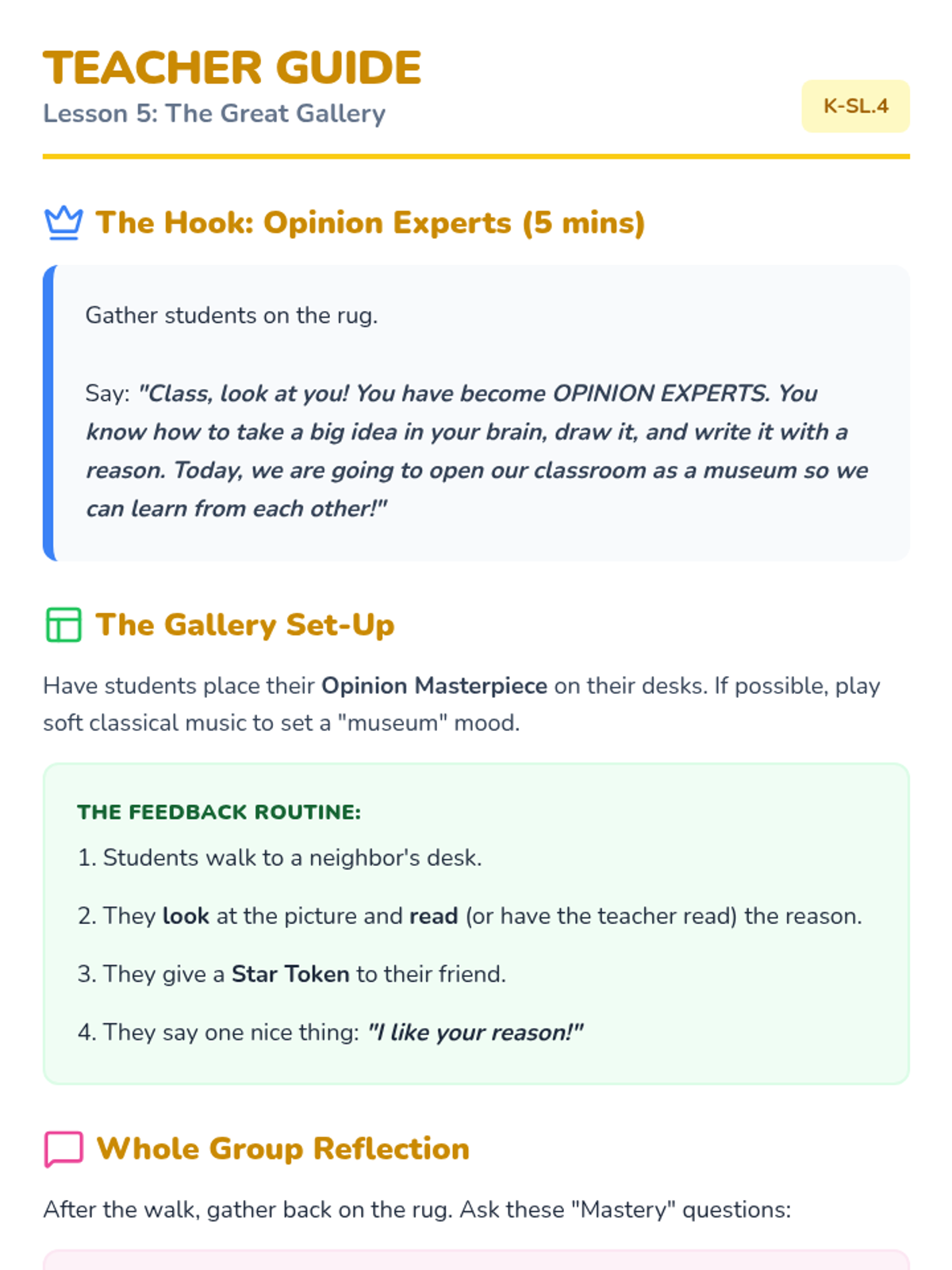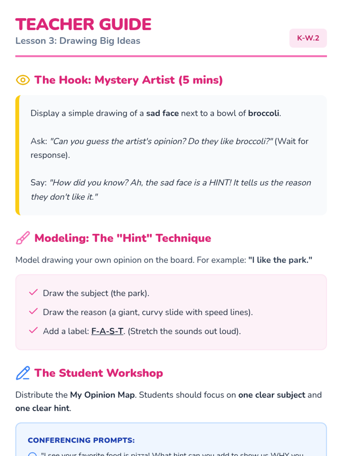 A Kindergarten ELA sequence introducing opinion writing through oral rehearsal, drawing, and simple sentence construction using the 'I like... because...' structure.