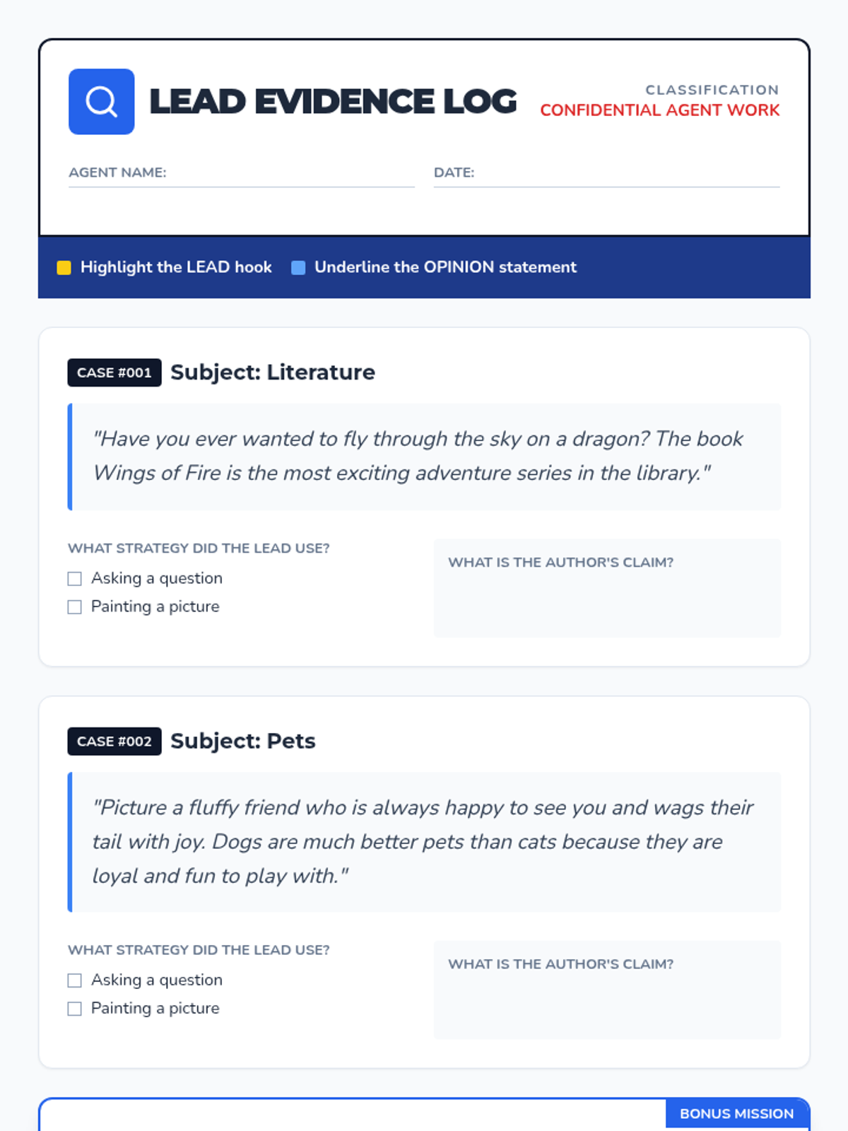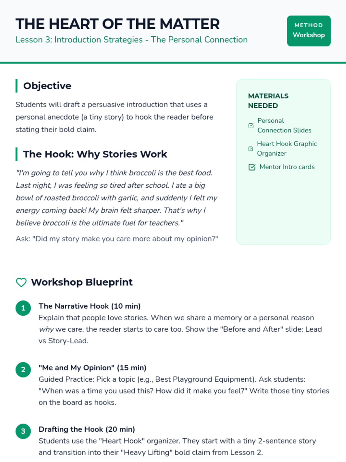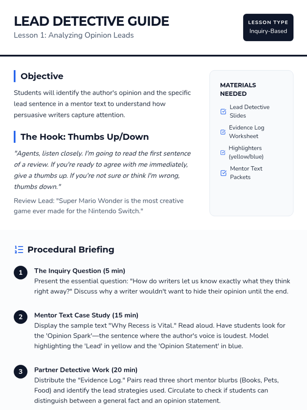 A 5-lesson inquiry-based sequence for 3rd graders on crafting persuasive introductions and conclusions. Students learn to state clear claims, use personal anecdotes, and write compelling calls to action to convince their audience.