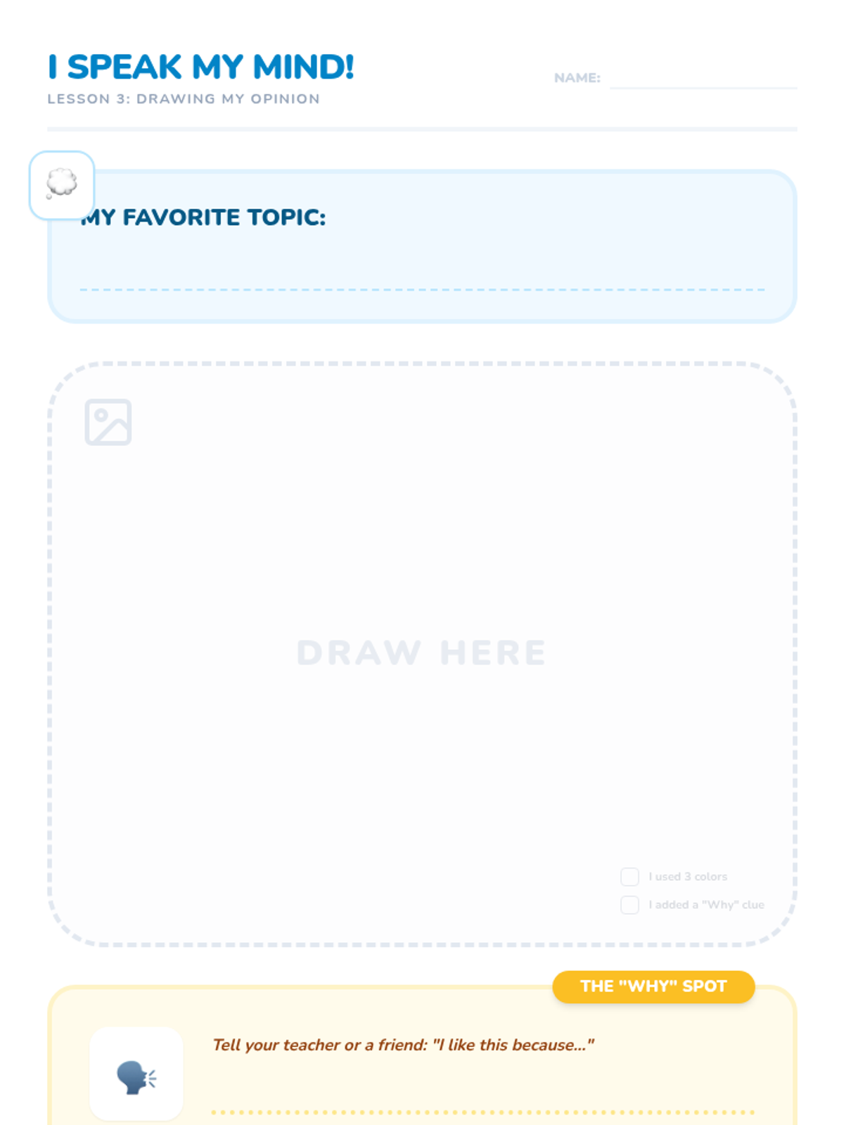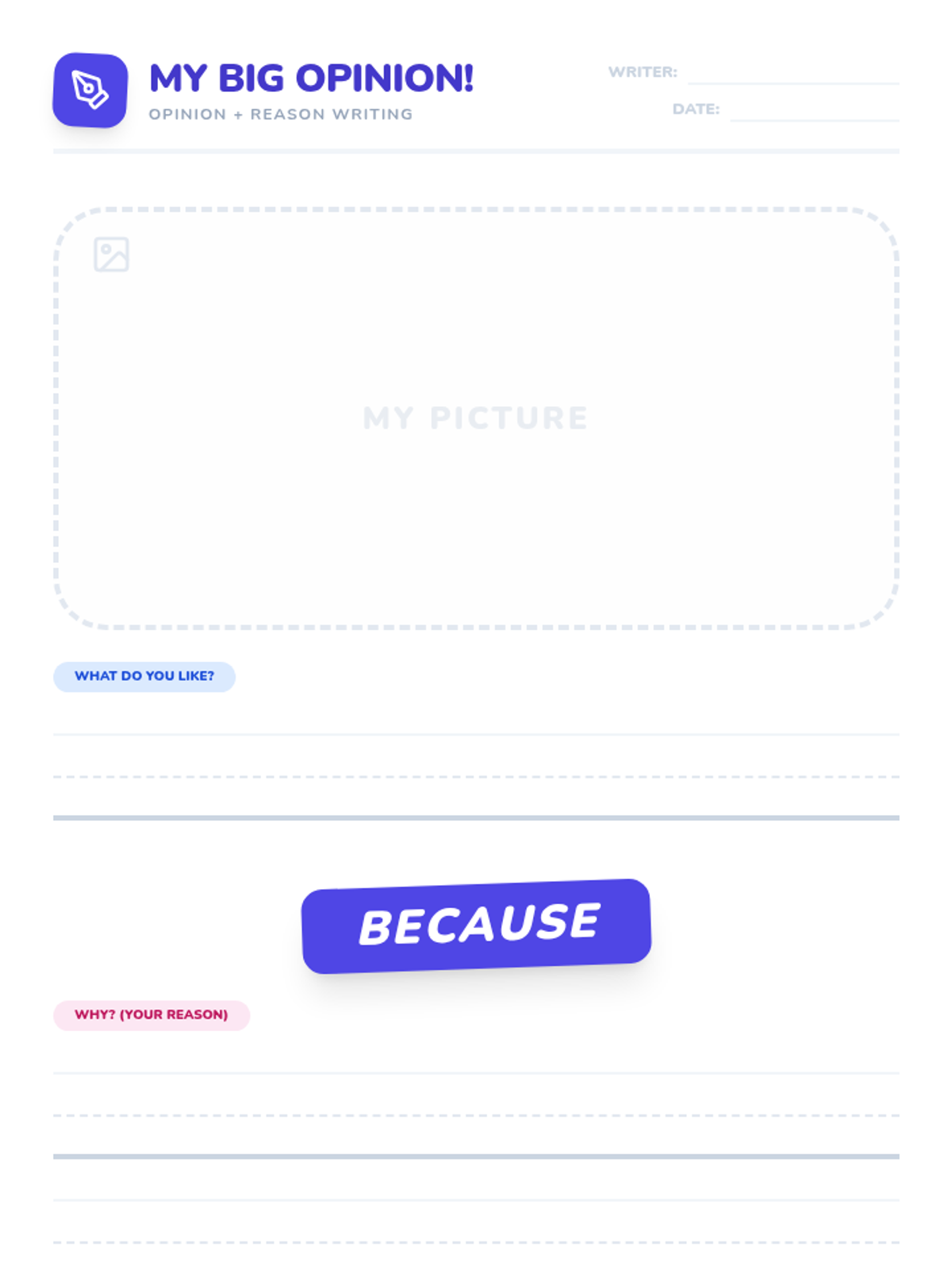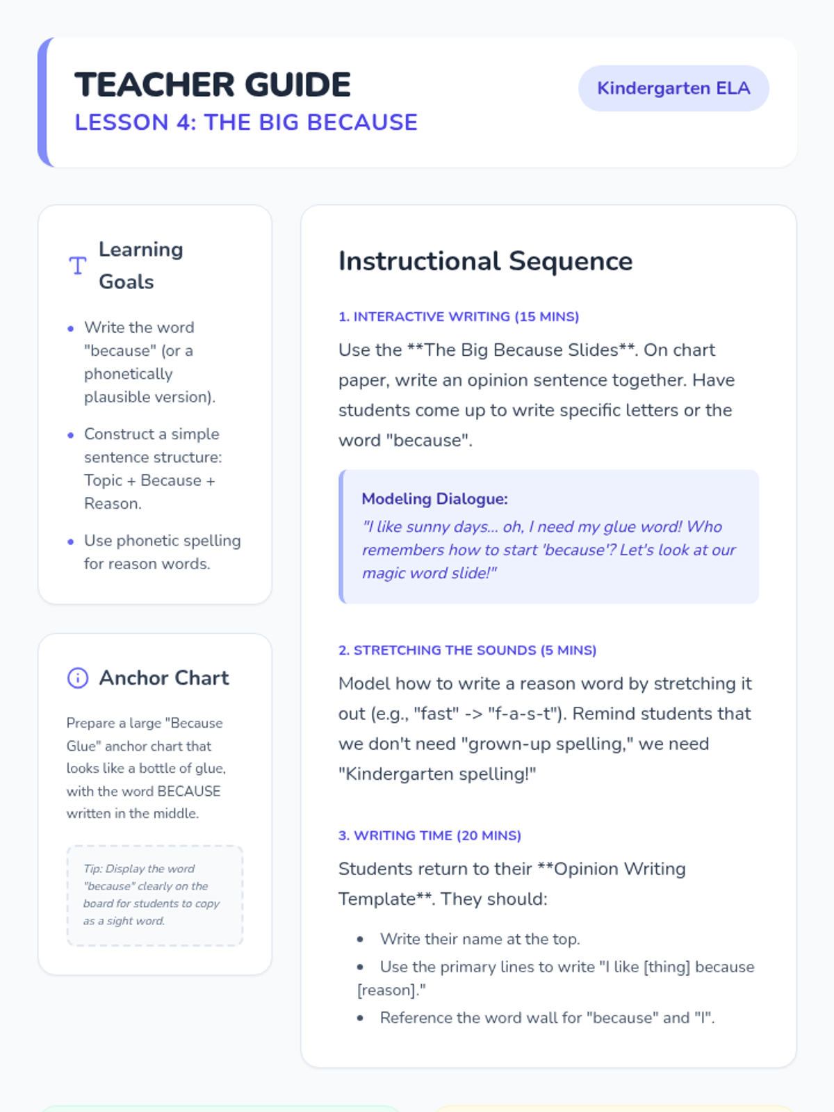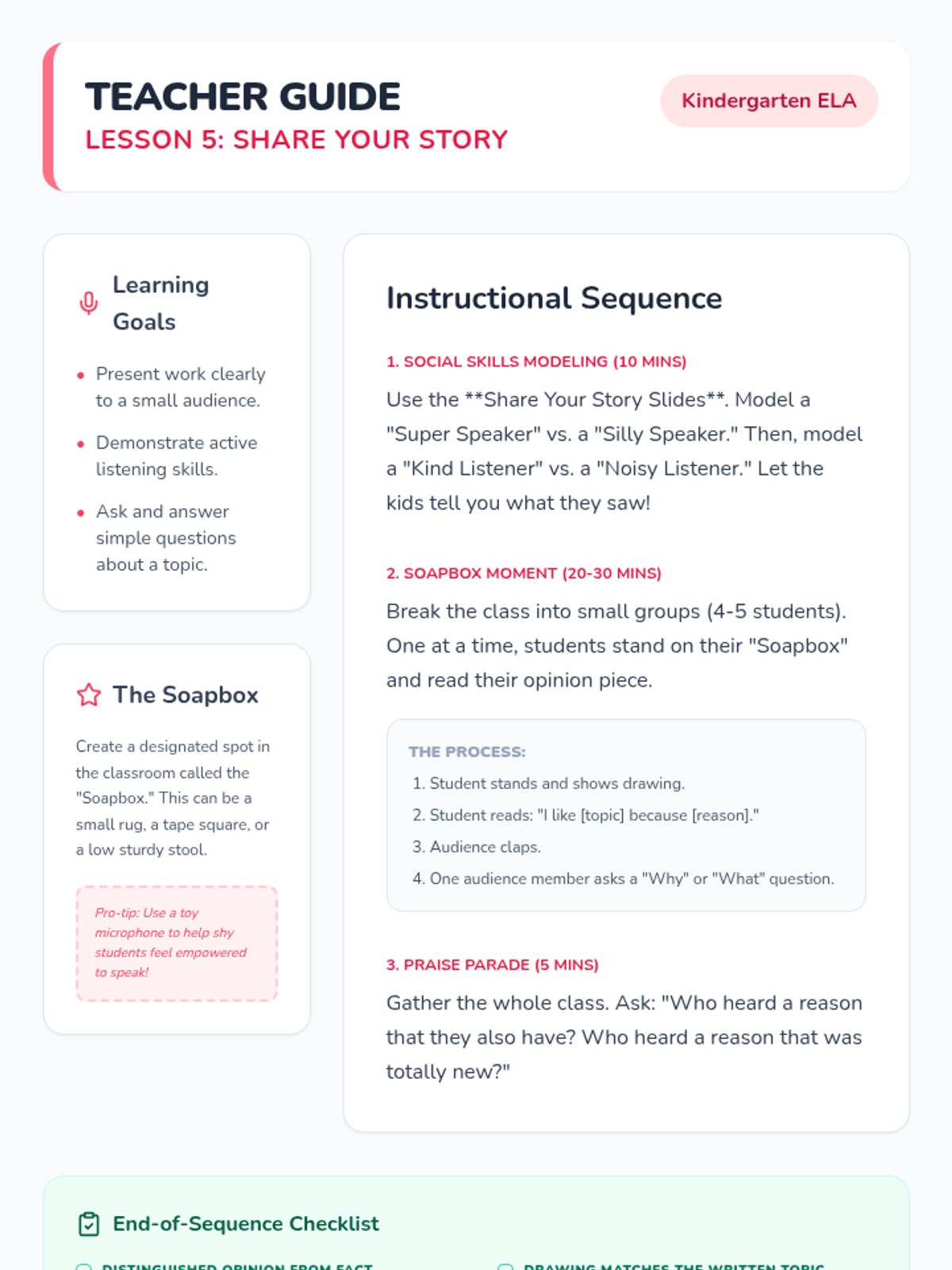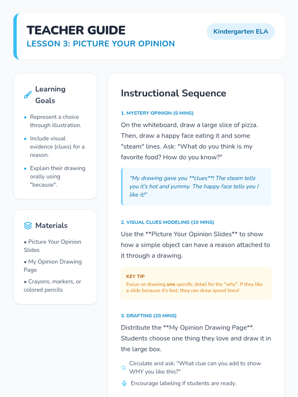 This foundational sequence introduces Kindergarten students to opinion writing by teaching them to distinguish facts from opinions and express their personal preferences using the word 'because'. Students move from oral practice and drawing to simple sentence construction, culminating in a shared presentation of their ideas.