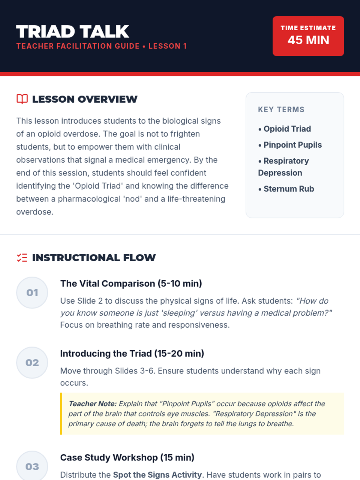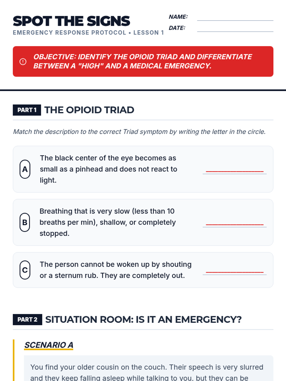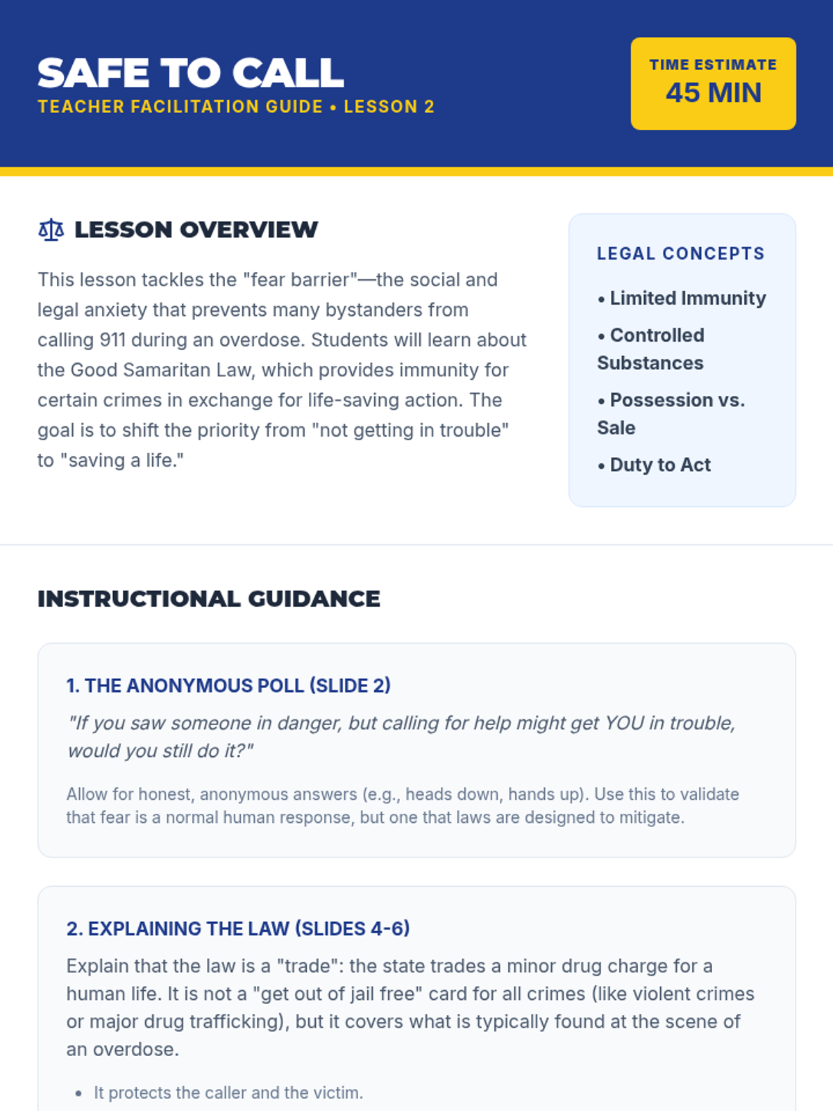 A comprehensive 5-lesson unit for 7th graders focused on recognizing opioid overdose symptoms, understanding legal protections like Good Samaritan Laws, and mastering emergency response protocols including 911 communication and the recovery position.