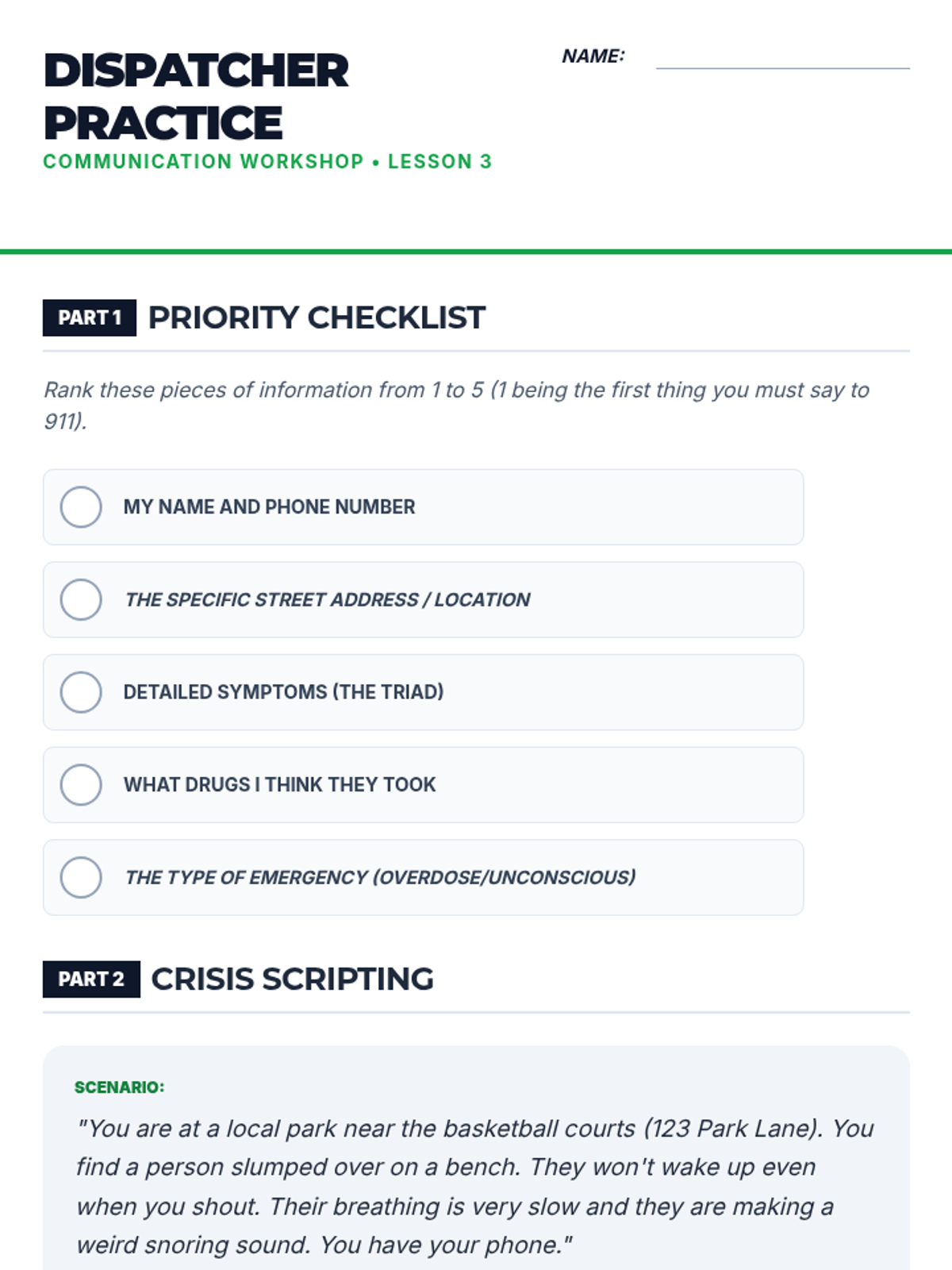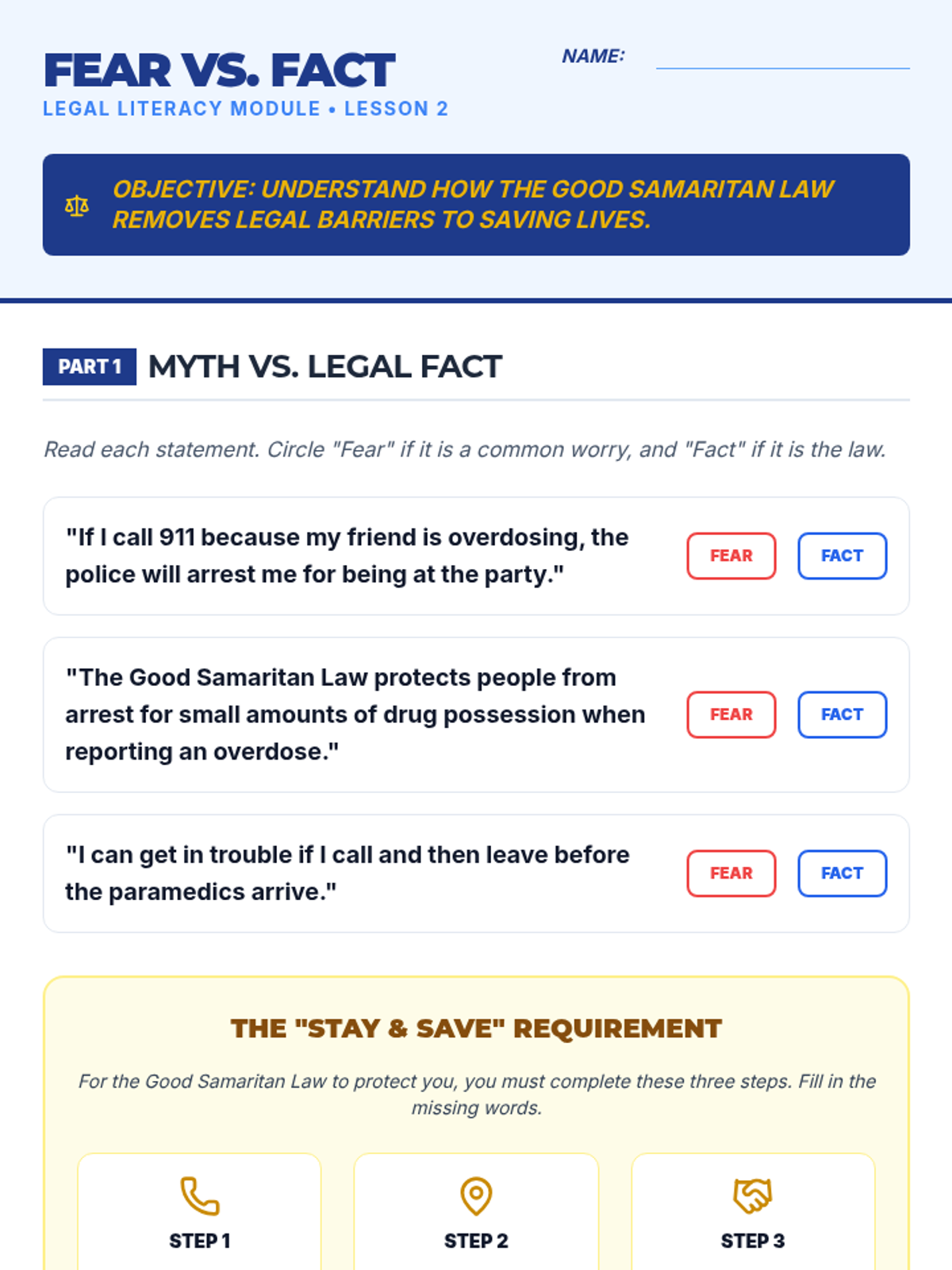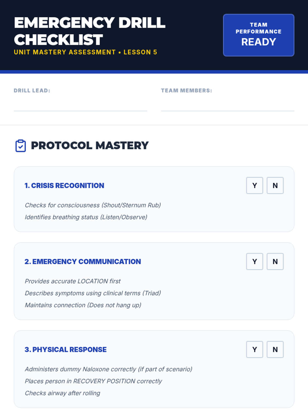 A comprehensive 5-lesson unit for 7th graders focused on recognizing opioid overdose symptoms, understanding legal protections like Good Samaritan Laws, and mastering emergency response protocols including 911 communication and the recovery position.
