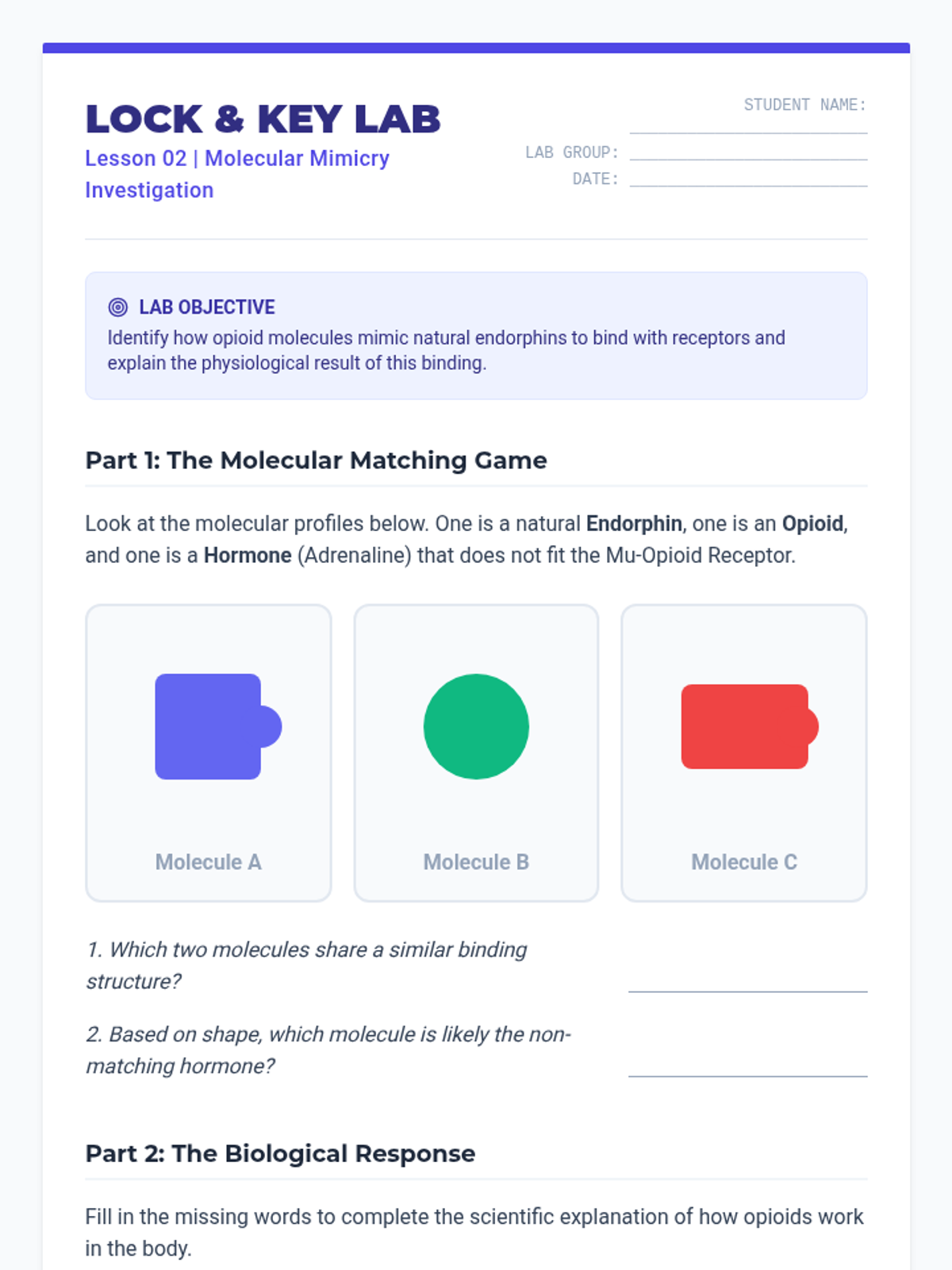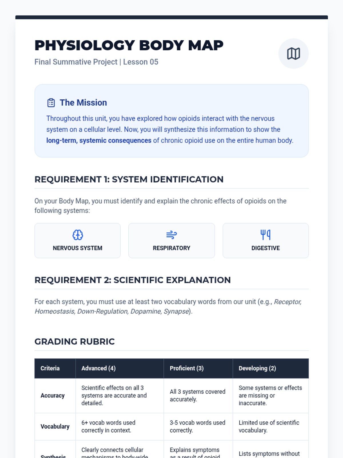 This sequence explores the biological and physiological mechanisms of opioids, focusing on how they interact with the nervous system, disrupt neurotransmission, and lead to dependency through tolerance and withdrawal. Students move from basic brain anatomy to complex systemic effects, concluding with a comprehensive physiological body map.