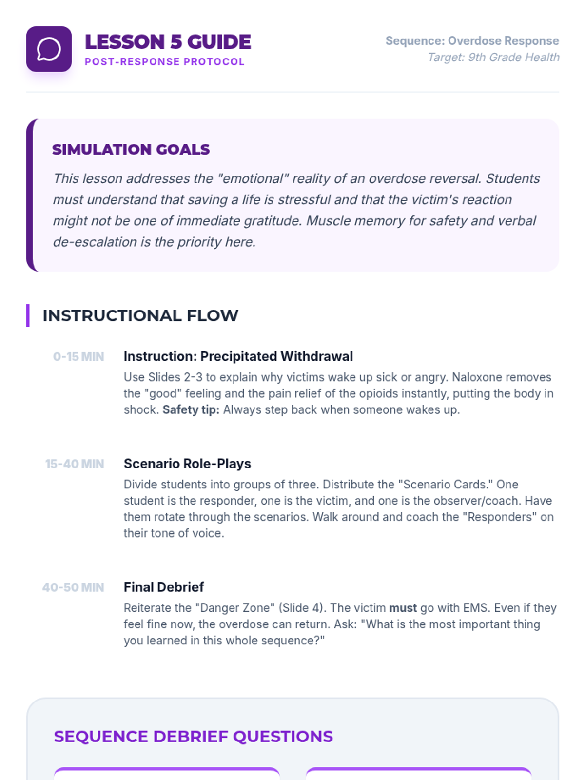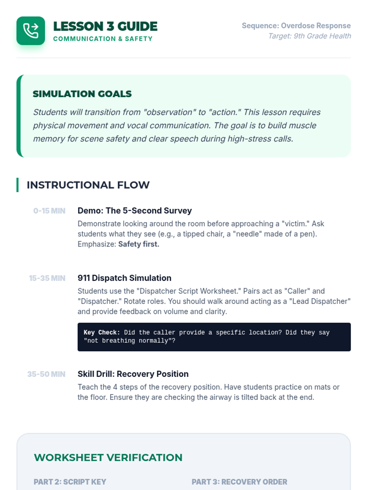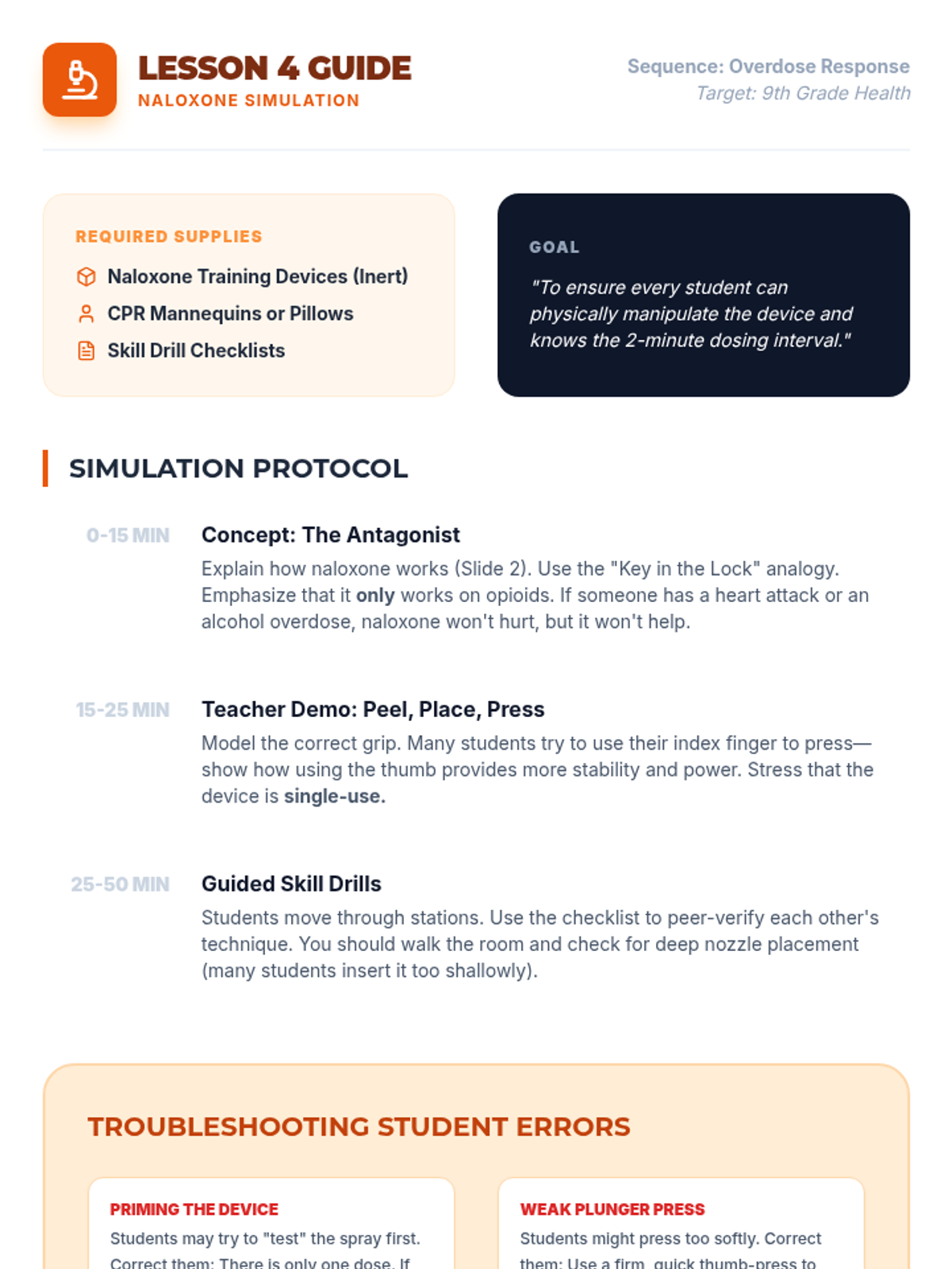 This sequence equips 9th-grade students with the life-saving skills to identify and respond to an opioid overdose. It covers the 'opioid triad' of symptoms, legal protections under Good Samaritan laws, effective 911 communication, and the step-by-step administration of naloxone.