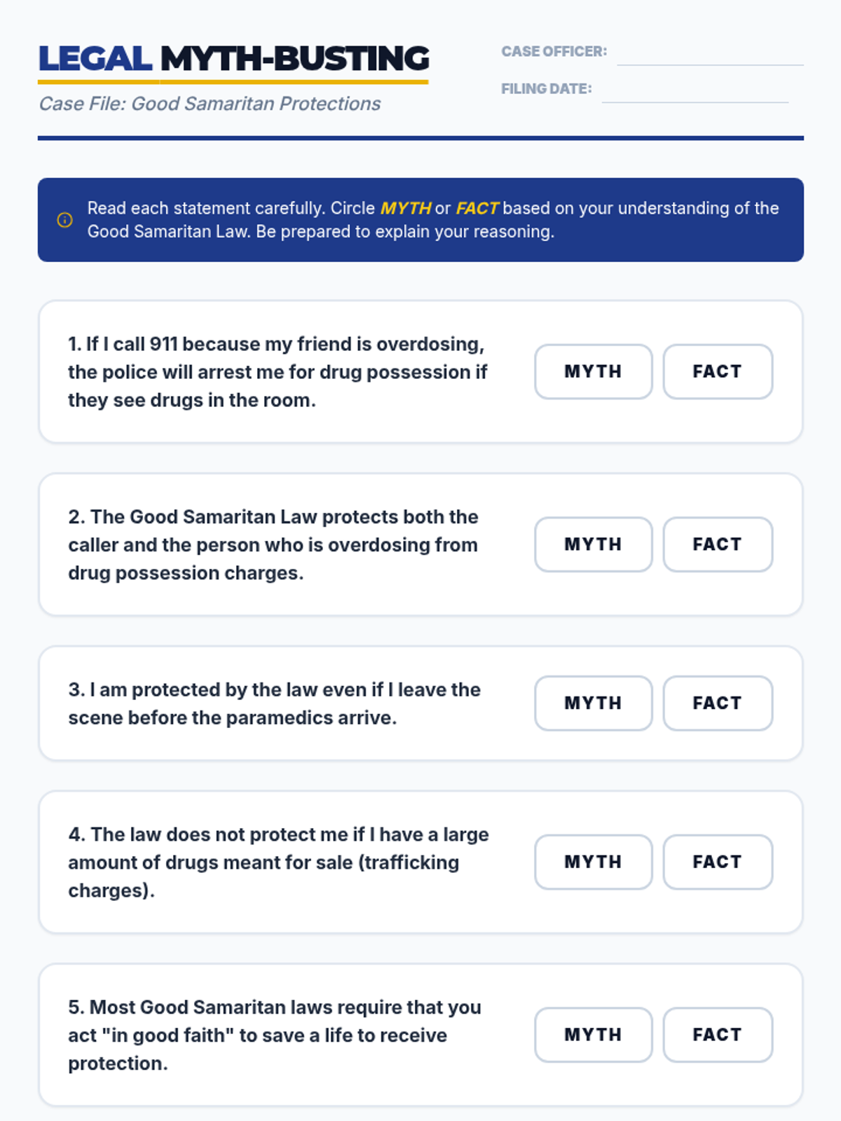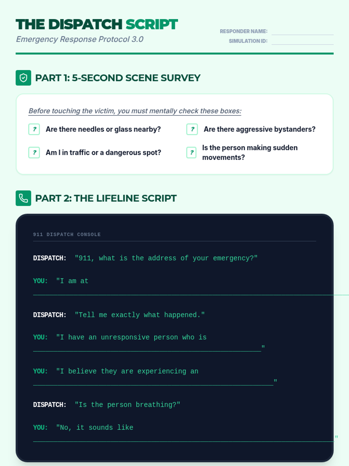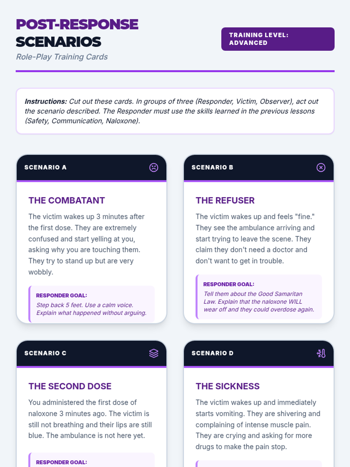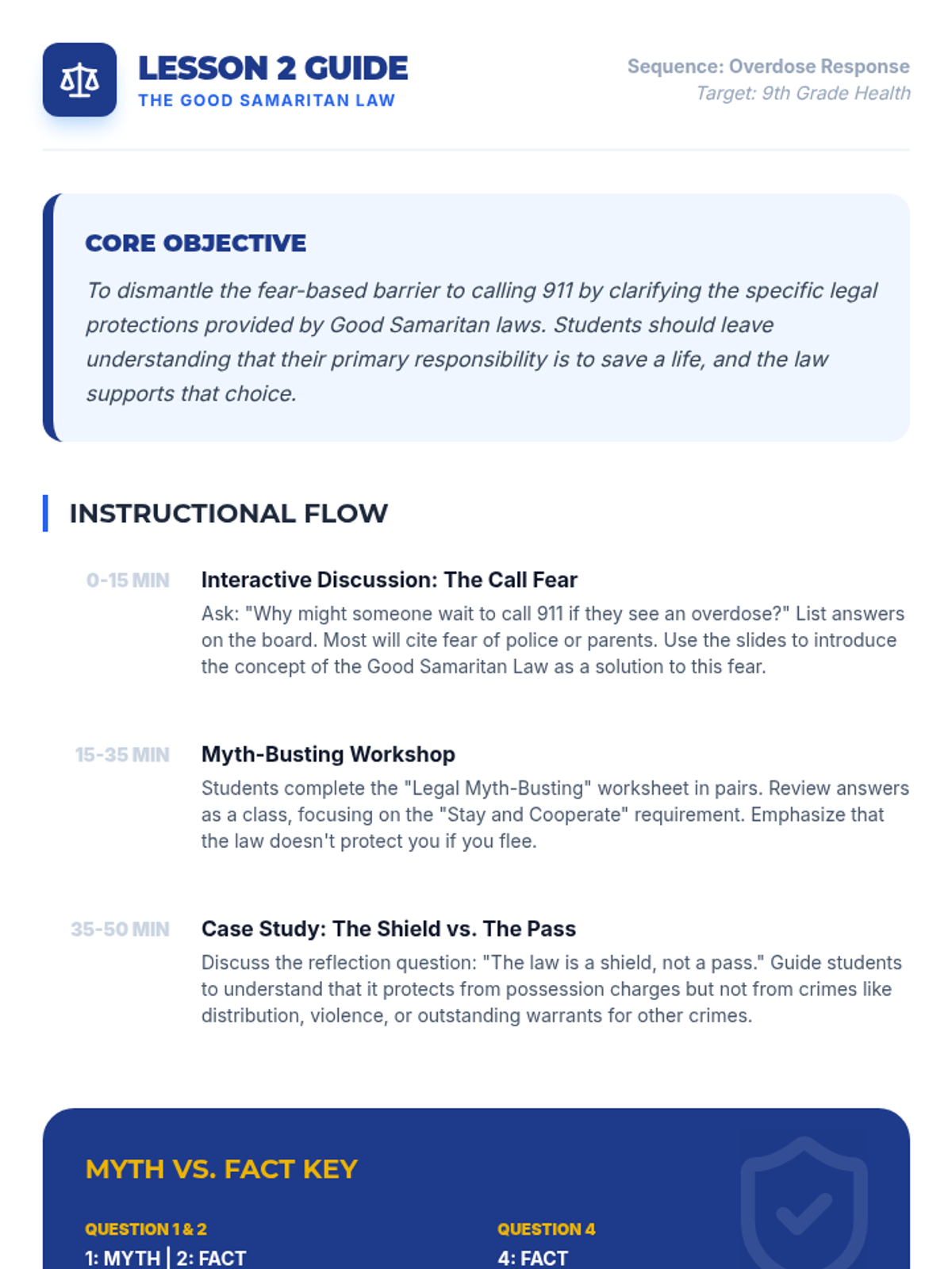 This sequence equips 9th-grade students with the life-saving skills to identify and respond to an opioid overdose. It covers the 'opioid triad' of symptoms, legal protections under Good Samaritan laws, effective 911 communication, and the step-by-step administration of naloxone.