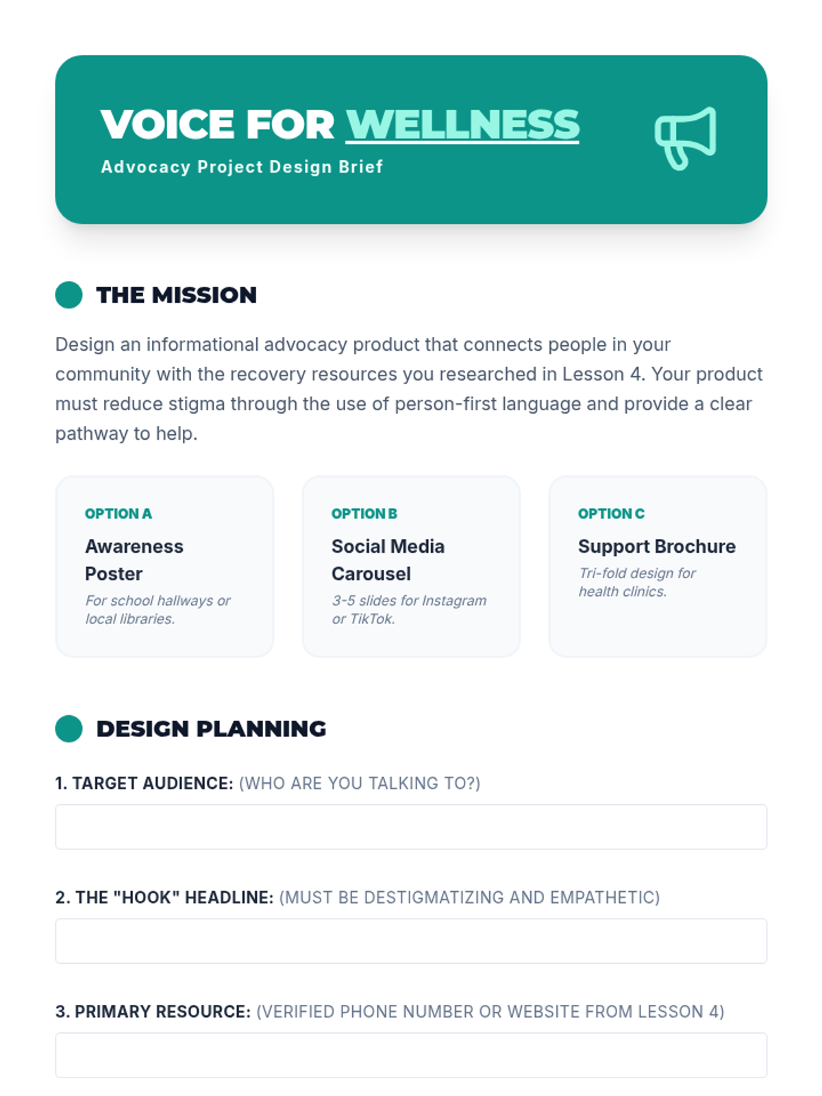 A comprehensive 4-week high school health unit covering mental health, nutrition, substance use, and sexual health. Students analyze health behaviors, influence, and prevention strategies to promote lifelong well-being.