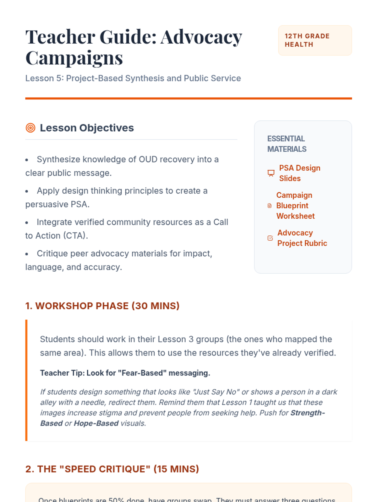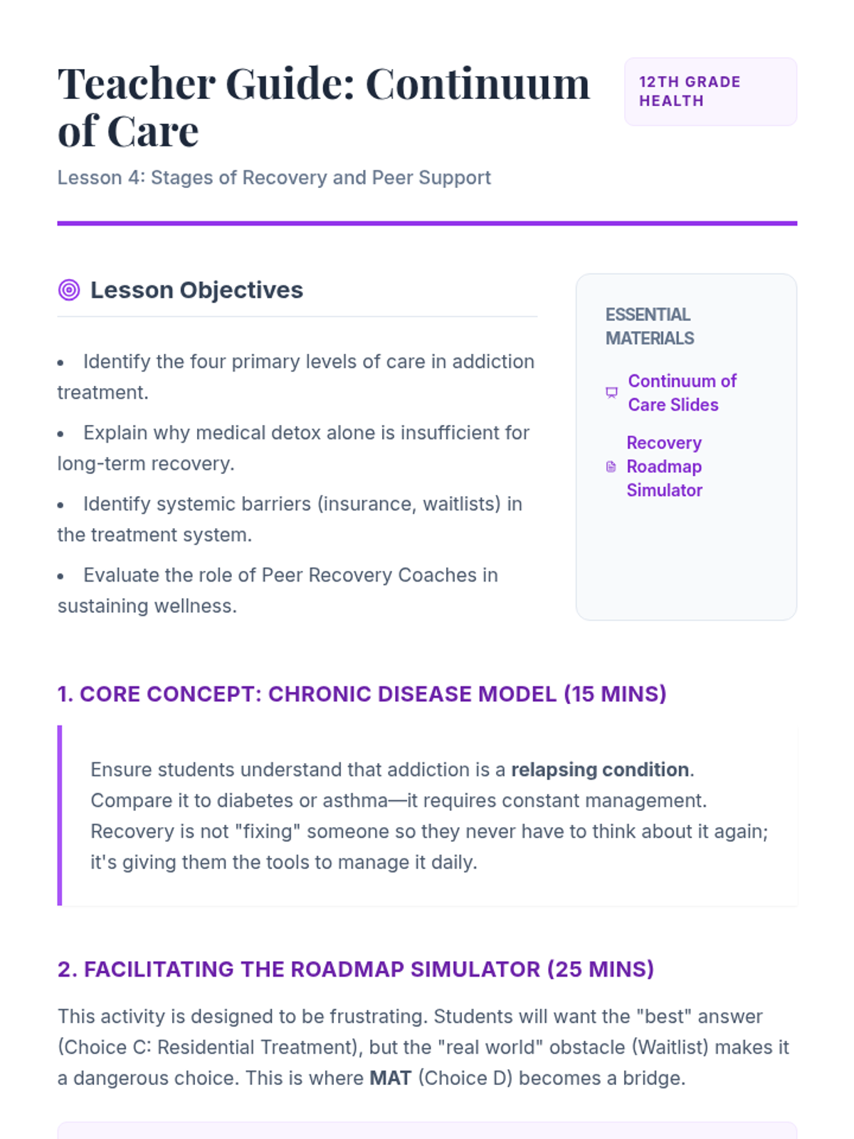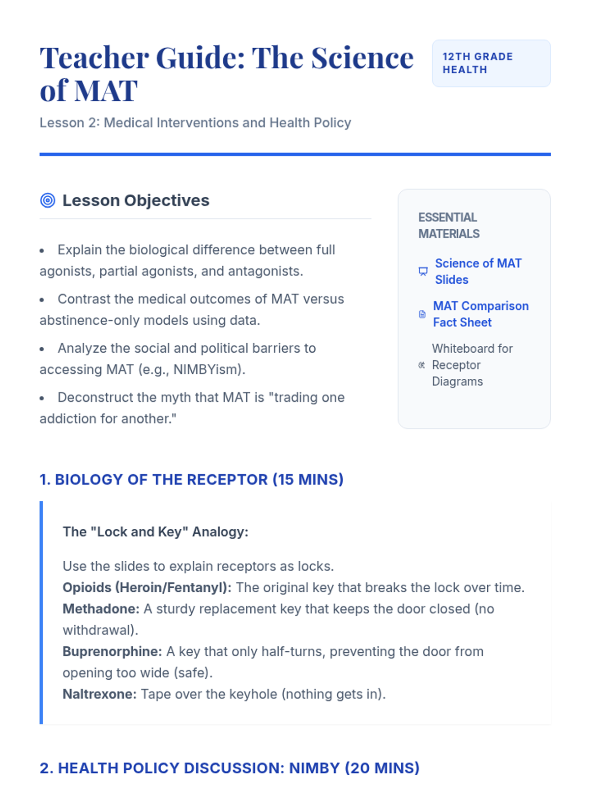 This 12th-grade sequence explores the social and community dimensions of the opioid crisis, focusing on reducing stigma and connecting individuals with recovery resources. Students analyze the impact of language, evaluate medical treatments like MAT, and map local recovery assets to create effective advocacy materials.