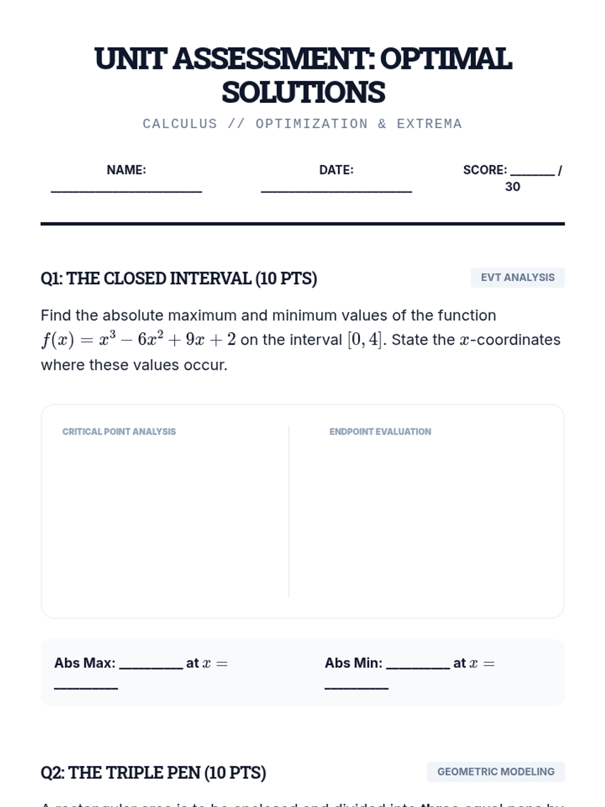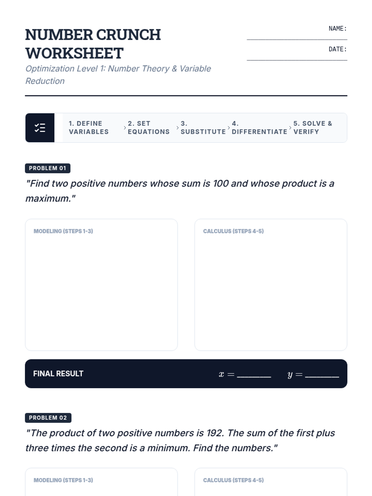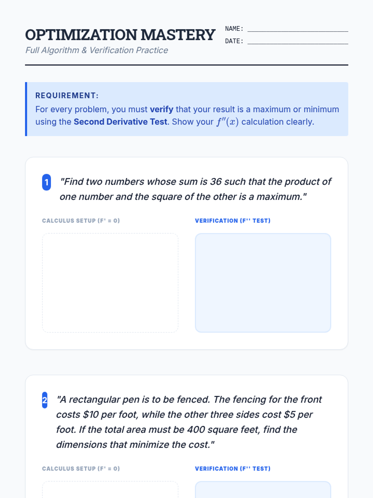 A comprehensive workshop series on optimization in calculus. Students master the Extreme Value Theorem, learn to translate complex word problems into mathematical models, and apply differentiation to find optimal outcomes in number theory and geometric contexts.